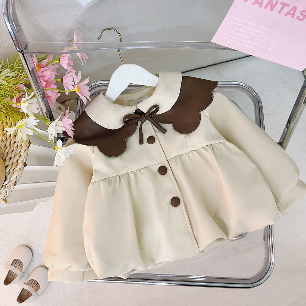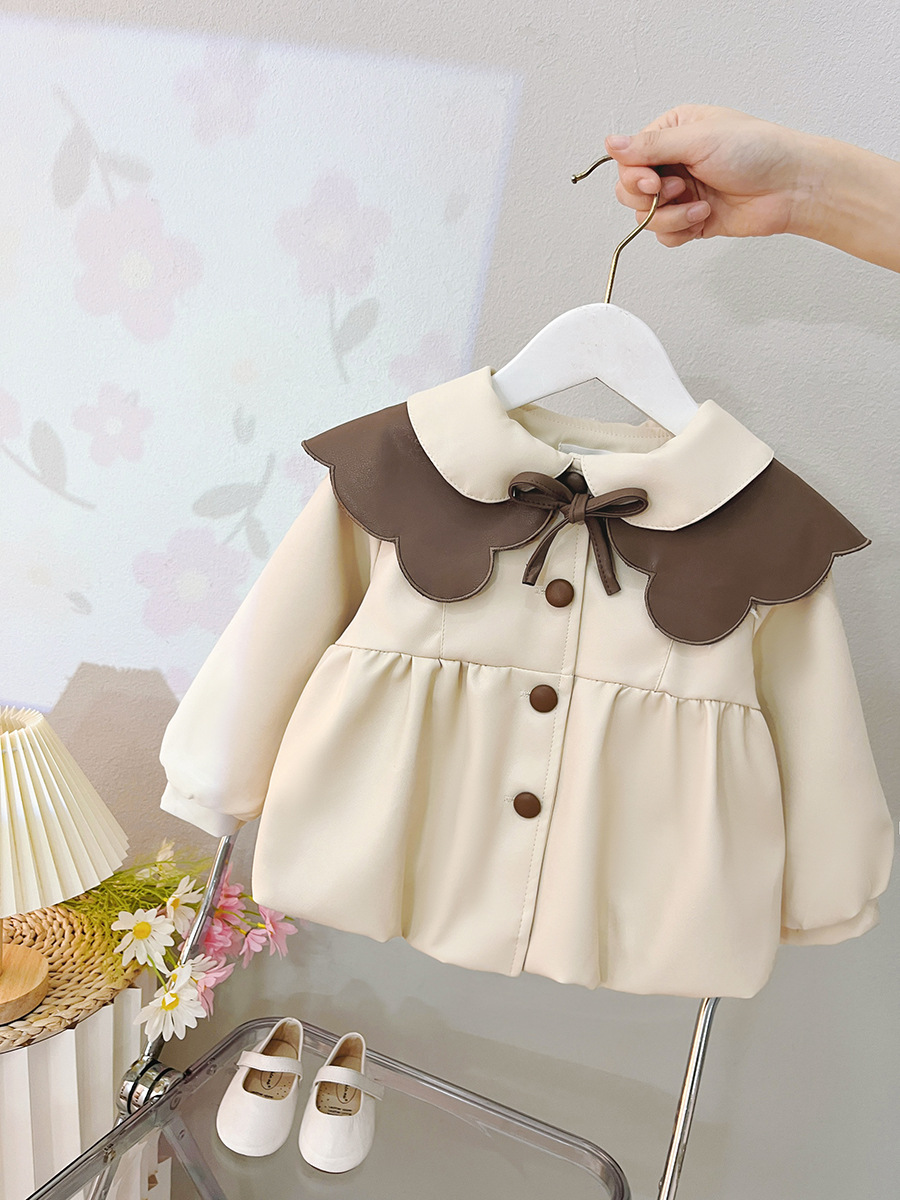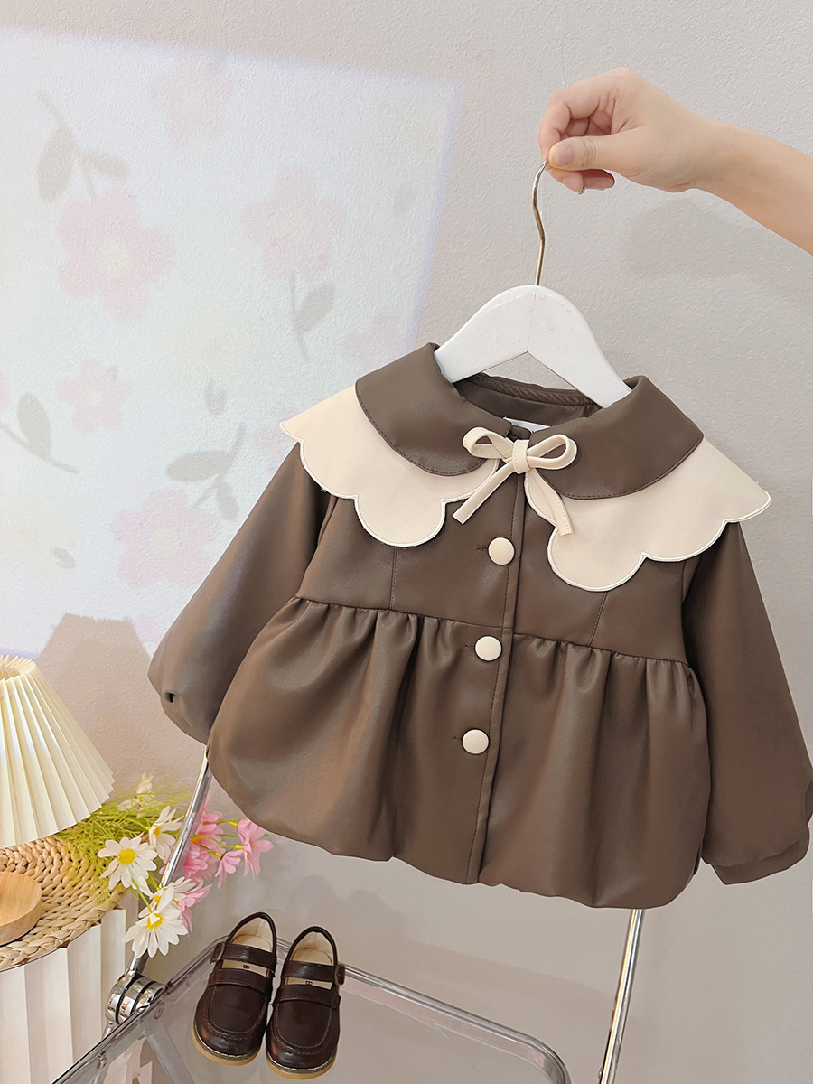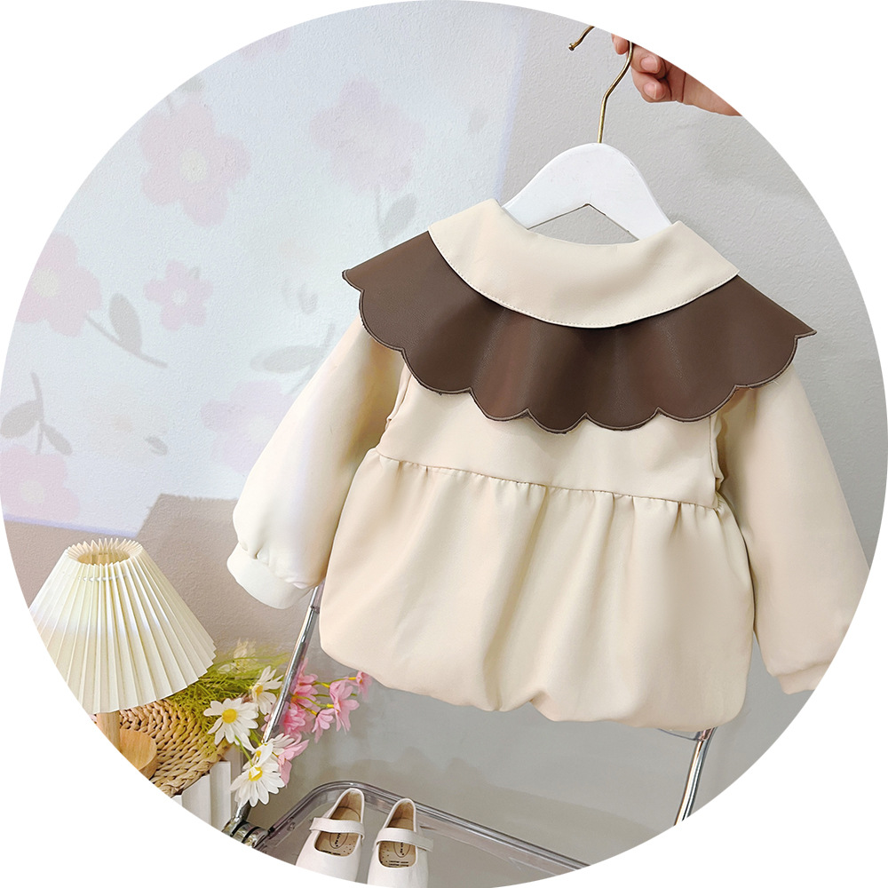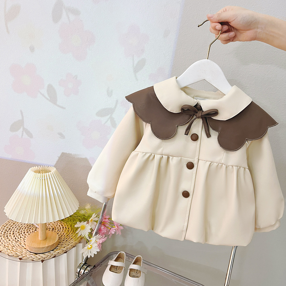 2025 가을 신상 여아 레이스 칼라 솔리드 컬러 가죽 재킷 여자 어린이 얇은 중간 길이 코트 한국 스타일 아우터스토어 가기