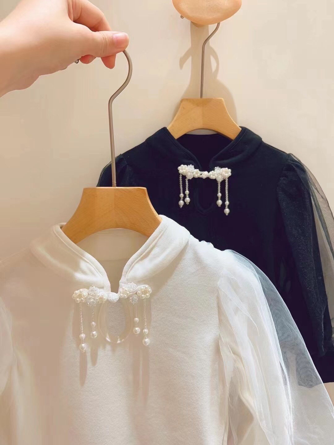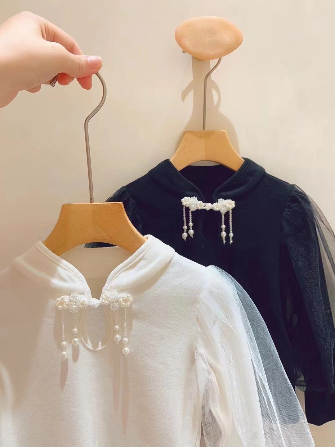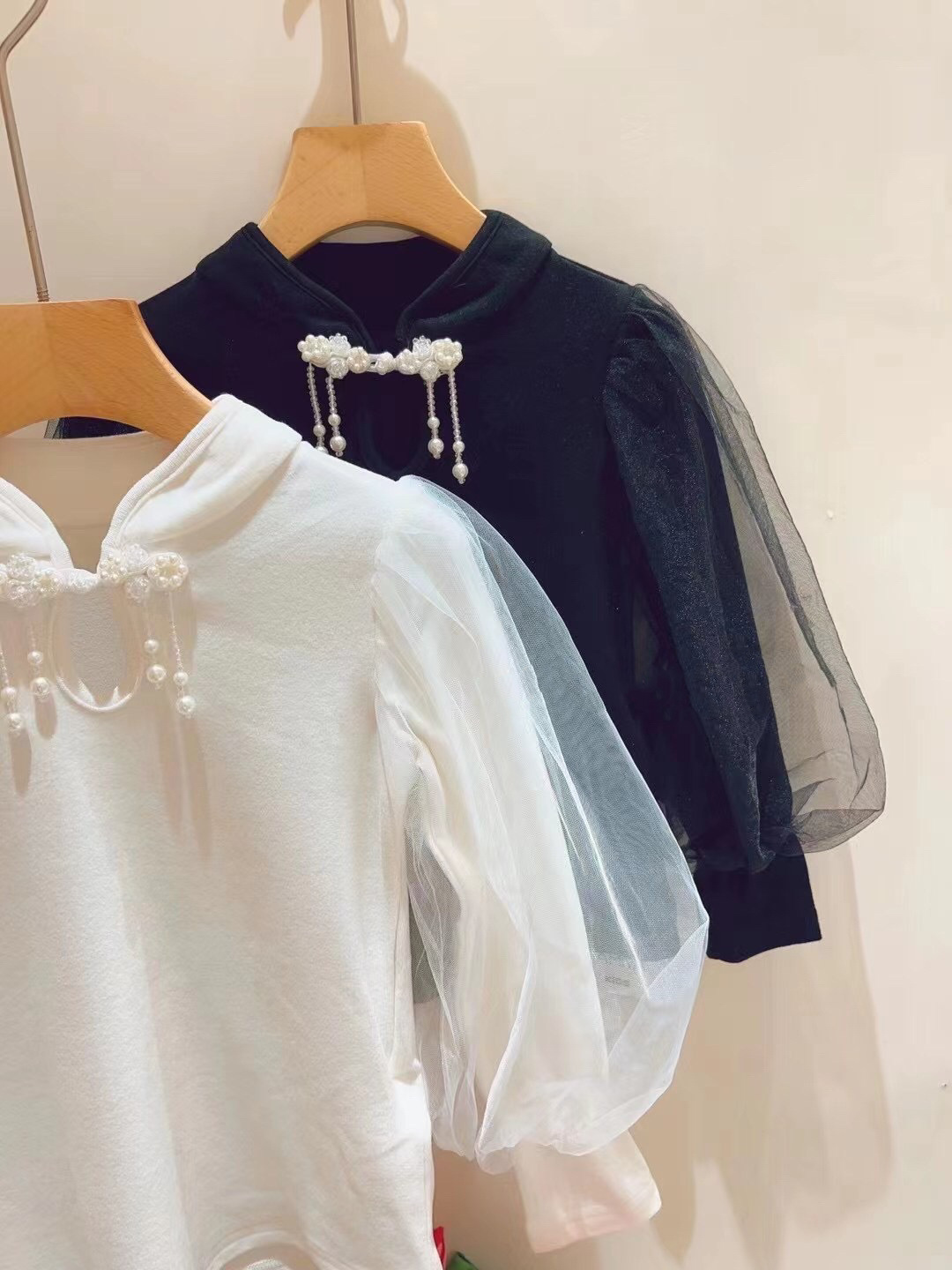 메쉬 버블 슬리브 중국 소녀 바닥 23 년 가을 새로운 진주 버클 슈퍼 소프트 조커 내셔널 스타일 외국 스타일