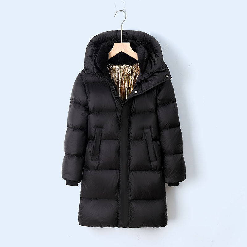 2024 아동용 두꺼운 코트 블랙 메탈릭 중간 길이 따뜻한 코트 부모-자식 겨울 탑 두꺼운스토어 가기