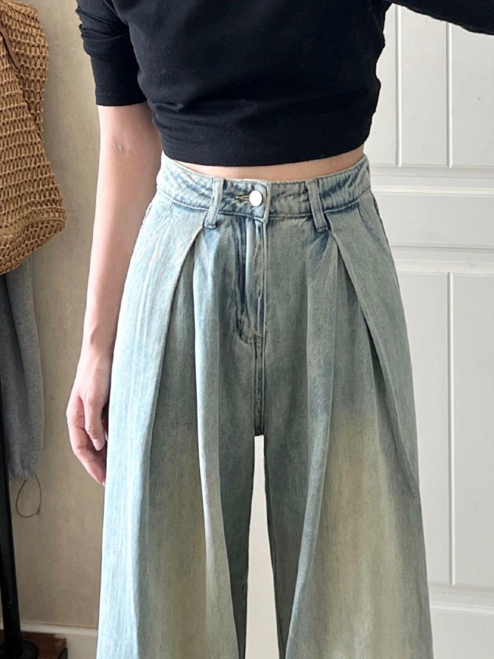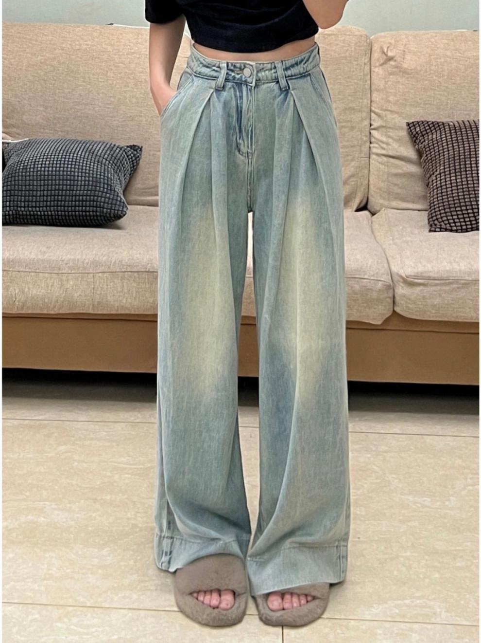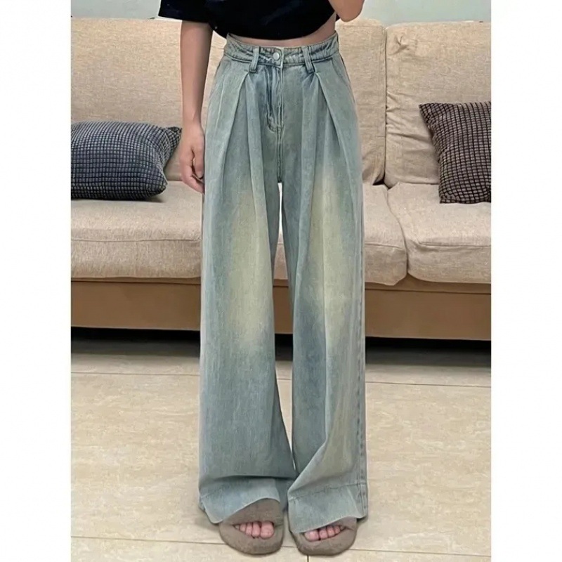 아메리칸 스타일 플리츠 와이드 레그 청바지 여성용 2023 새로운 디자인 센스 느슨한 드레이핑 감각 슬리밍 하이 웨이스트 스트레이트 플로어 팬츠스토어 가기