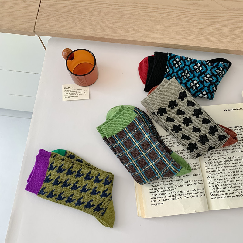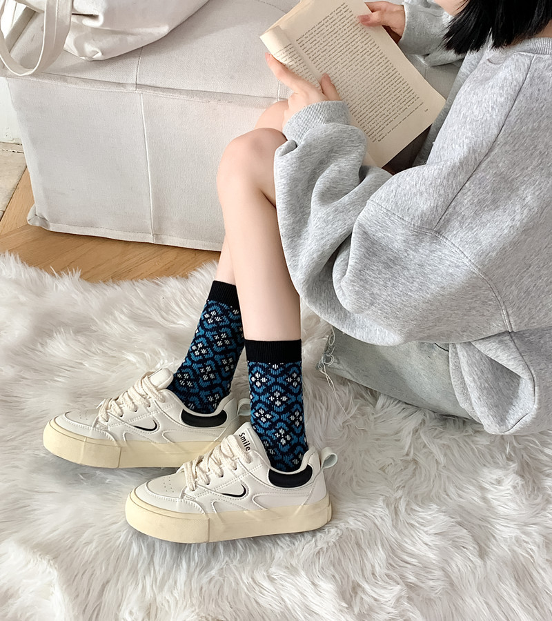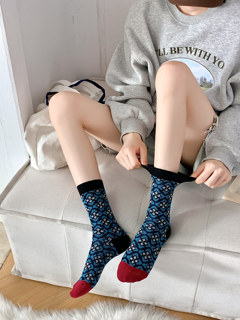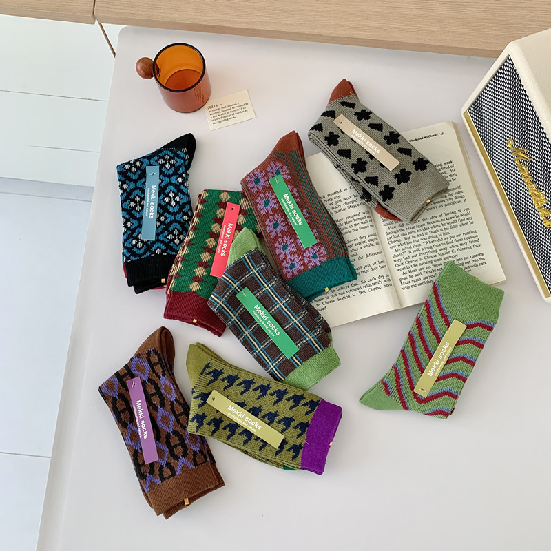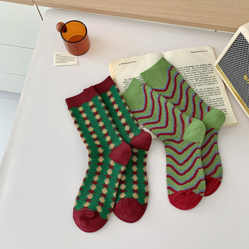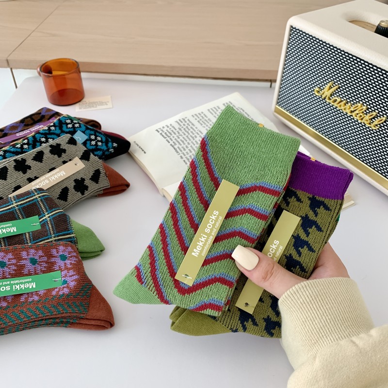 레트로 더블 니들 더블 로드 다이아몬드 웨이브 스트라이프 여성용 중간 길이 양말 일본식 예술적 가을/겨울 쌓인 양말 영국 스타일 면 양말스토어 가기