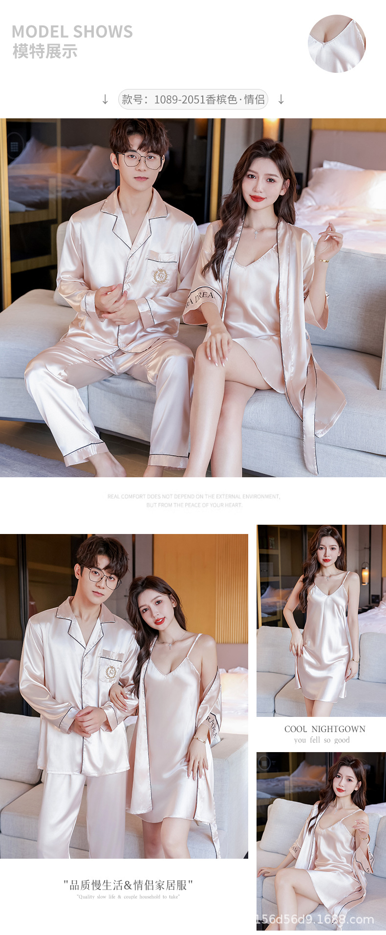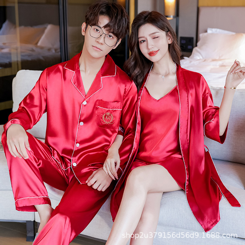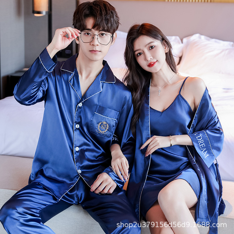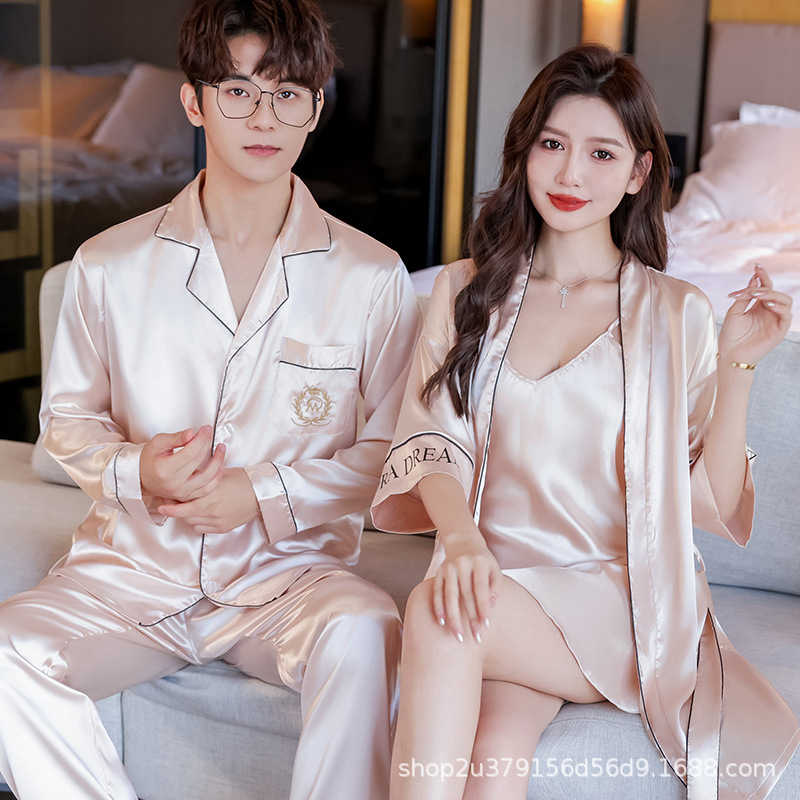 커플 잠옷 여자의 여름 아이스 실크 긴 소매 2023 새로운 세트 실크 인터넷 인기있는 얇은 남자의 가정 의류스토어 가기