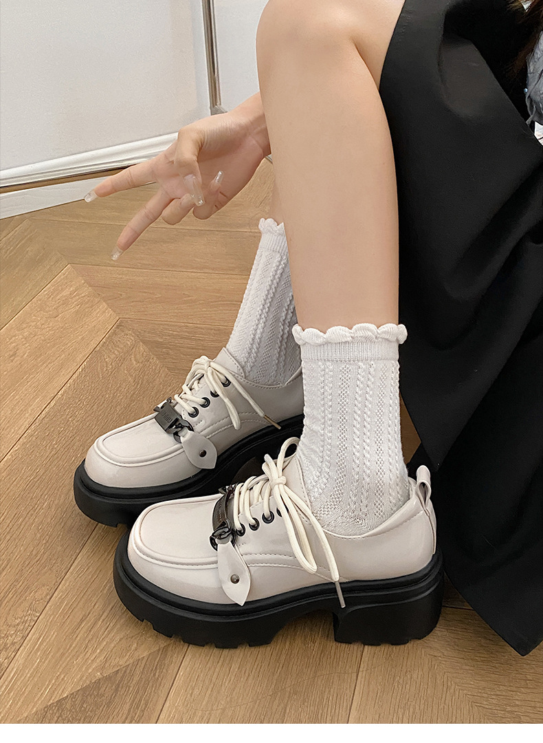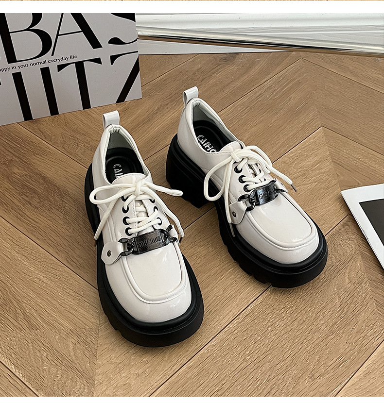 블랙 브리티쉬 스타일 고층 두꺼운 단독 가죽 신발 여성용 2023 년 여름 두꺼운 굽 라운드 헤드 모든 매치 레이스업 싱글 슈즈