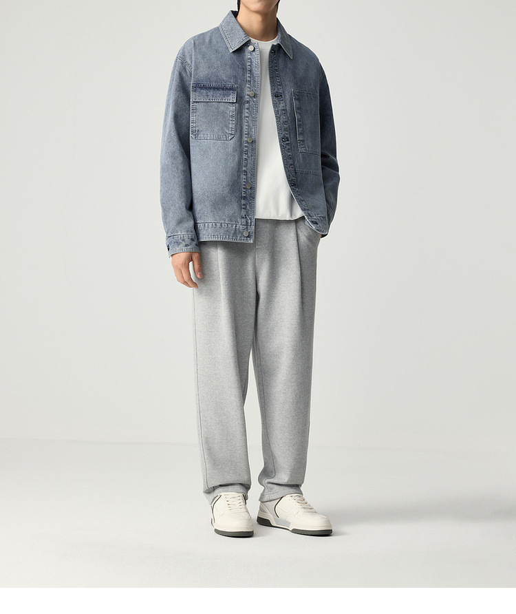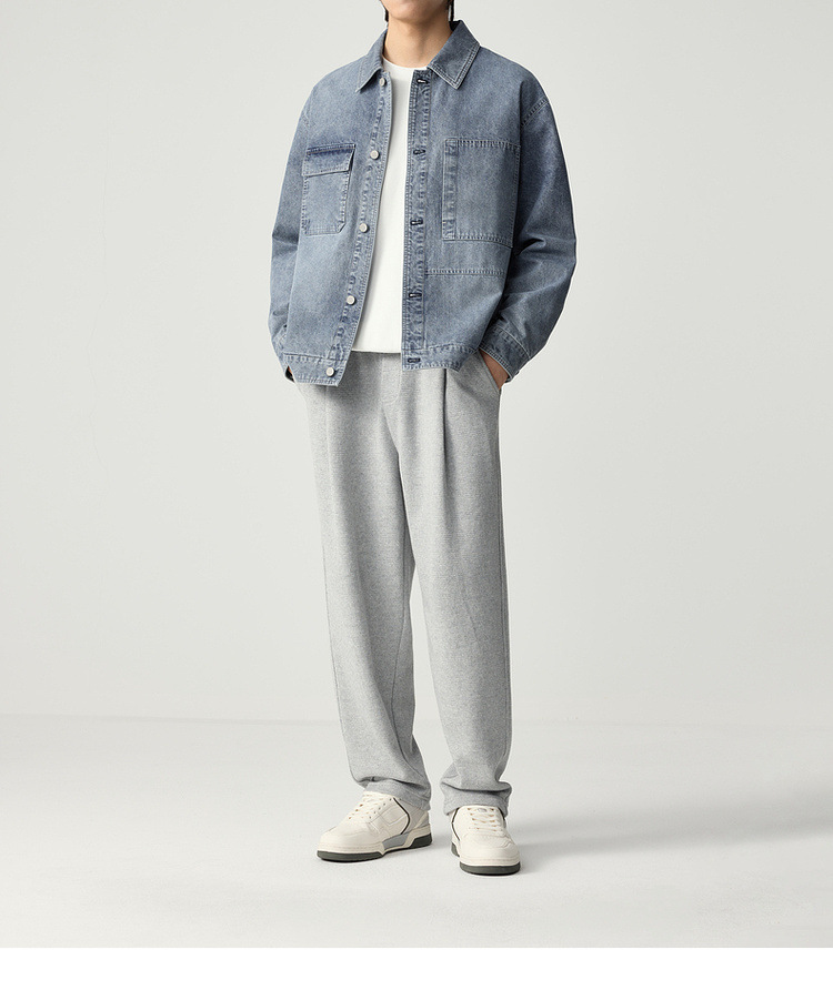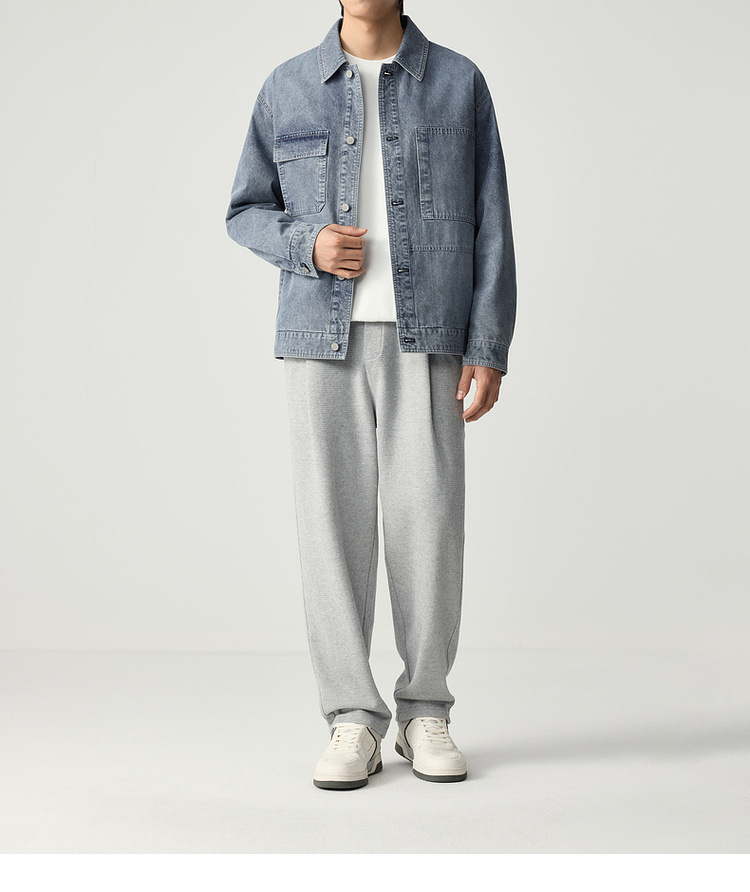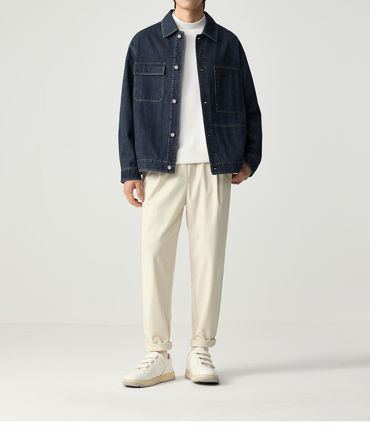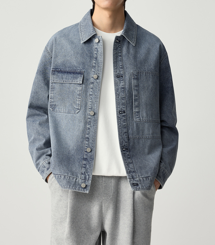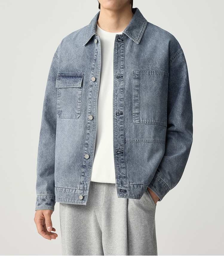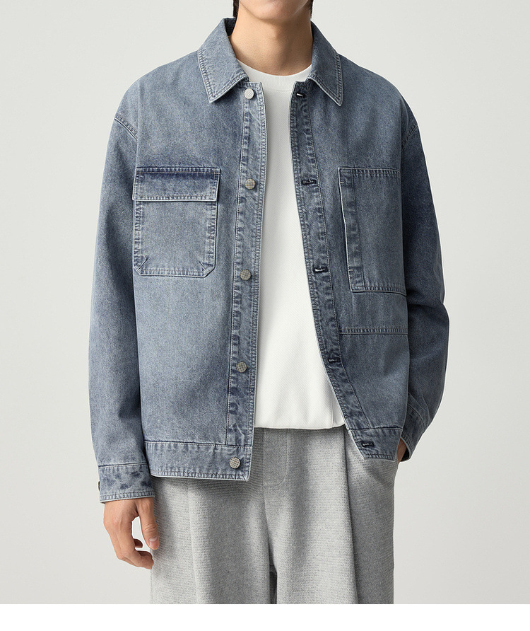 Momaike 심플 탑스티치 데님 재킷 남성 2025 가을 스타일 포켓 장식 라펠 남성 재킷 80855.