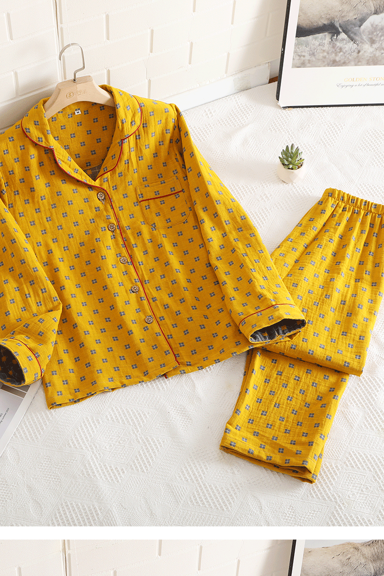 새로운 면 더블 레이어 원사 잠옷 가정 의류 여자의 긴팔 바지 면 자카드 통기성 부드러운 가정 의류 세트