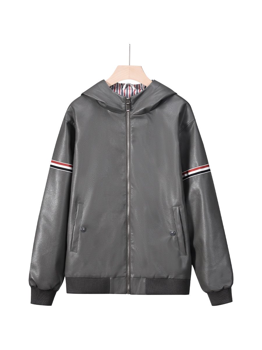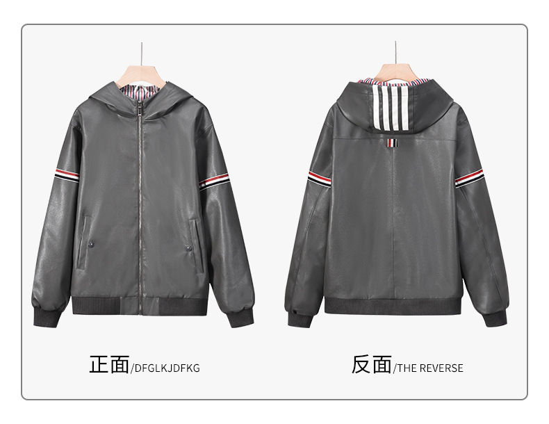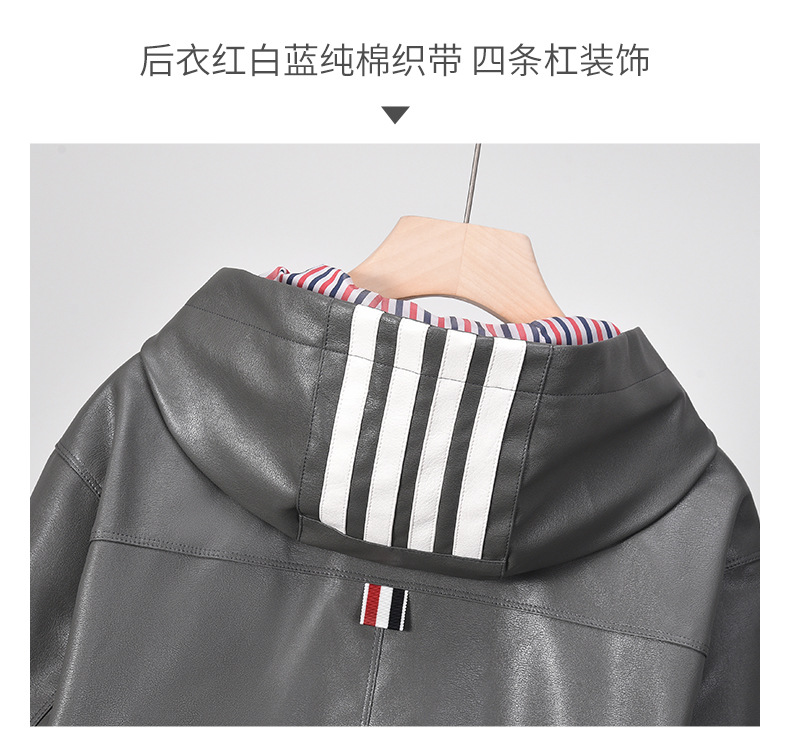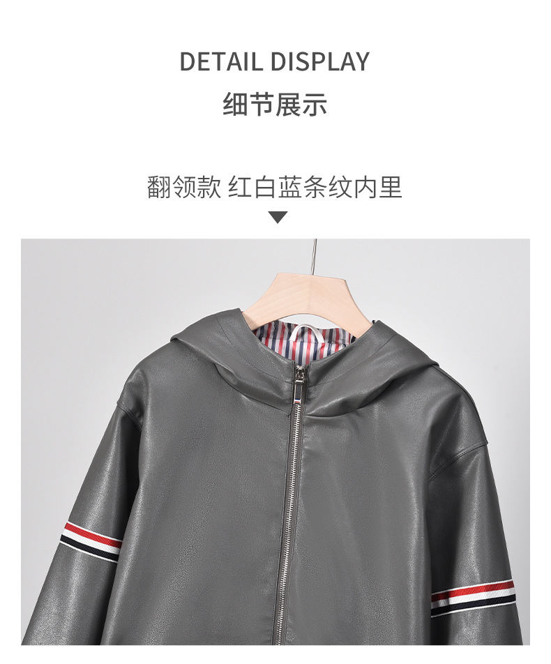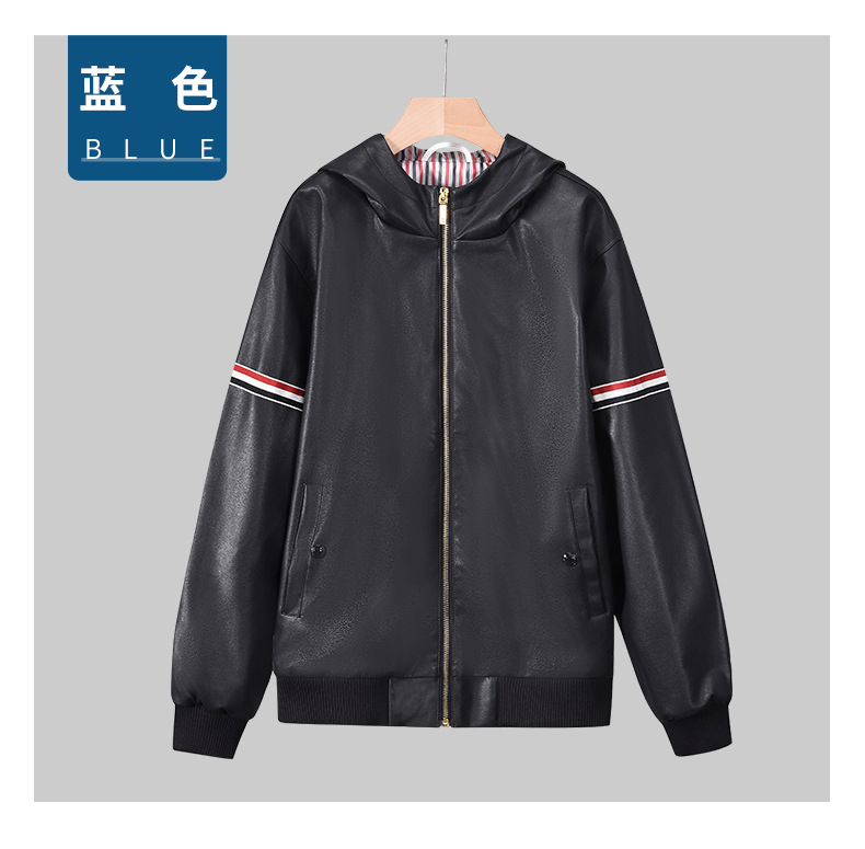 TB BROWIN 신형 가죽 남성 후드 PU 가죽 코트 레드 화이트 블루 스트라이프 가죽 스트리트 패션 재킷스토어 가기
