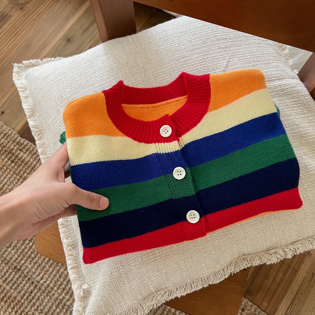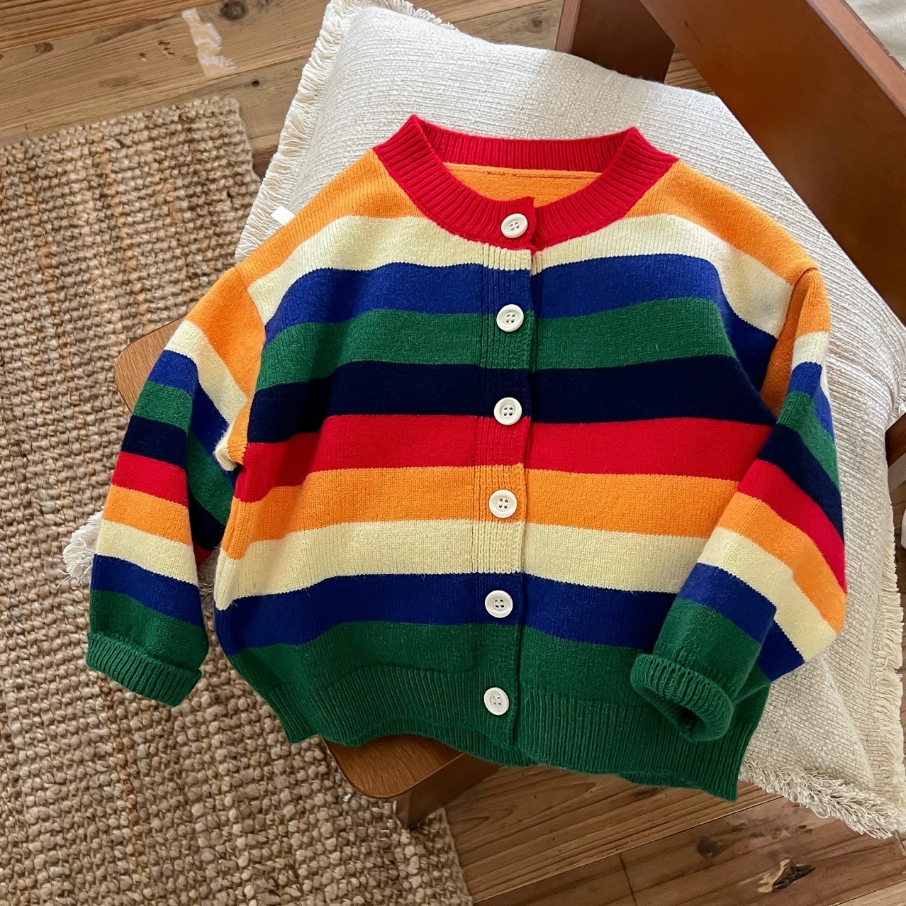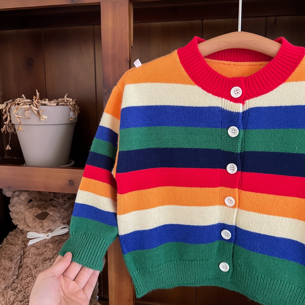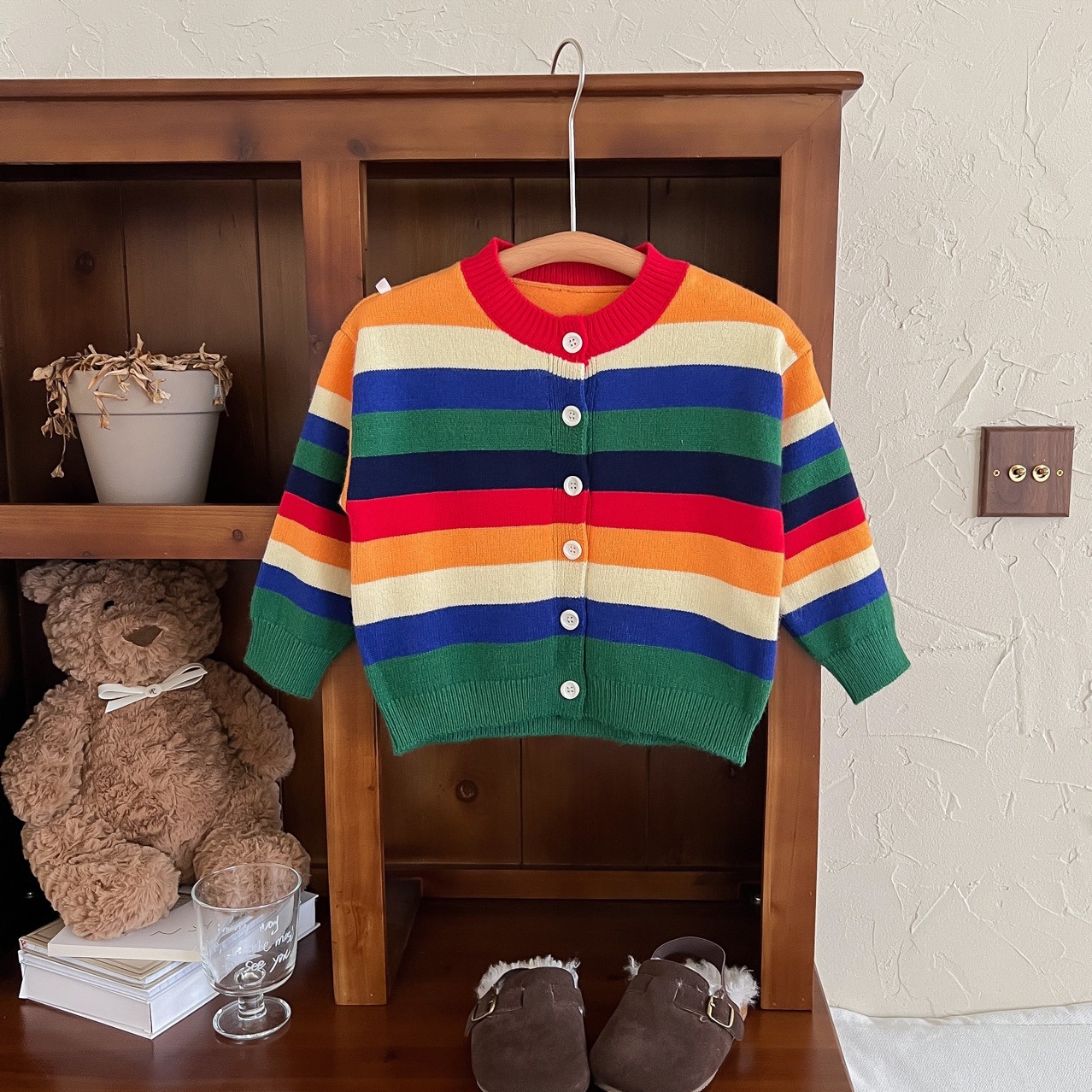 아동 의류 스웨터 카디건 소년 2024 가을 새로운 스타일 중소 어린이 긴팔 니트 탑 레인보우 스트라이프 카디건