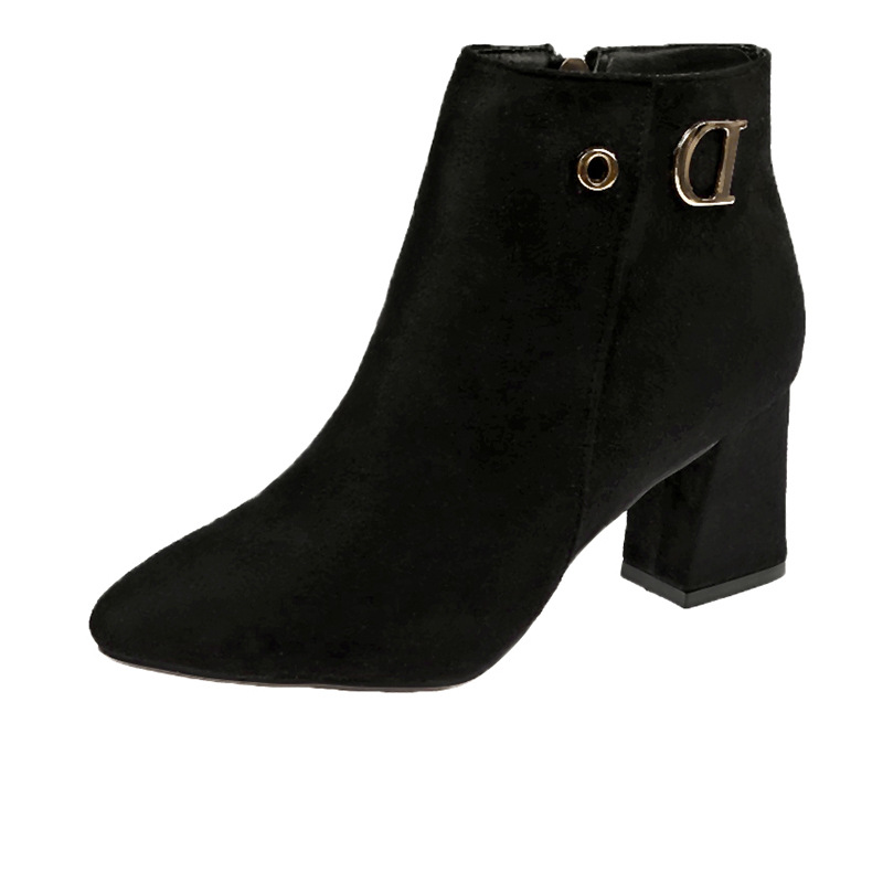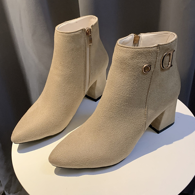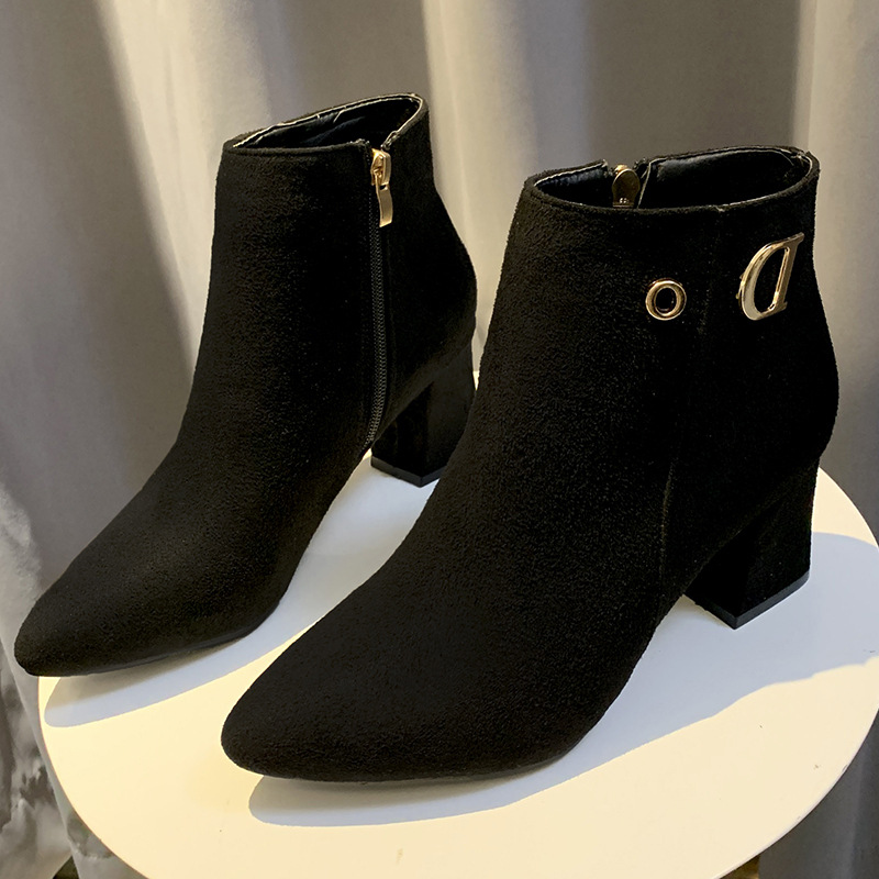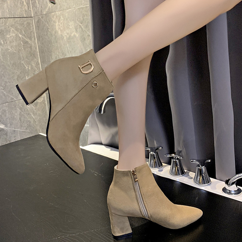 크로스 보더 가을과 겨울 2023 유럽과 미국 새로운 두꺼운 굽 뾰족한 스웨이드 하이힐 크로스 보더 플러스 사이즈 사이드 지퍼 여성용 발목 부츠스토어 가기