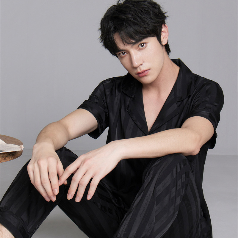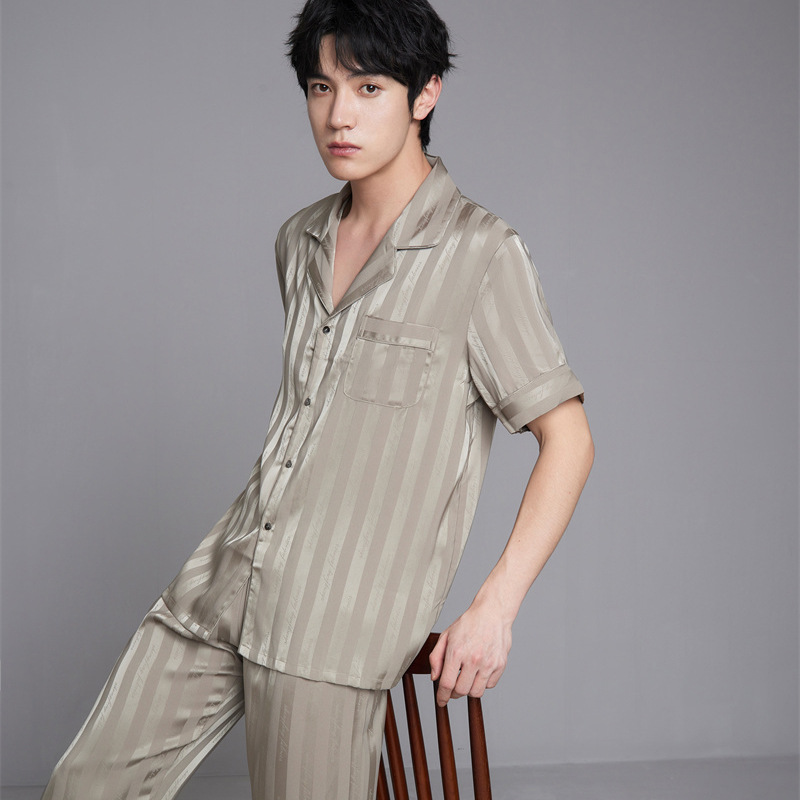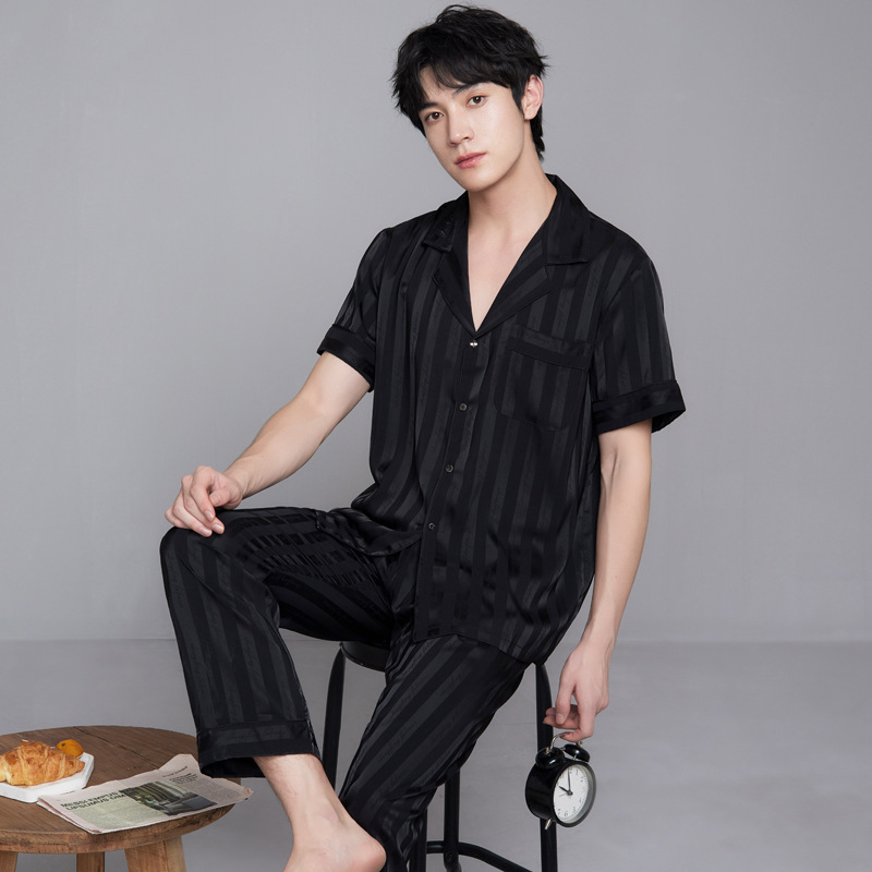 남성용 아이스 실크 잠옷 2025 가을 겨울 신상품 대형 사이즈 반팔 세트 봄 여름 외출용 스트라이프 카라 홈웨어