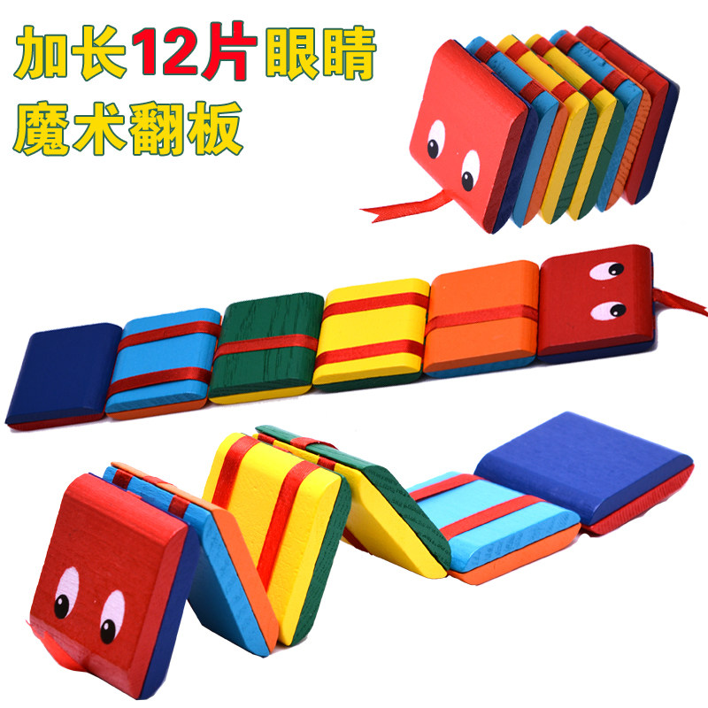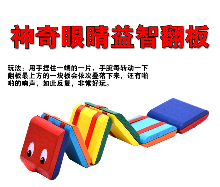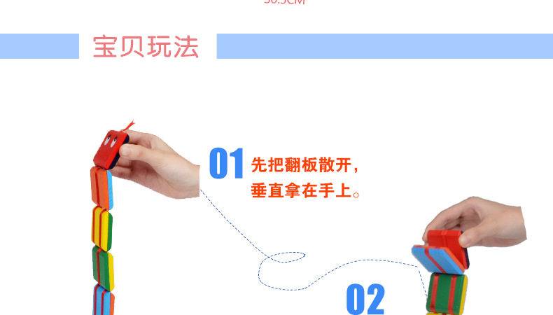 玩法:用手捏住一端的一片,手腕每转动一下,翻板最上方的一块板会依次叠落下来,还有啪啪的响声,如此反复,很好玩的。
