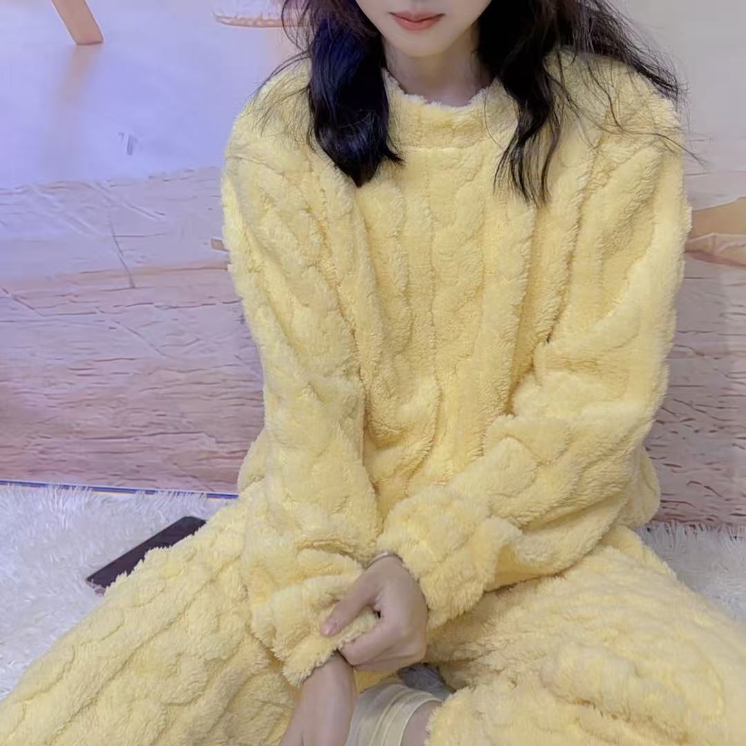 겨울 새로운 기모 두꺼운 가정 의류 여자의 겨울 산호 양털 요정 자카드 따뜻한 바지 느슨한 트위스트 세트