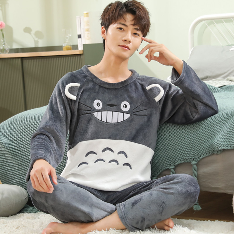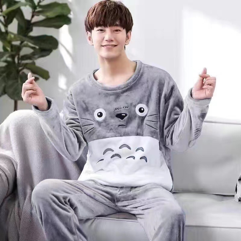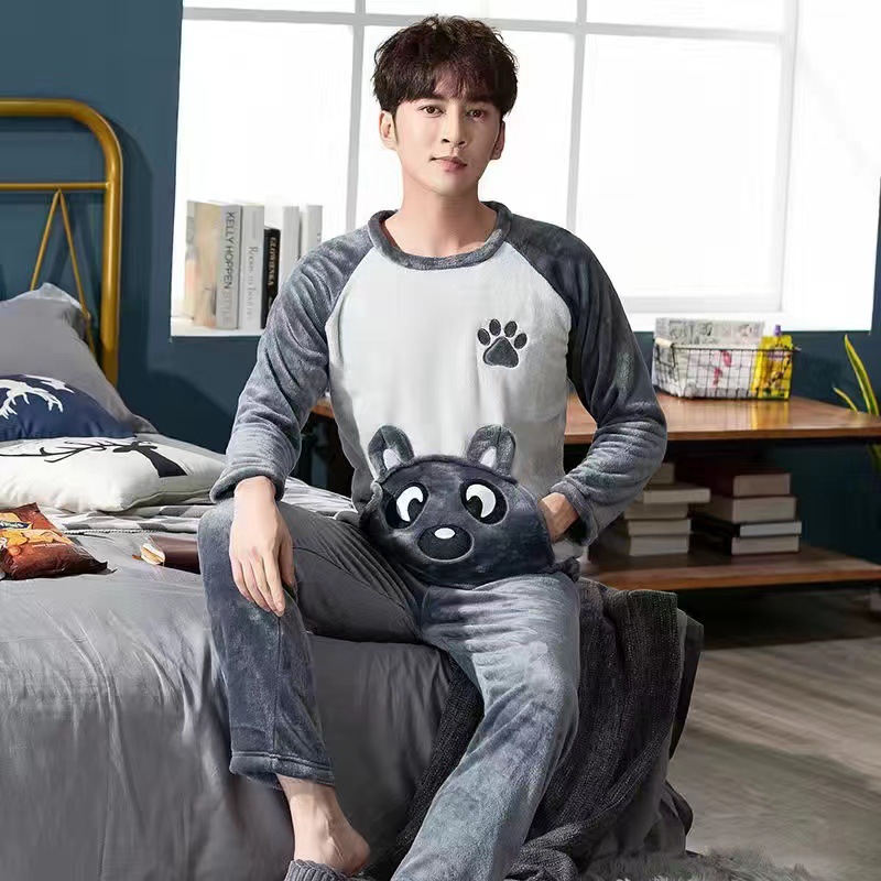 남자를위한 가을과 겨울 플란넬 잠옷 한국 얇은 기모 긴 소매 만화 남성 산호 양털 홈 의류 세트스토어 가기