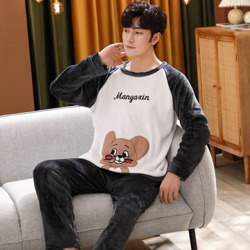 남자를위한 가을과 겨울 플란넬 잠옷 한국 얇은 기모 긴 소매 만화 남성 산호 양털 홈 의류 세트