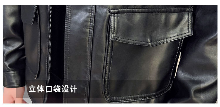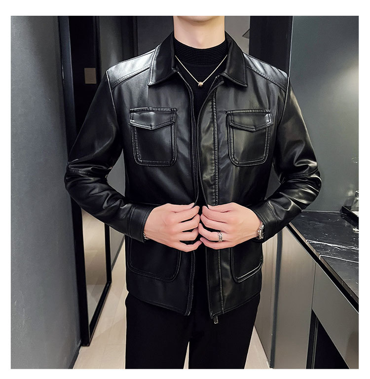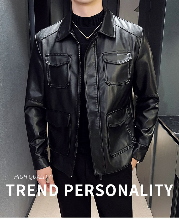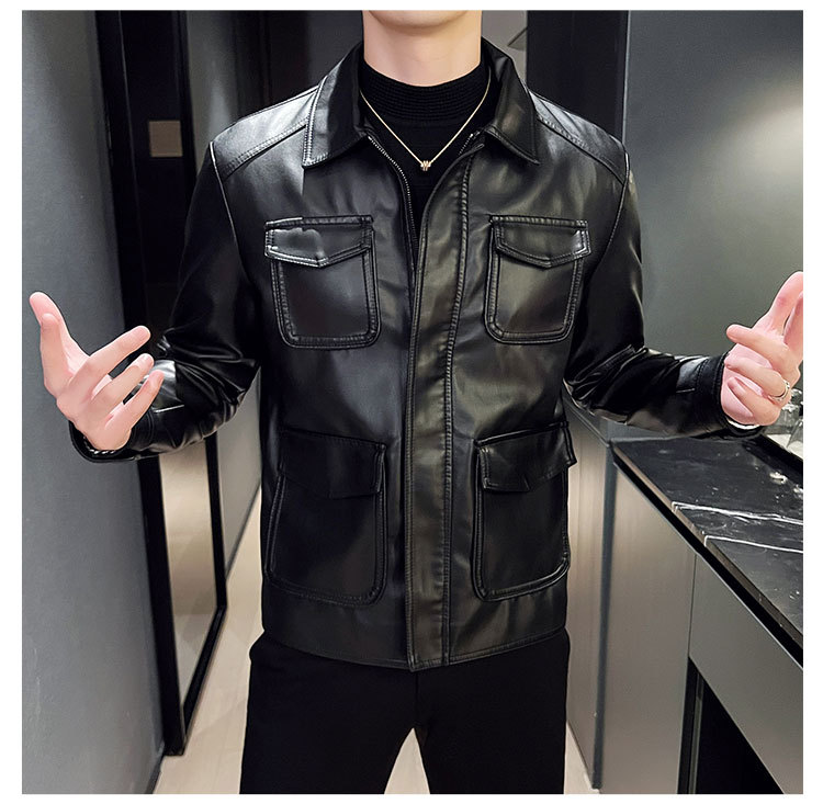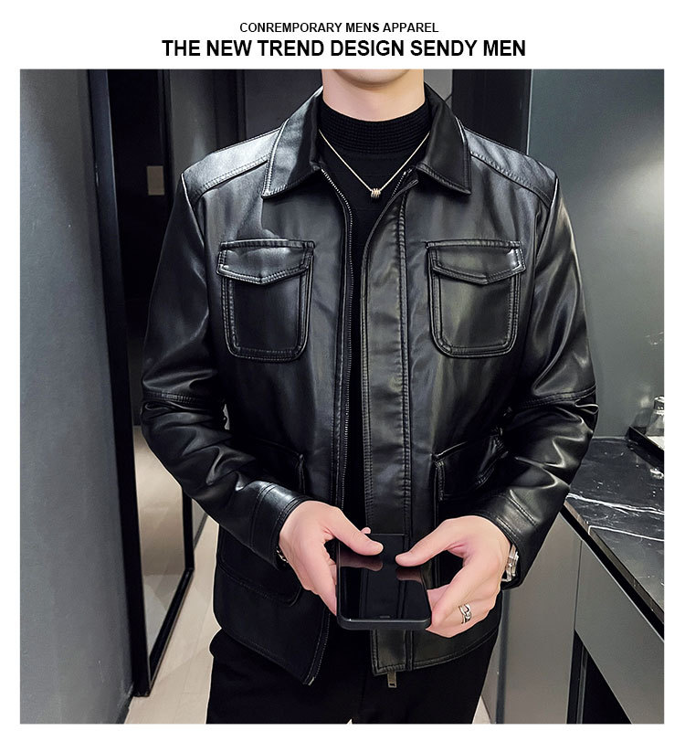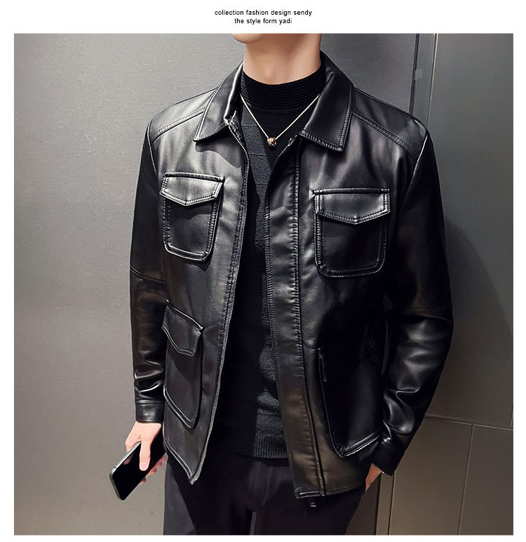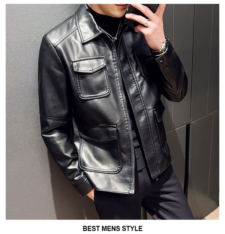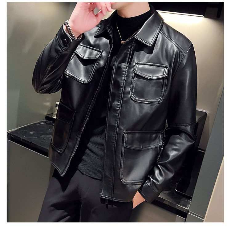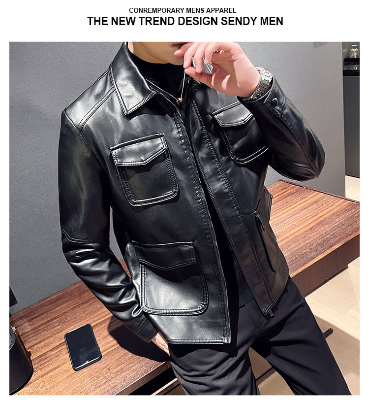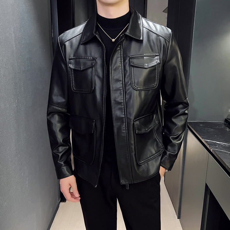남성용 멀티 포켓 캐주얼 가죽 자켓 2023 새로운 유럽 및 미국 단색 가죽 자켓 남성용 가을 자켓 옷깃 자전거 의류스토어 가기