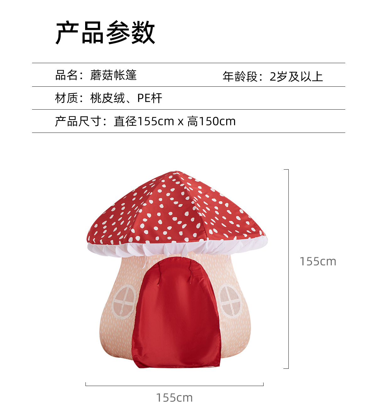 本链接蘑菇帐篷为普惠款,结构和大小跟经典款接近,杆子直径为12mm,面料为桃皮绒,相比经典款降低了一些稳定性和面料厚度,更加经济实惠,如对品质要求高的顾客可移步经典款链接。