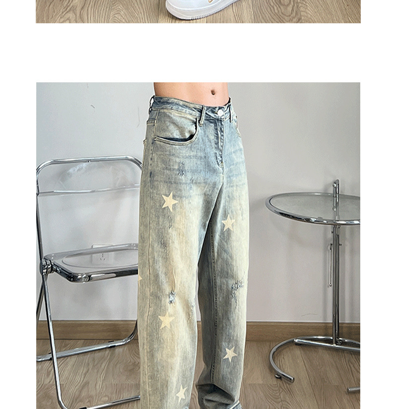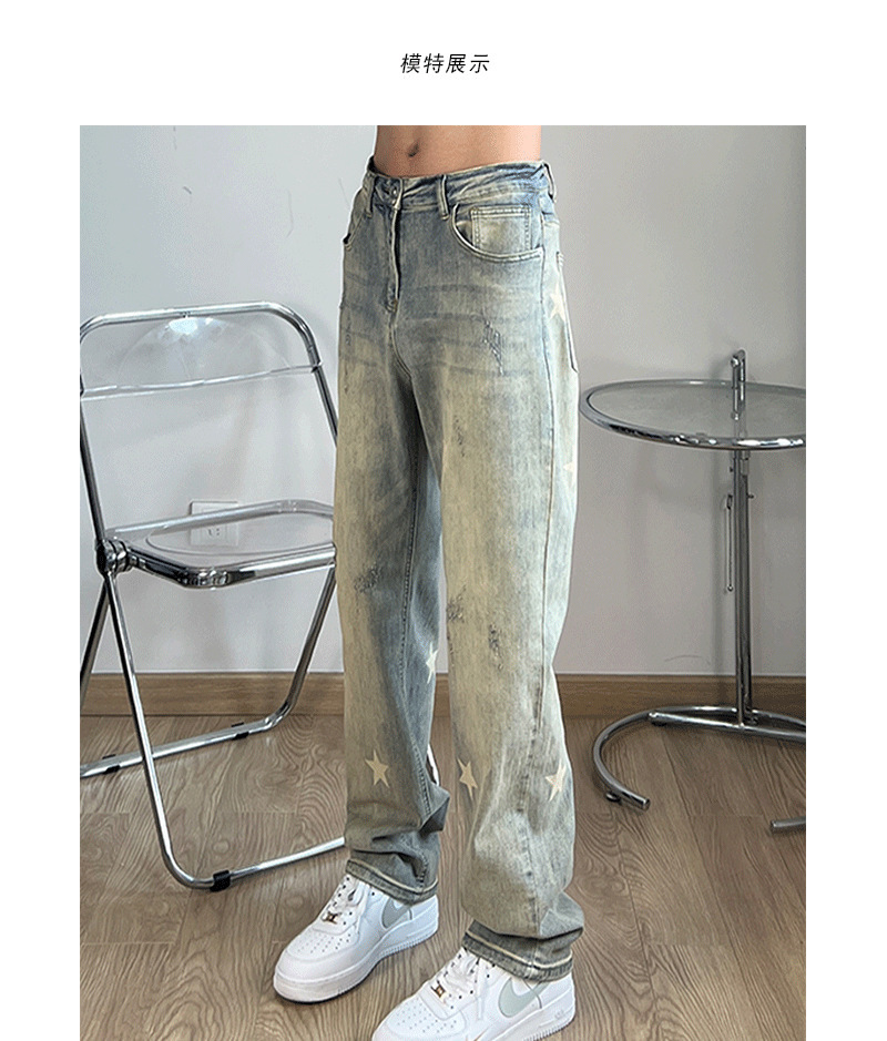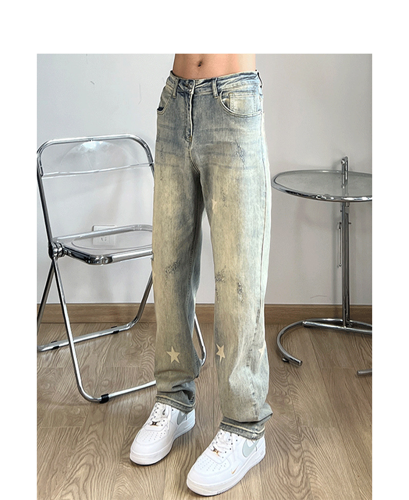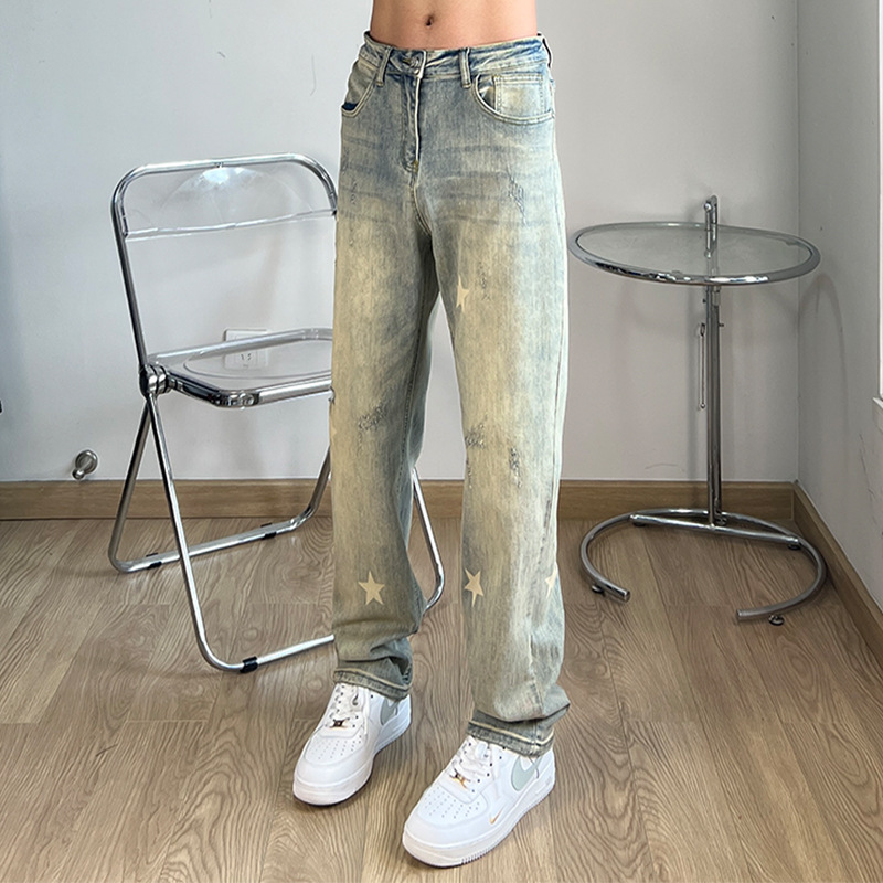 세련된 스타 프린트 옐로우 머드 워싱 올드 청바지 남성용 아메리칸 스타일 하이 스트리트 슬림 룩 스트레이트 모든 매치 트렌디 한 롱 팬츠스토어 가기
