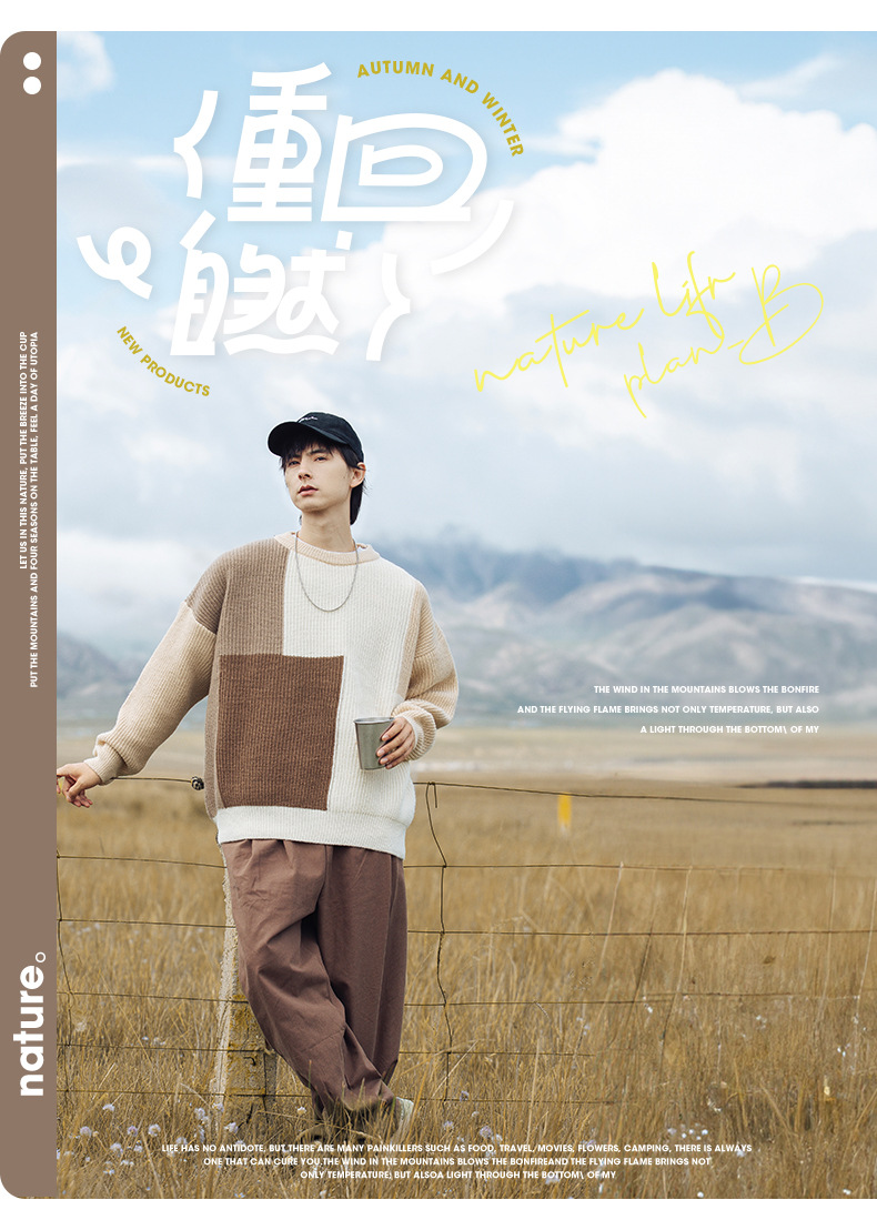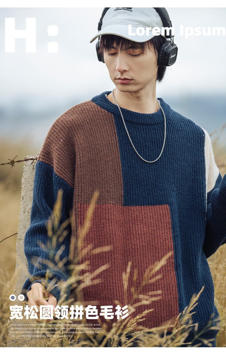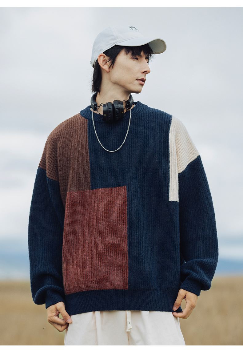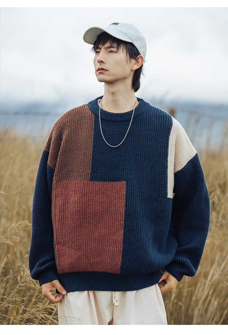 컬러 블록 스플라이싱 디자인 스웨터 남성 2024 가을 겨울 신상 두꺼운 니트 질감 라운드 넥 스웨터 재킷스토어 가기