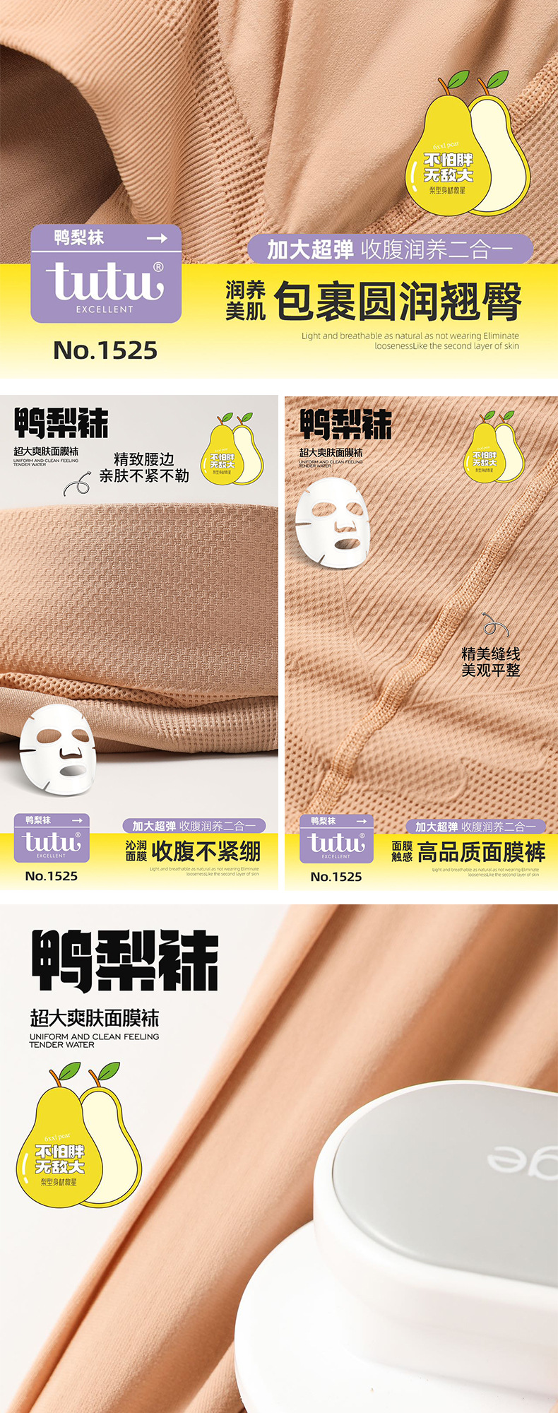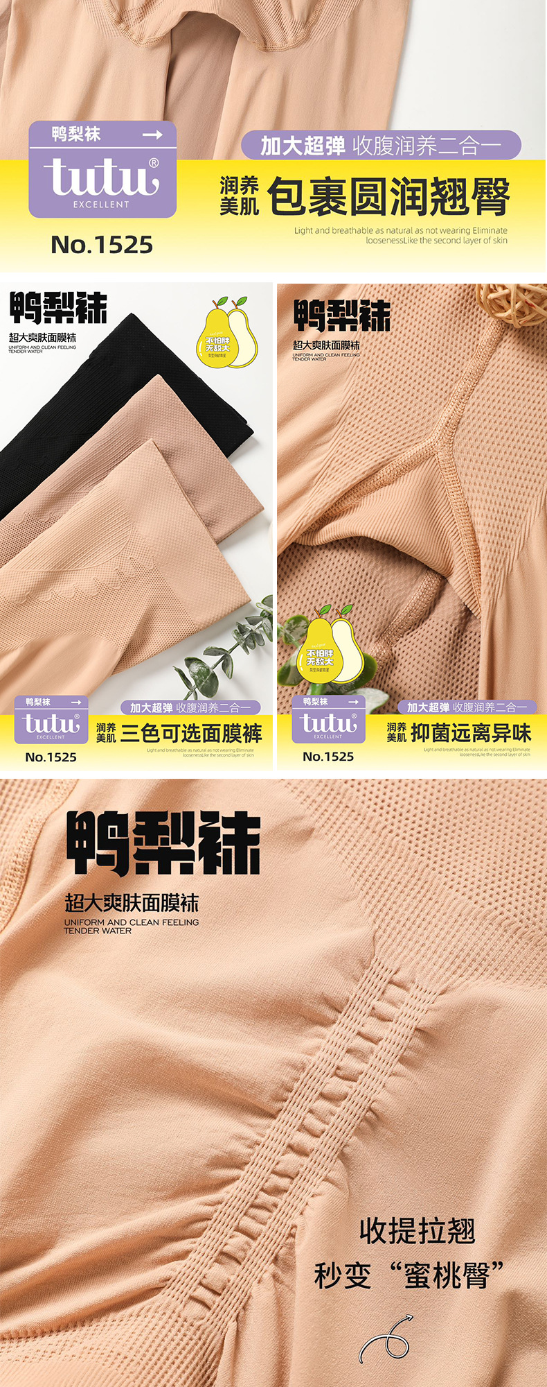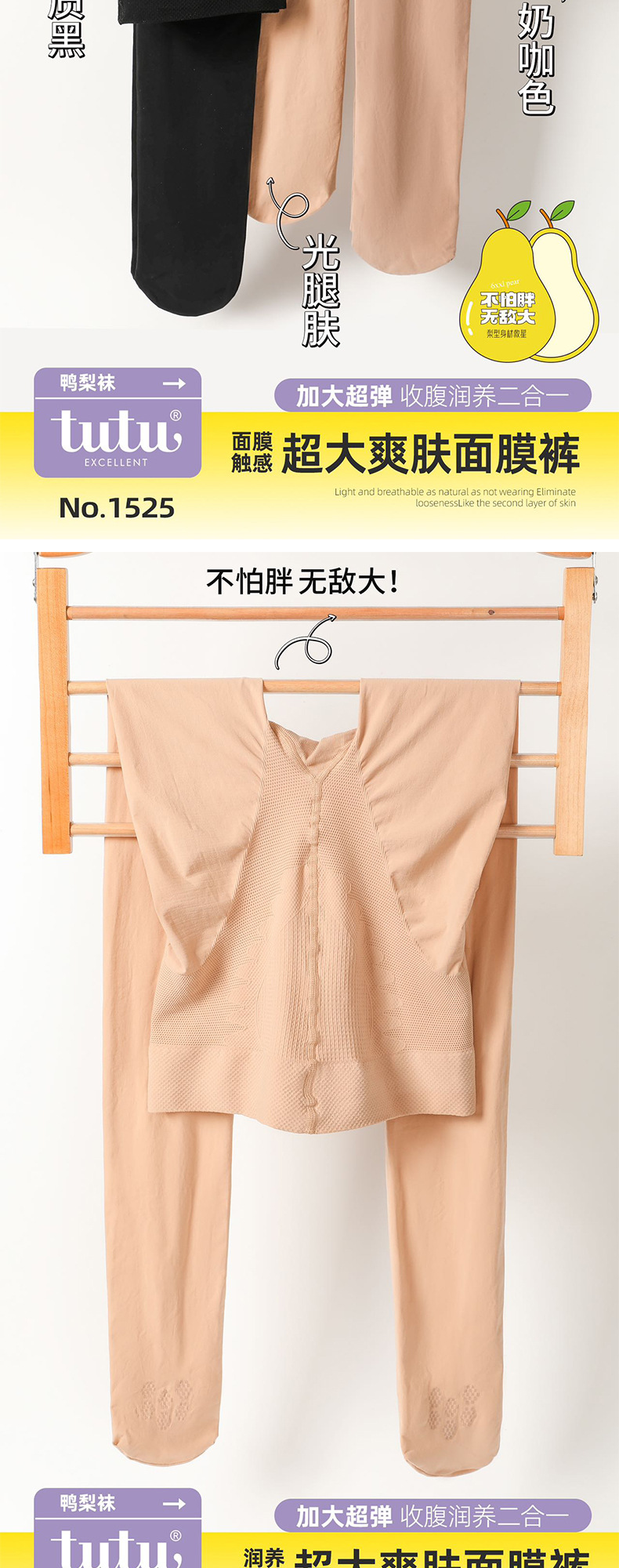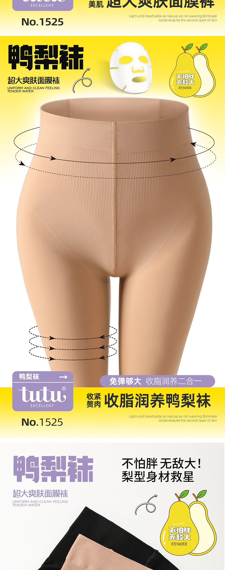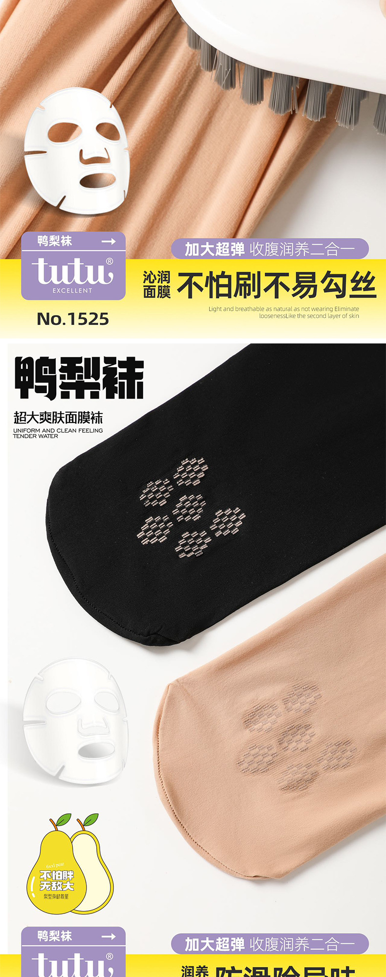 产品特性:鸭梨袜,超大爽肤面膜袜,加大润养超弹,行走的护肤品,穿出桃心臀,舒缓呵护敏感肌,收脂润养二合一,