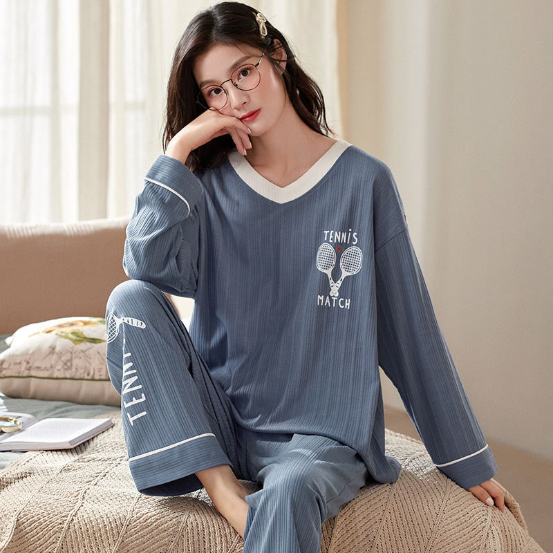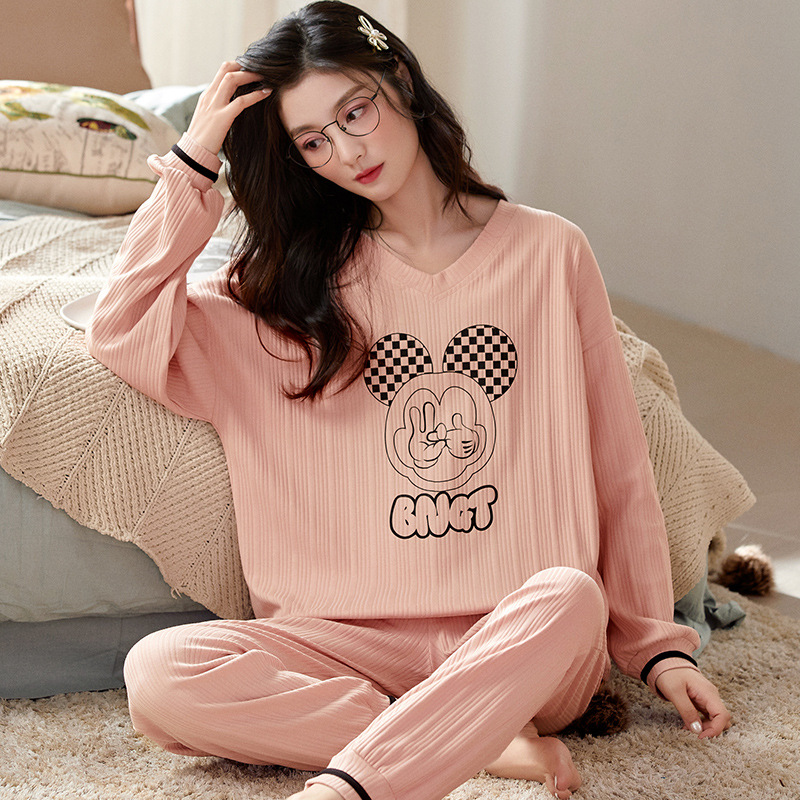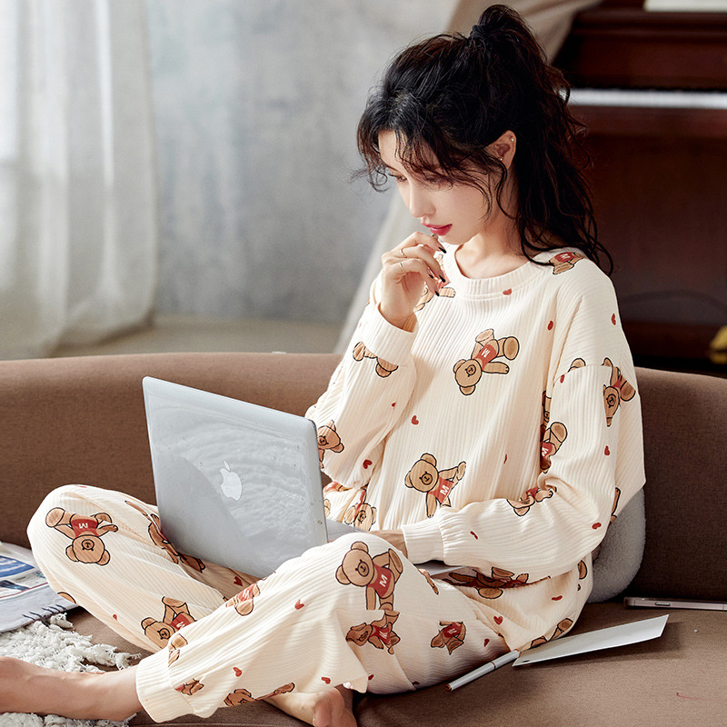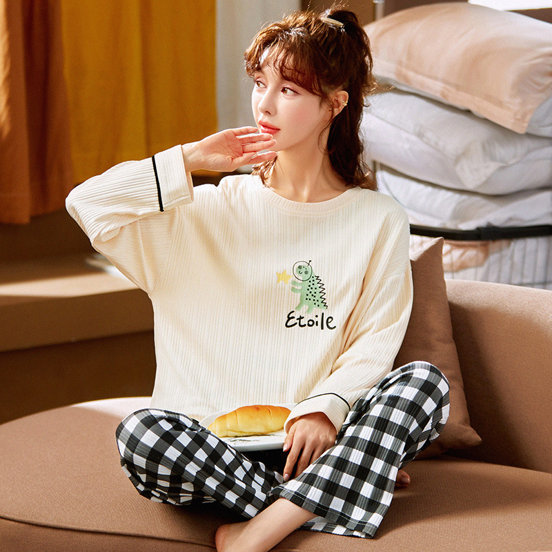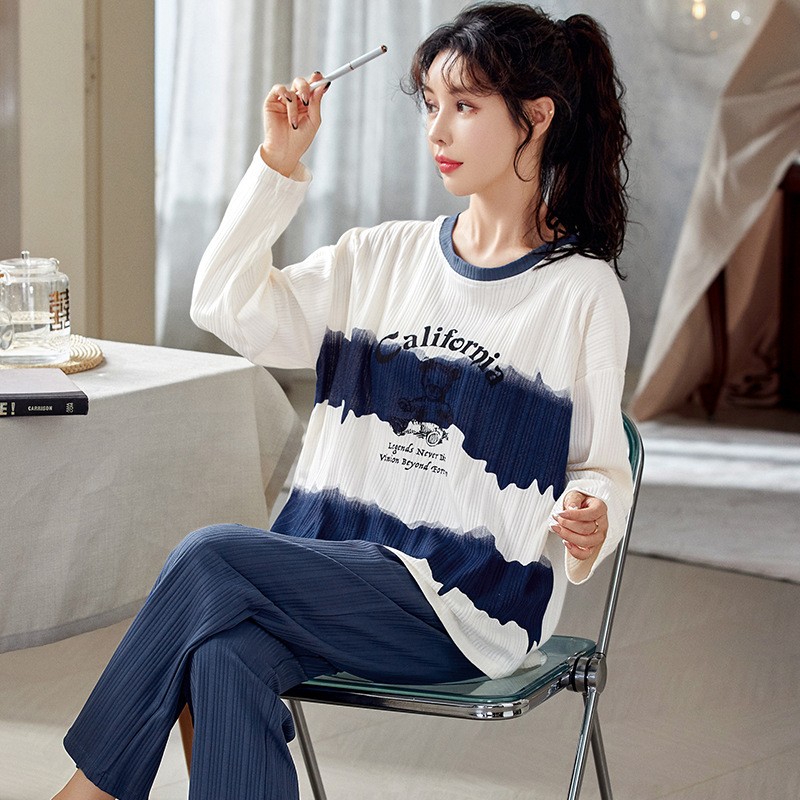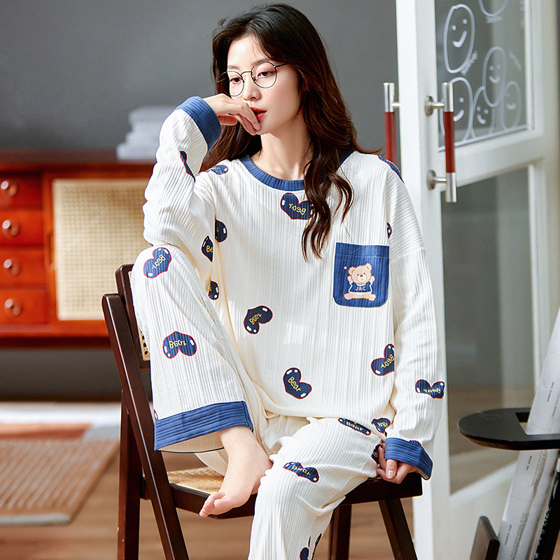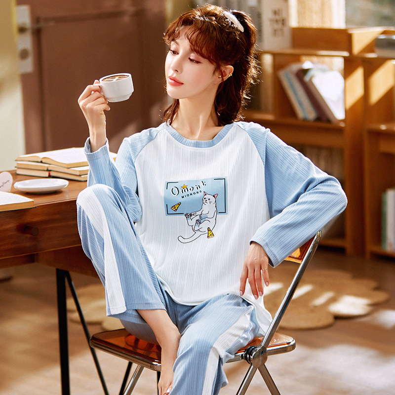 새로운 면 잠옷 여자의 봄과 가을 얇은 유행 캐주얼 긴 소매 가정 옷 세트 여자의 간단한 겉옷스토어 가기