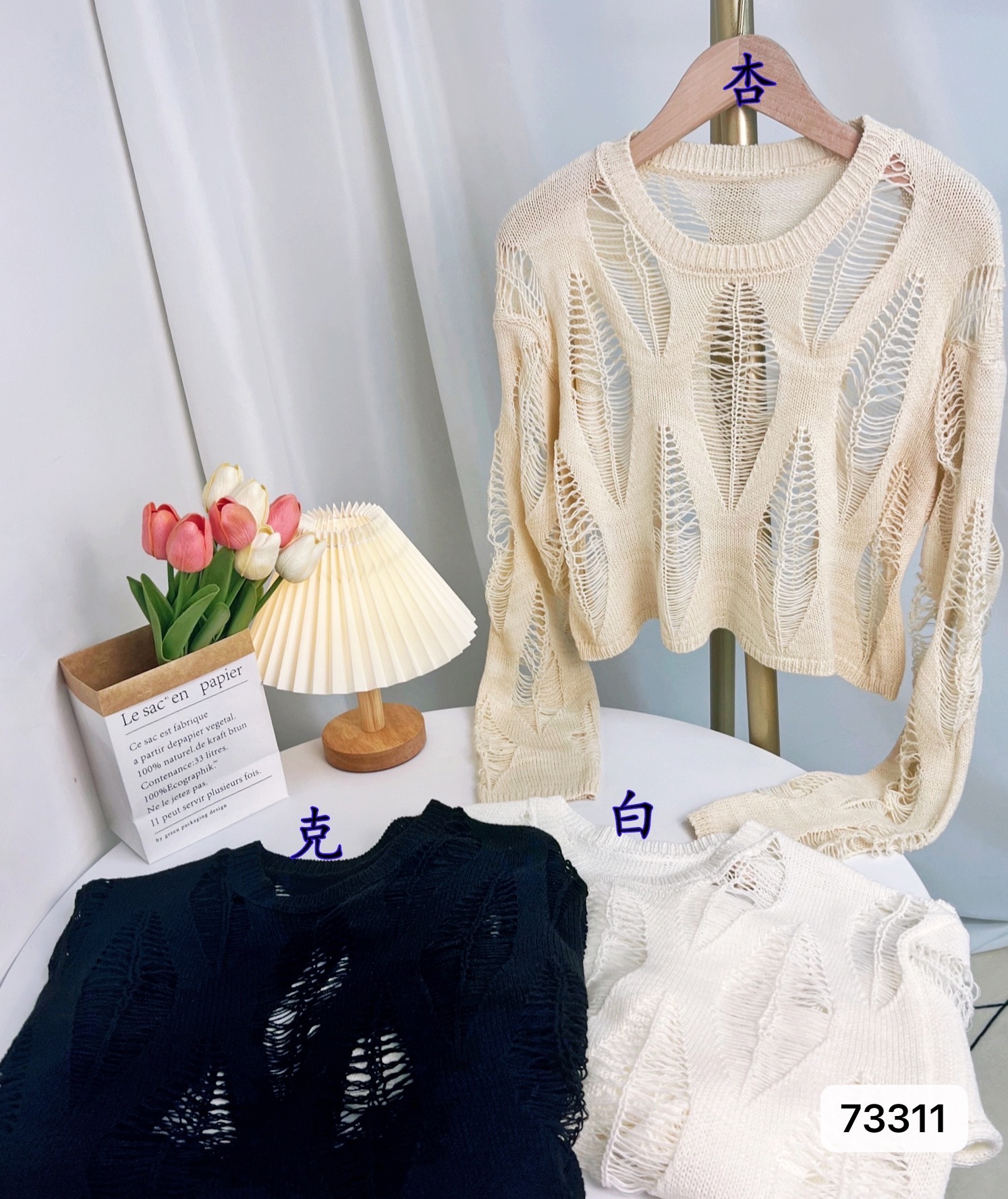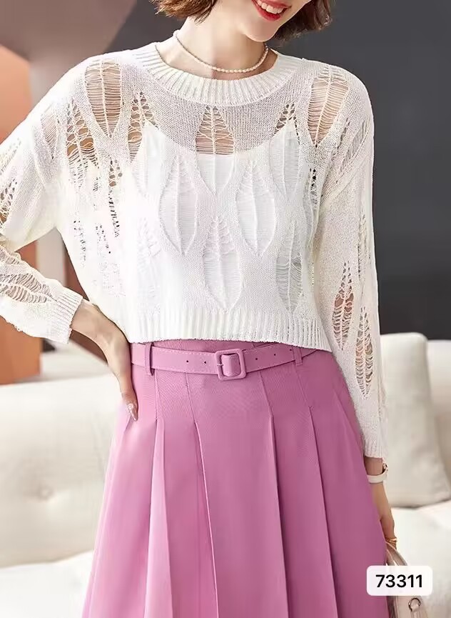 새로운 한국 스타일 얇은 중공 니트웨어 여성용 풀오버 블라우스 짧은 낮은 라운드 넥 느슨한 긴 소매 에어컨 셔츠 여성용