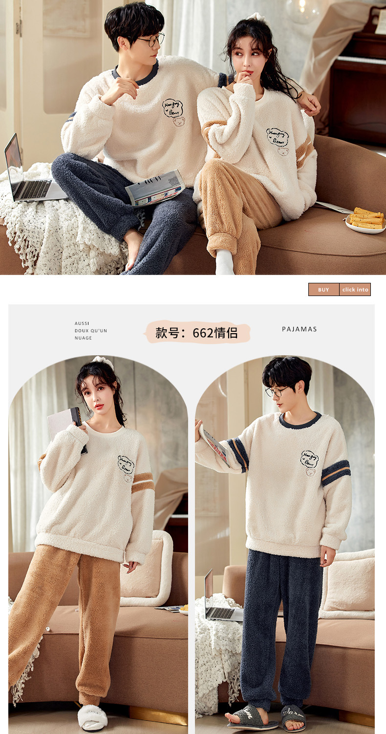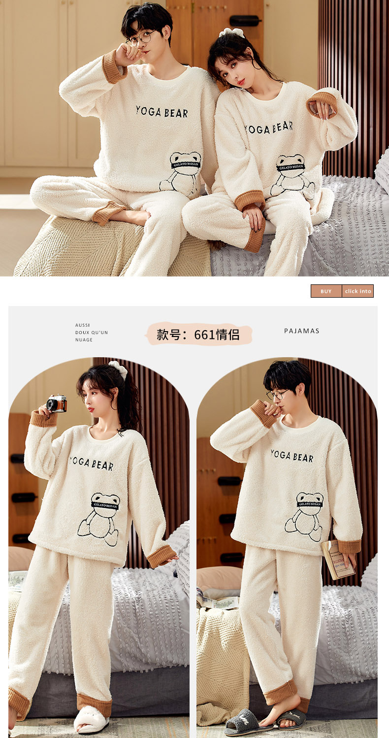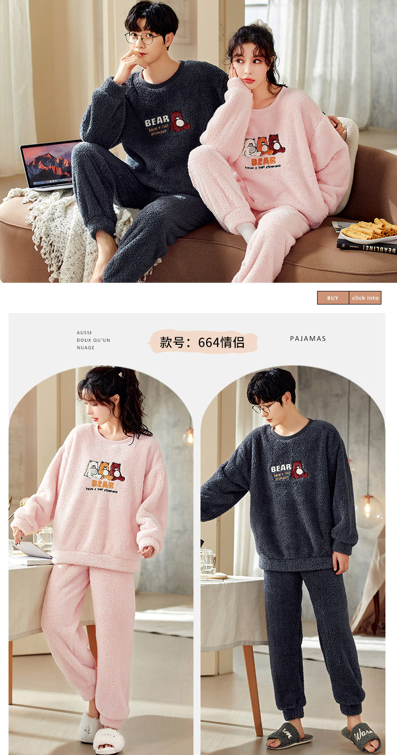 남성과 여성을위한 새로운 산호 양털 커플 잠옷 가을과 겨울 만화 기모 두꺼운 따뜻한 플란넬 가정 의류 세트스토어 가기