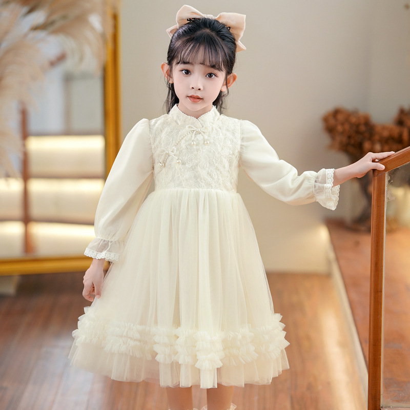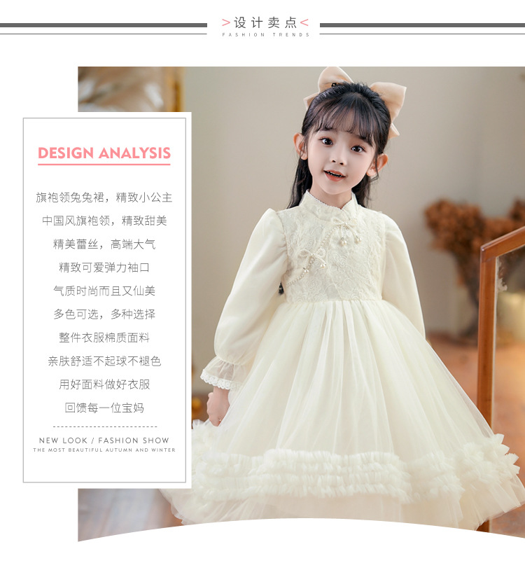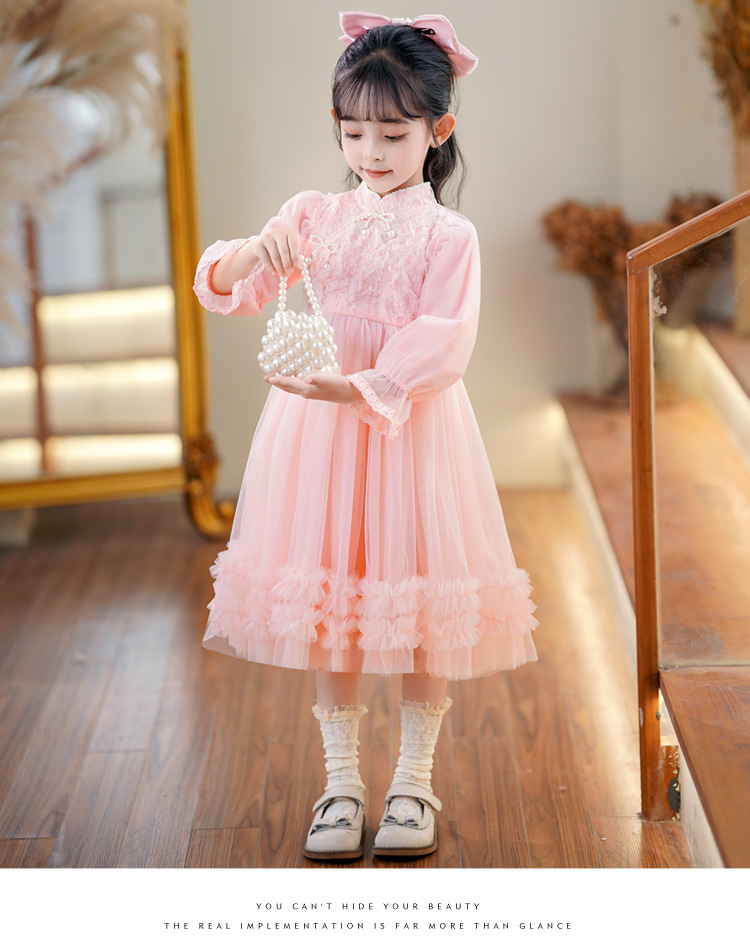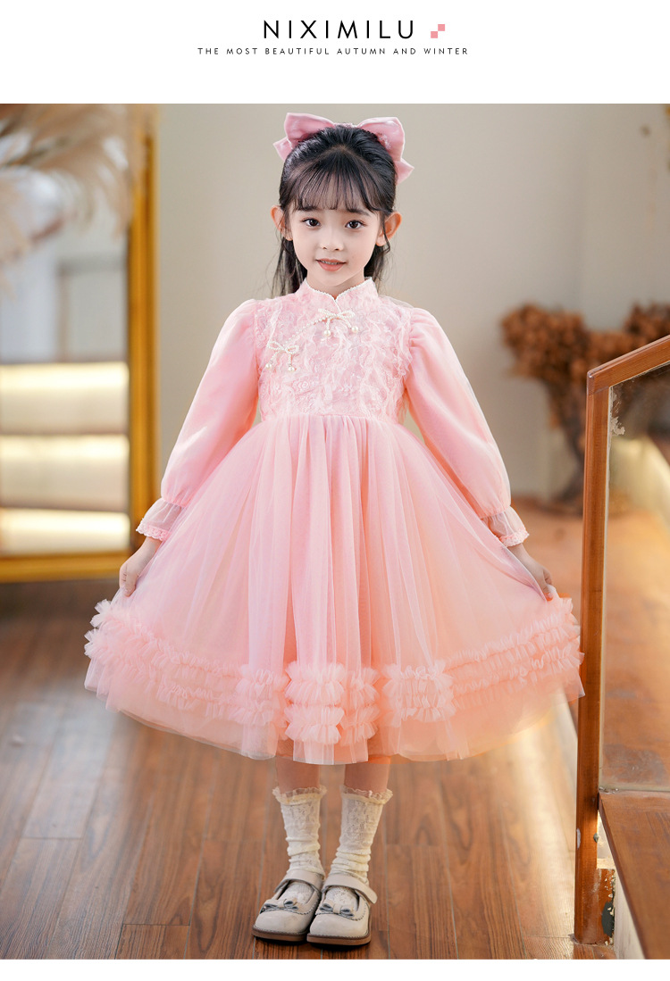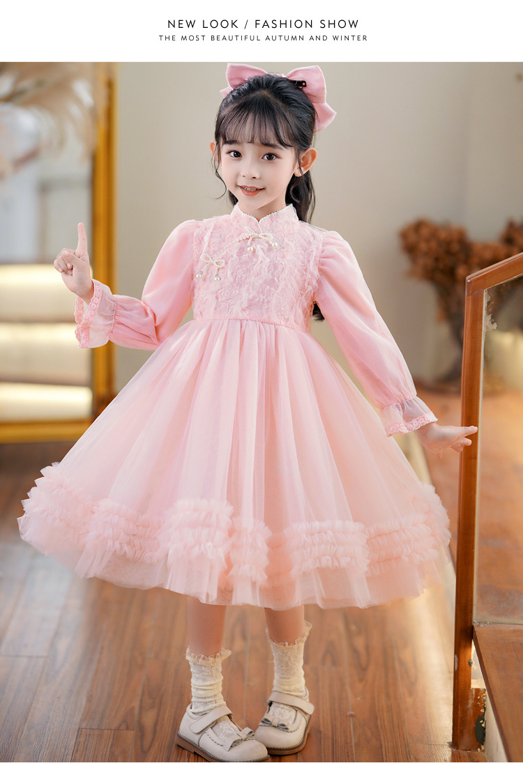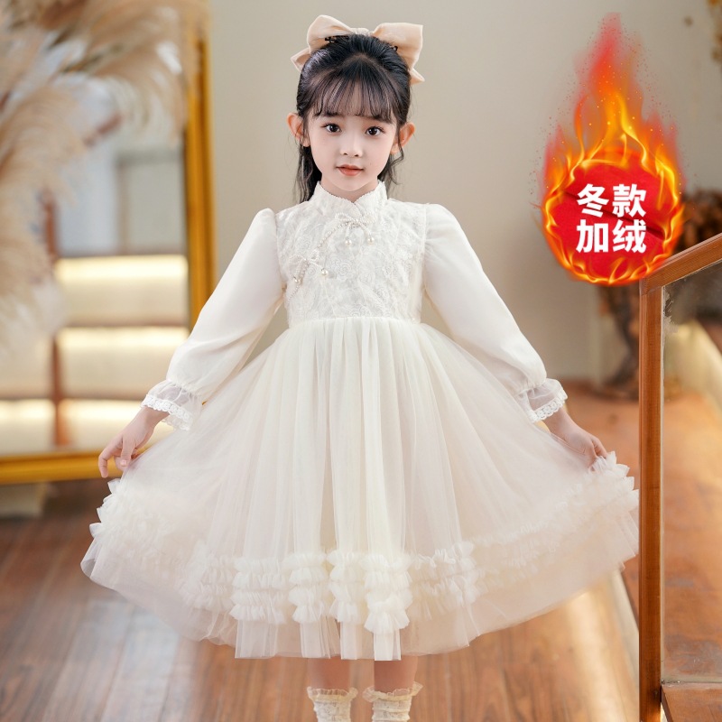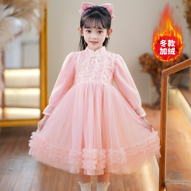 여아 드레스 가을 신상 중국풍 치파오 스타일 칼라 어린이 드레스 공주 드레스 여자아이용 플러스 벨벳 망사 드레스