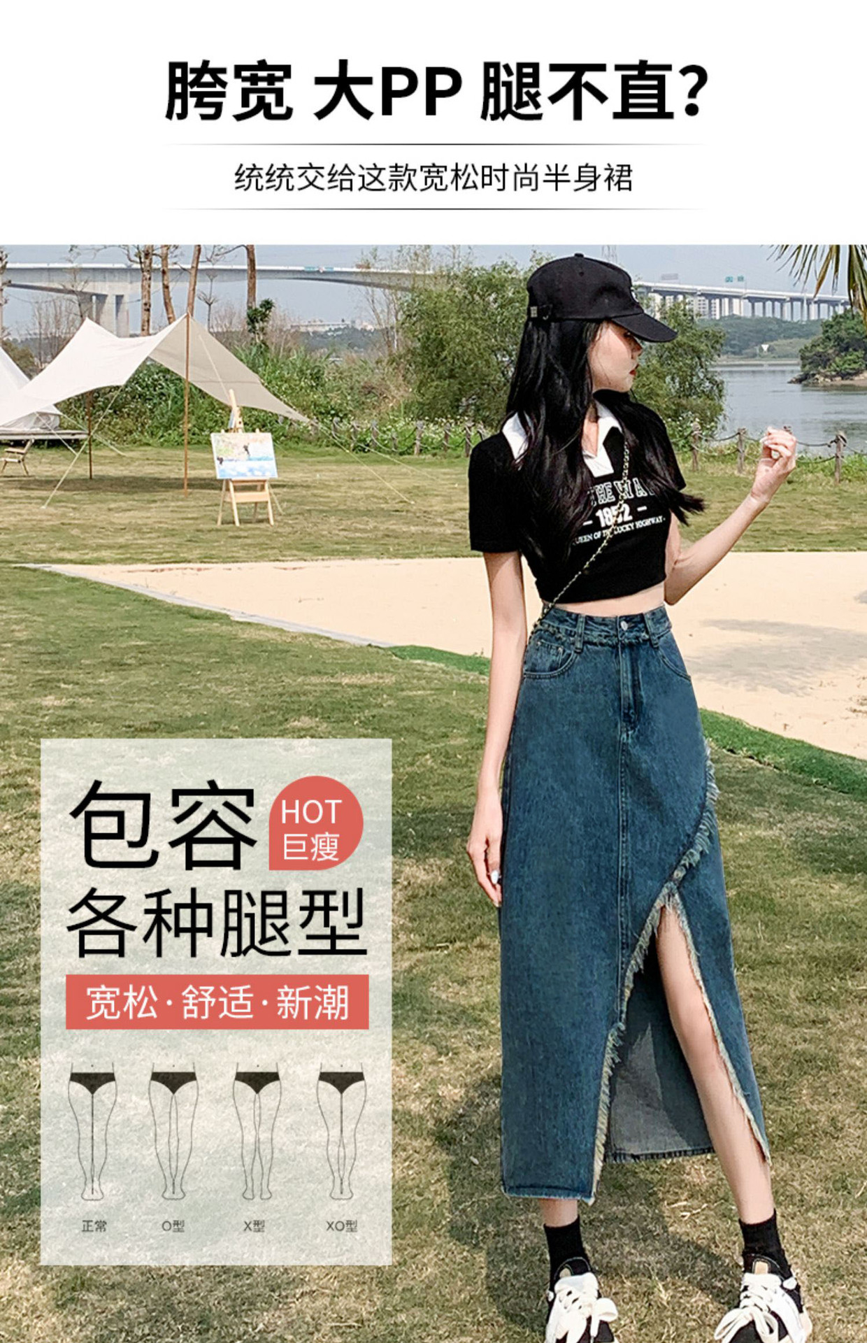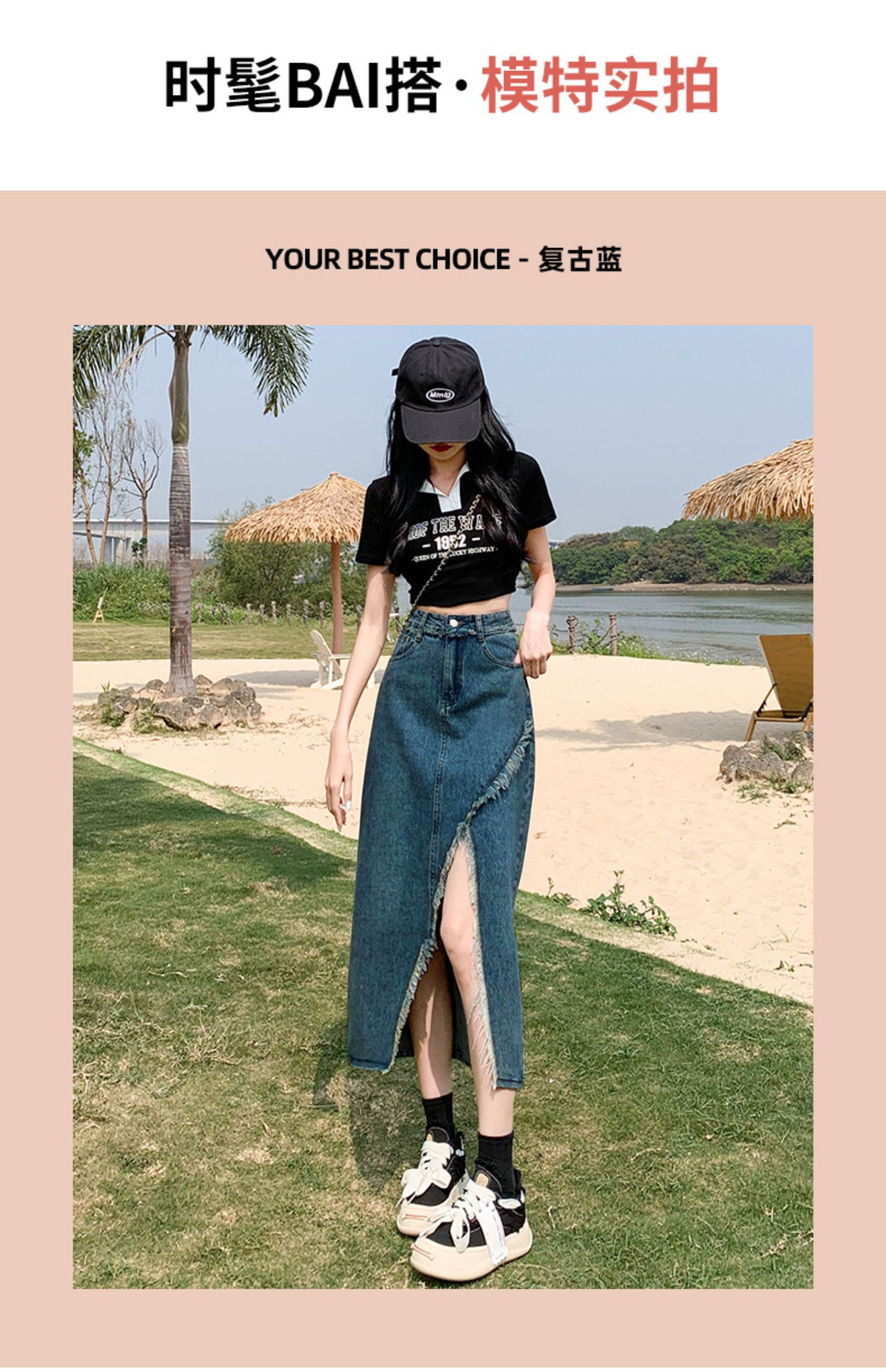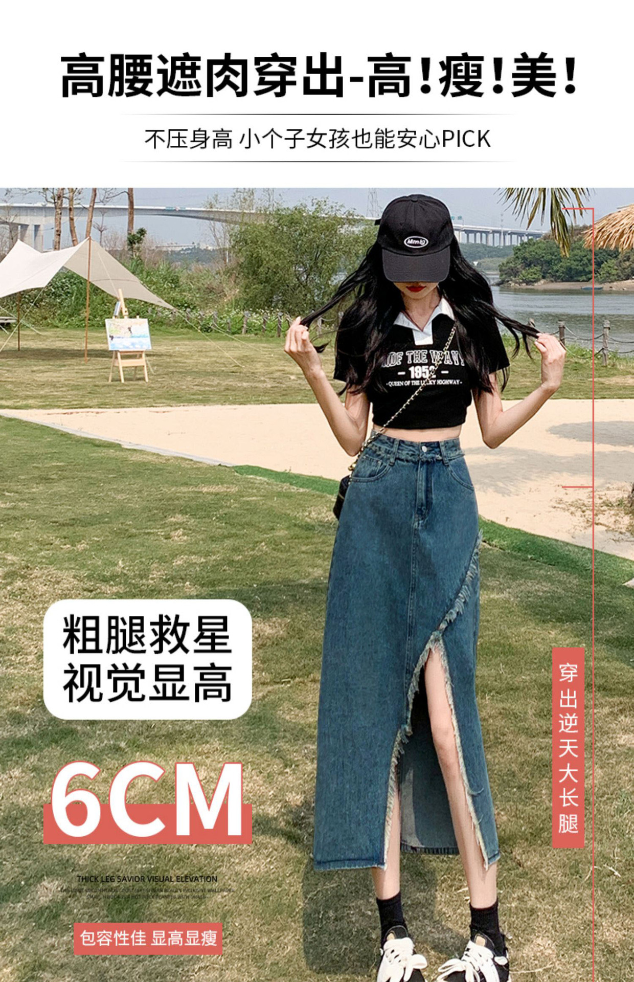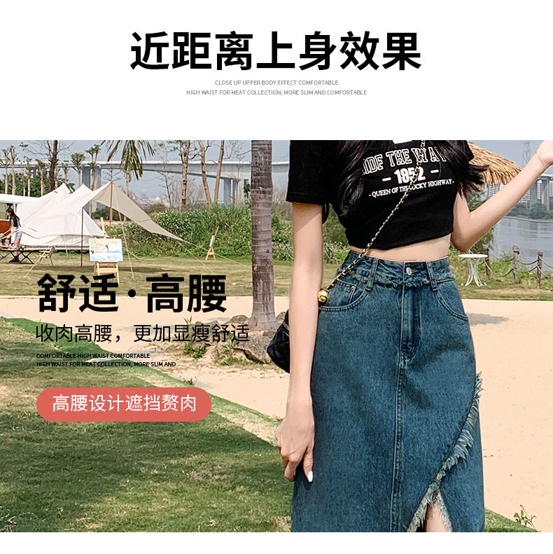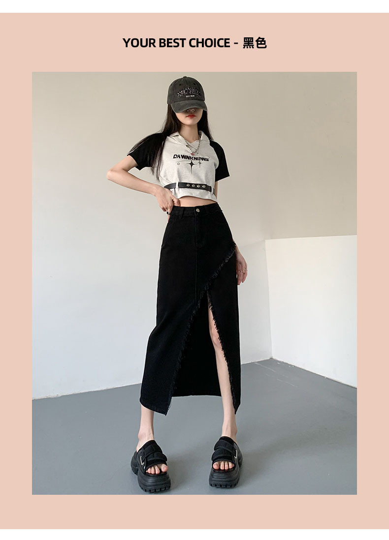 블랙 그레이 하이 웨이스트 슬리밍 불규칙한 스플릿 데님 스커트 2023 여름 버 디자인 센스 A 라인 중간 길이 스커트스토어 가기