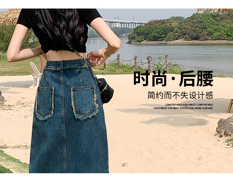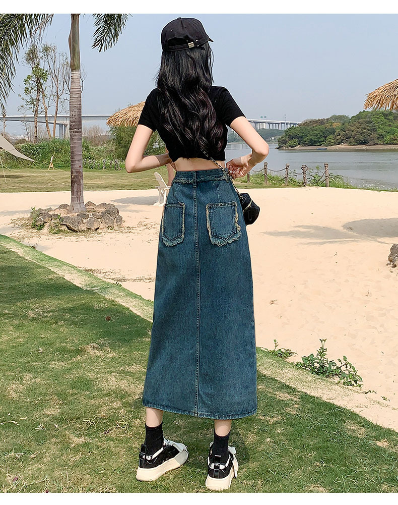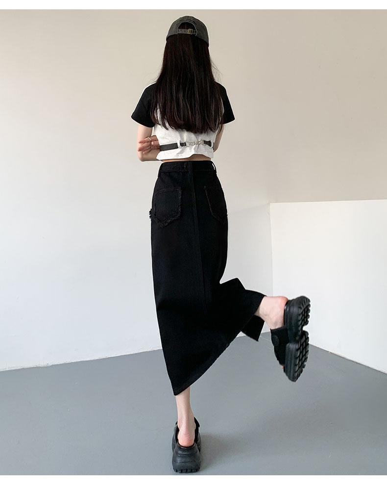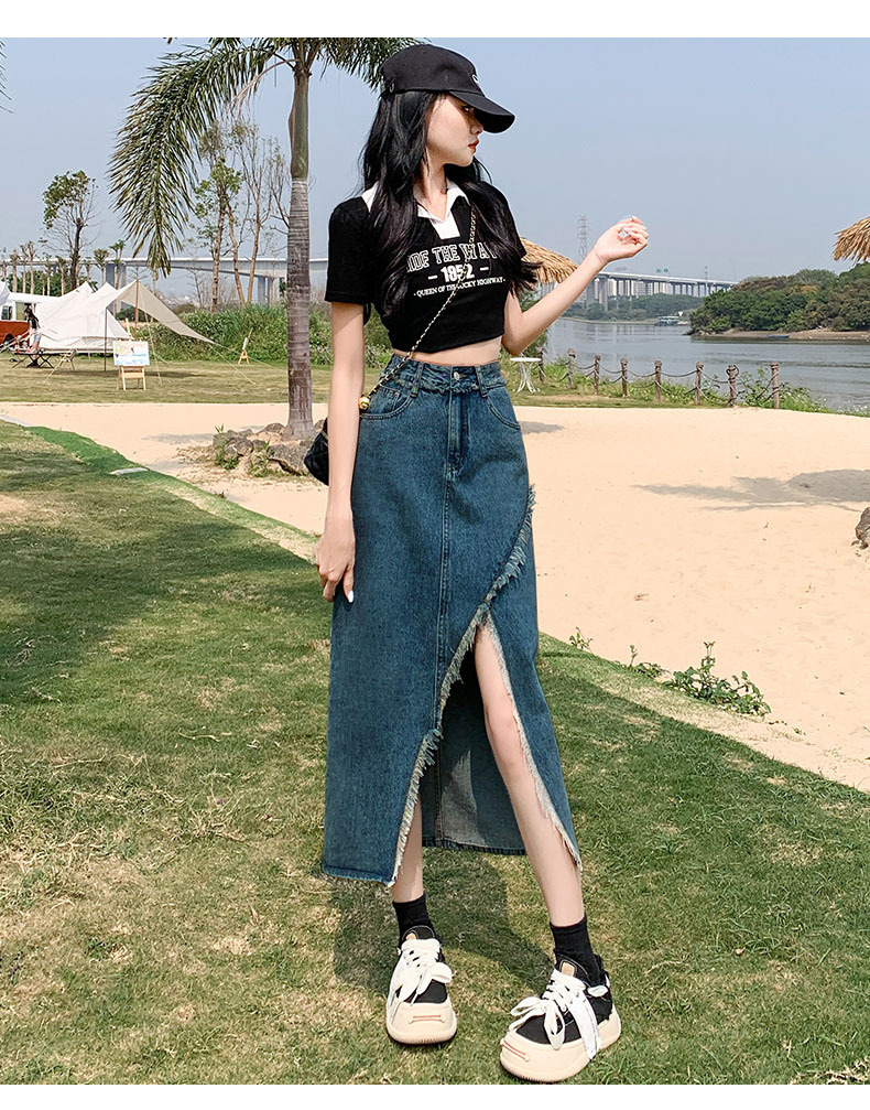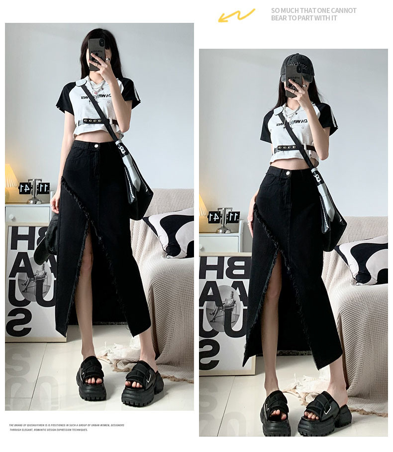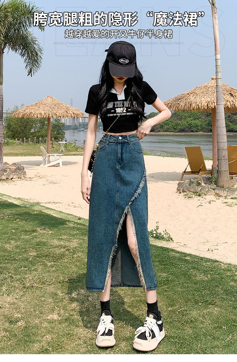 블랙 그레이 하이 웨이스트 슬리밍 불규칙한 스플릿 데님 스커트 2023 여름 버 디자인 센스 A 라인 중간 길이 스커트스토어 가기