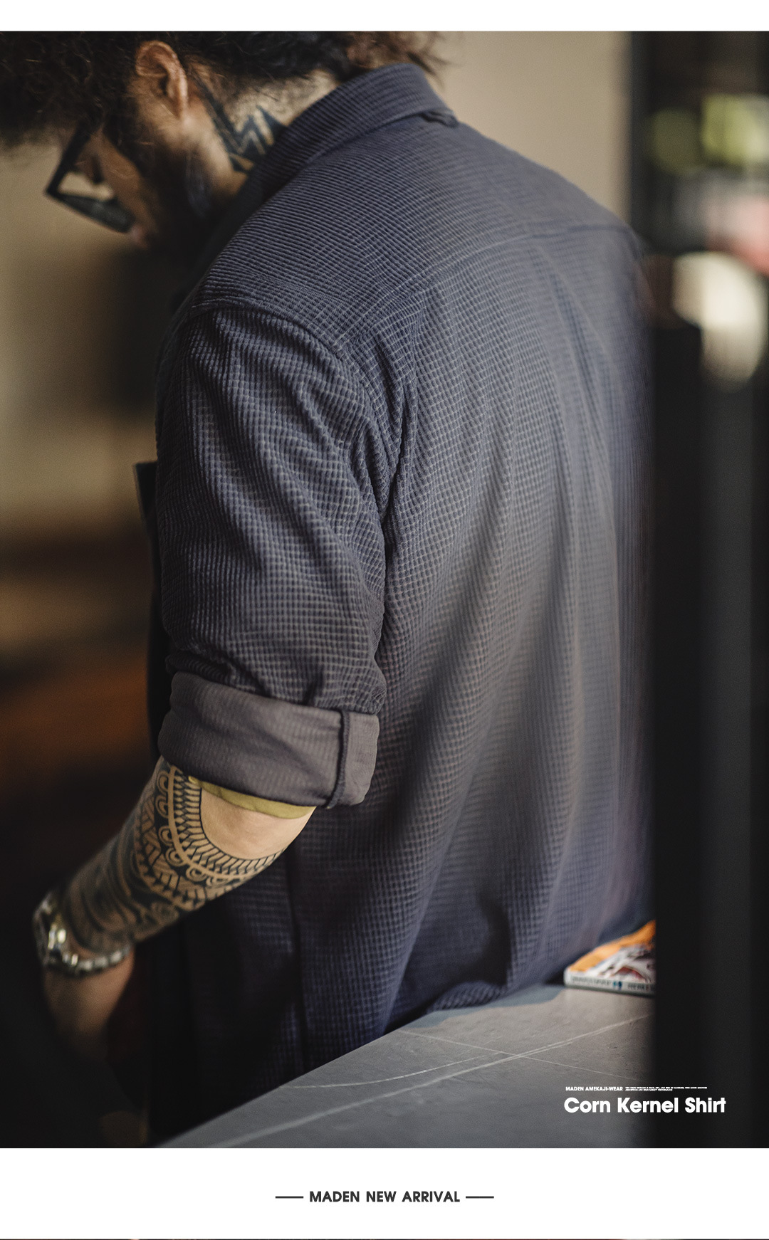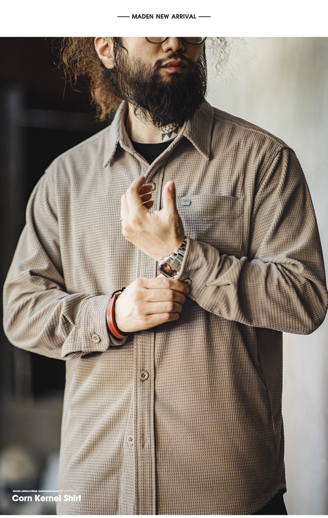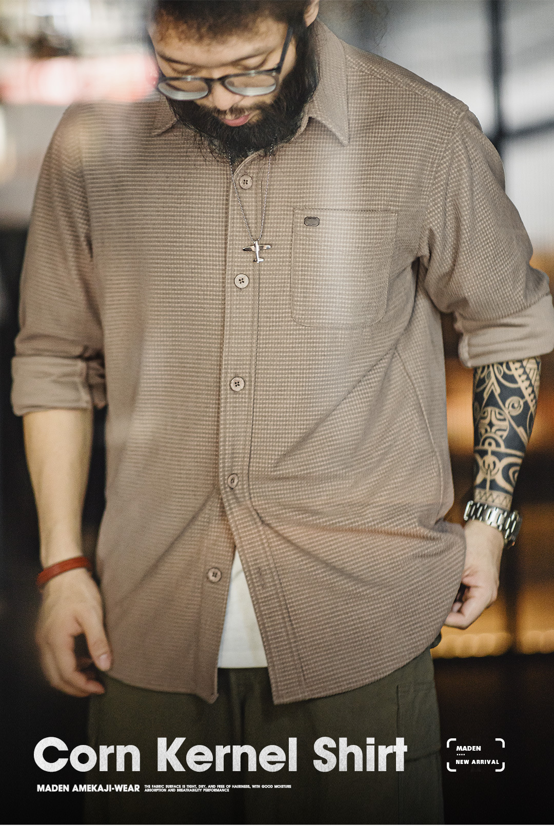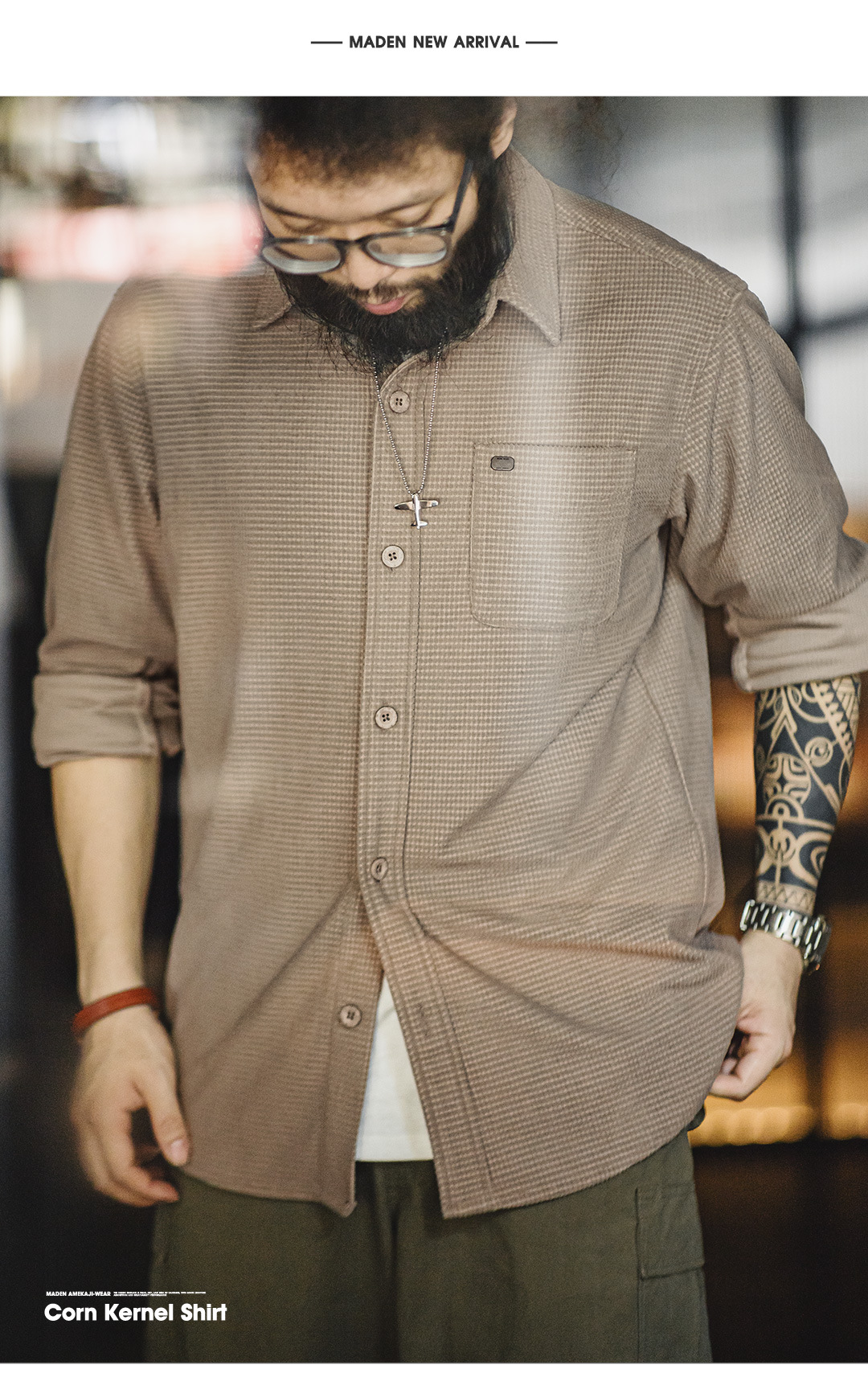 Madden 툴링 미국 복고풍 옥수수 곡물 격자 무늬 셔츠 옷깃 단색 캐주얼 휴식 긴 소매 셔츠 남성용 가을