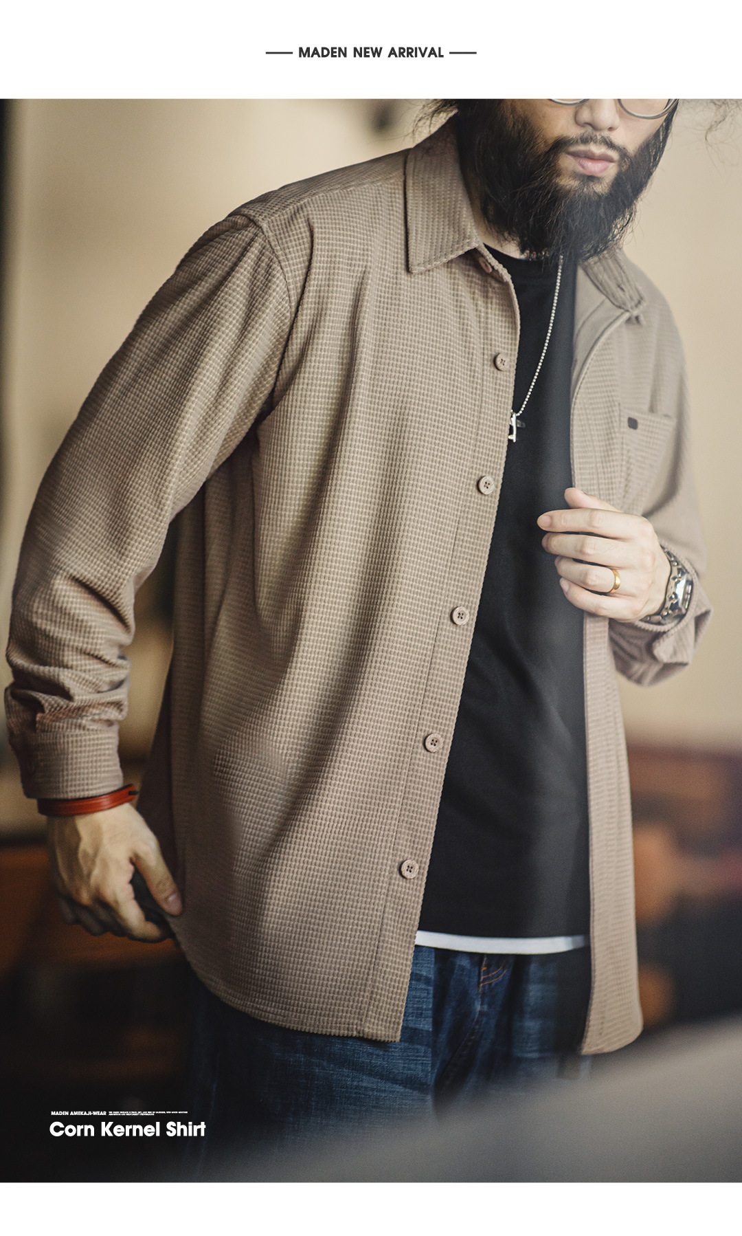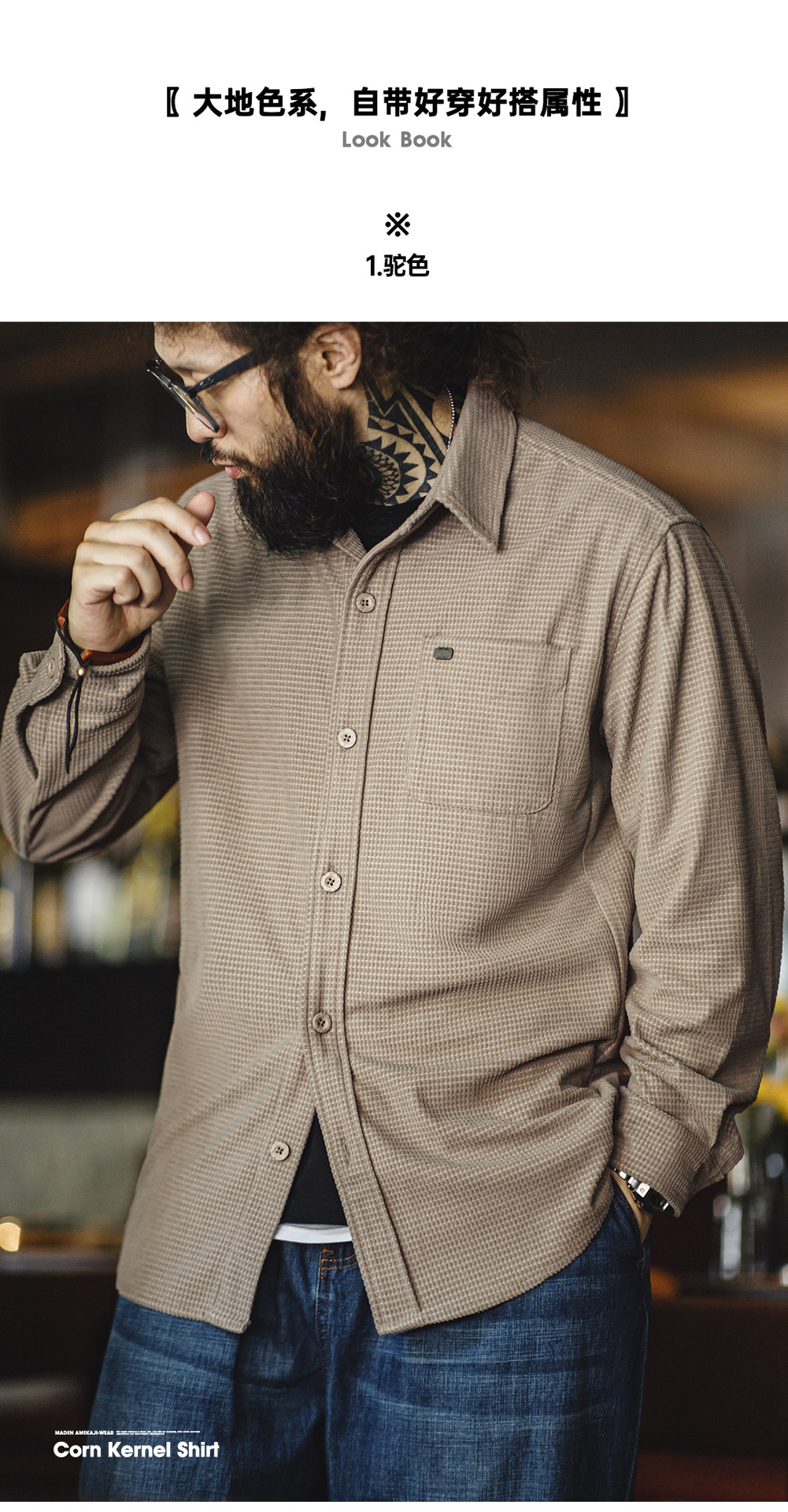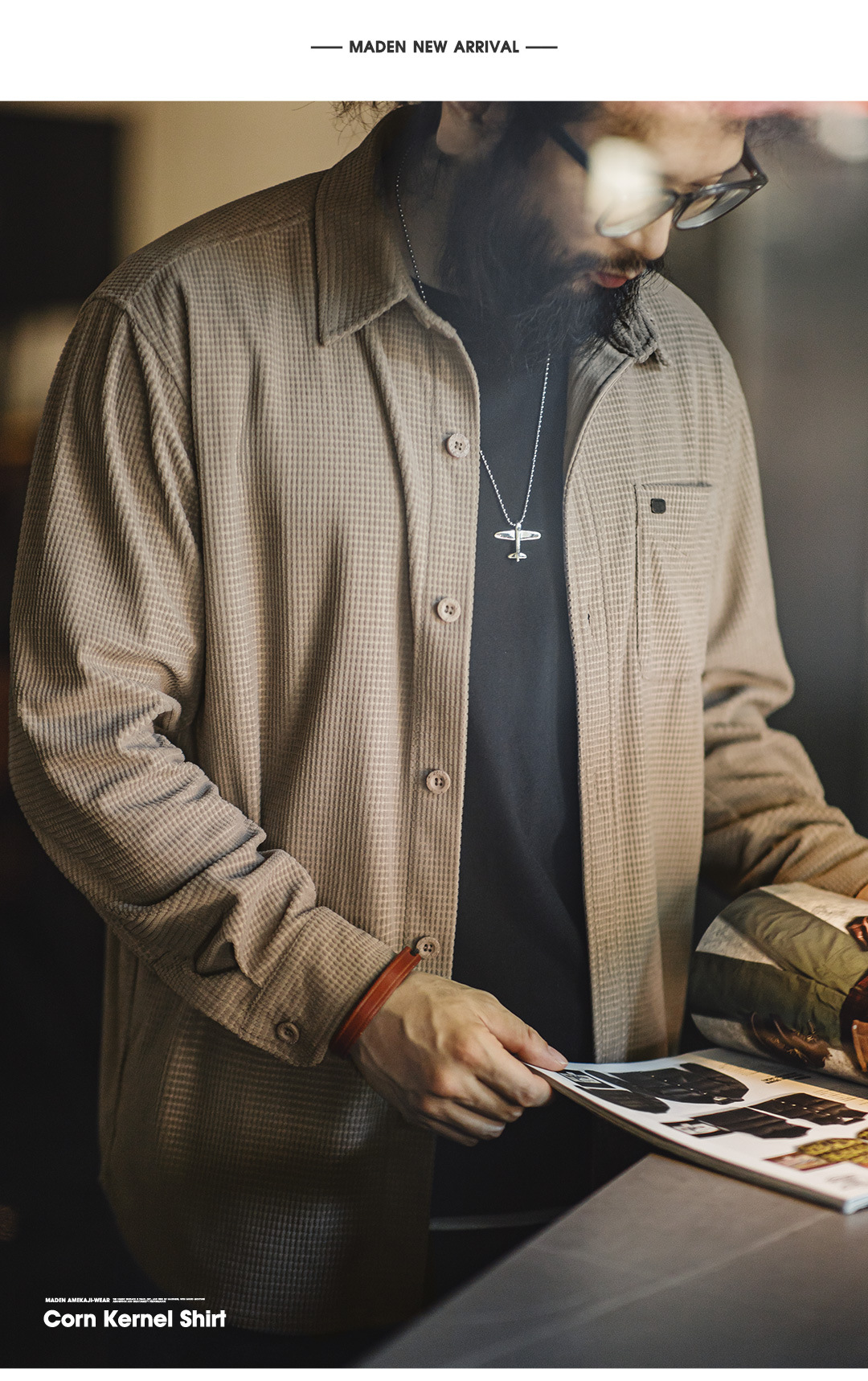 Madden 툴링 미국 복고풍 옥수수 곡물 격자 무늬 셔츠 옷깃 단색 캐주얼 휴식 긴 소매 셔츠 남성용 가을