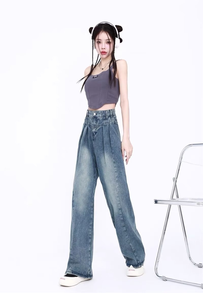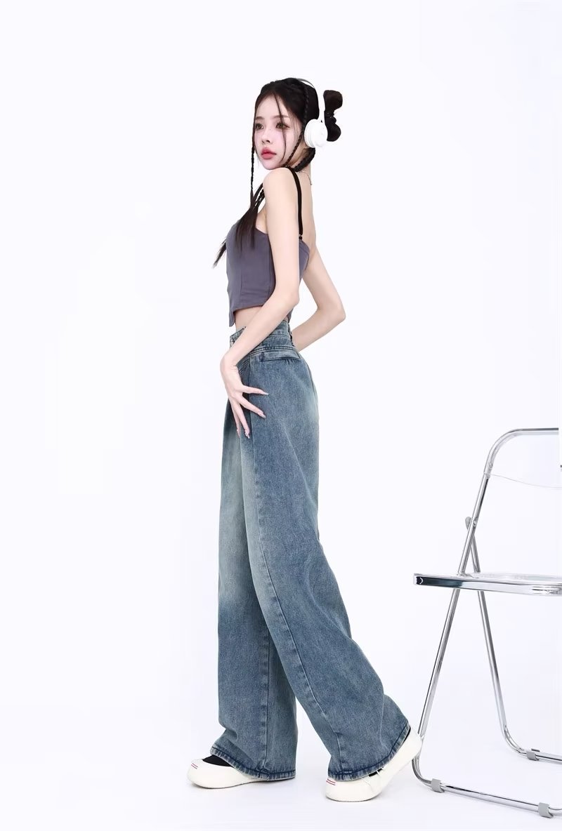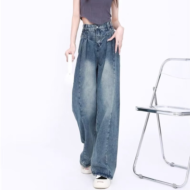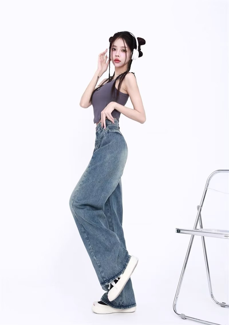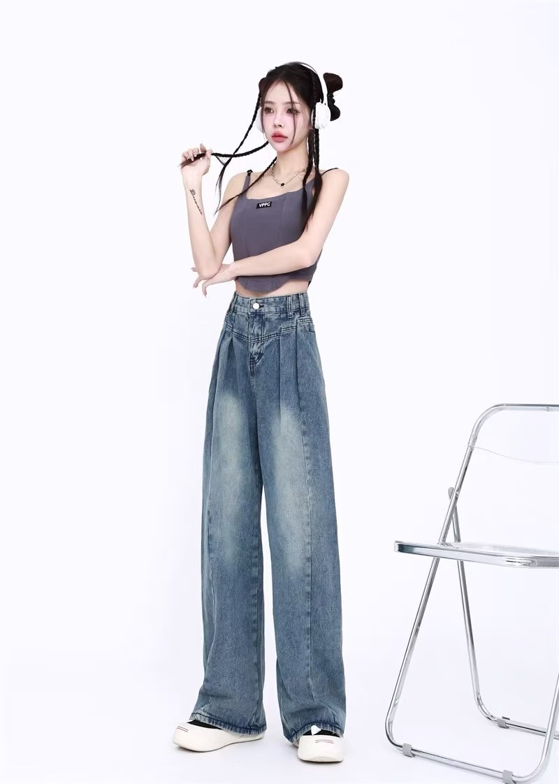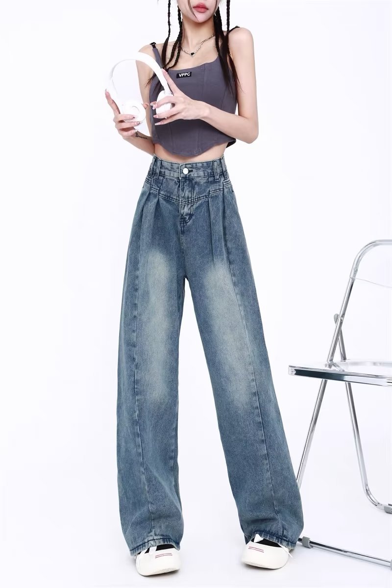 한국 스타일 하이 웨이스트 스트레이트 레그 와이드 레그 청바지 여성용 2023 여름과 가을 새로운 디자인 슬리밍 느슨한 드레이핑 팬츠스토어 가기