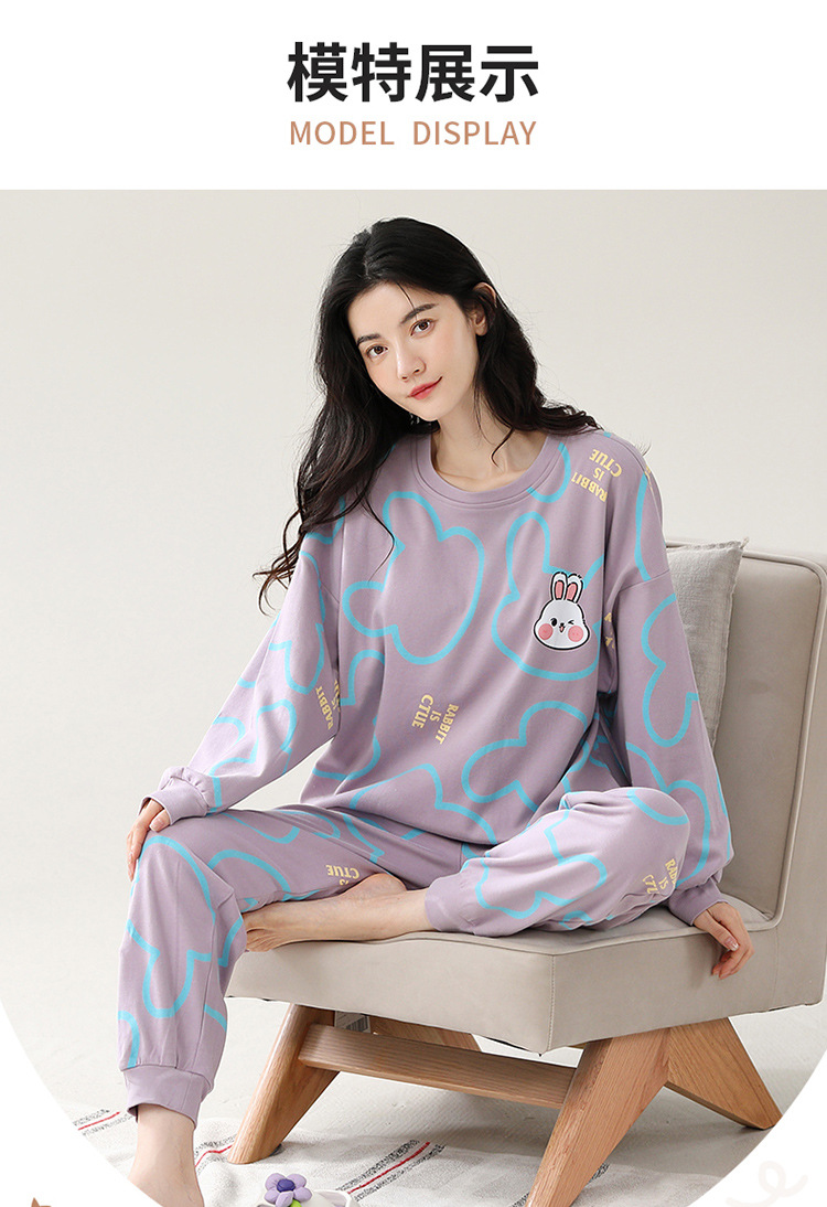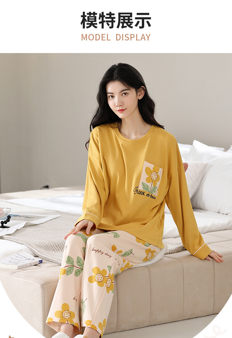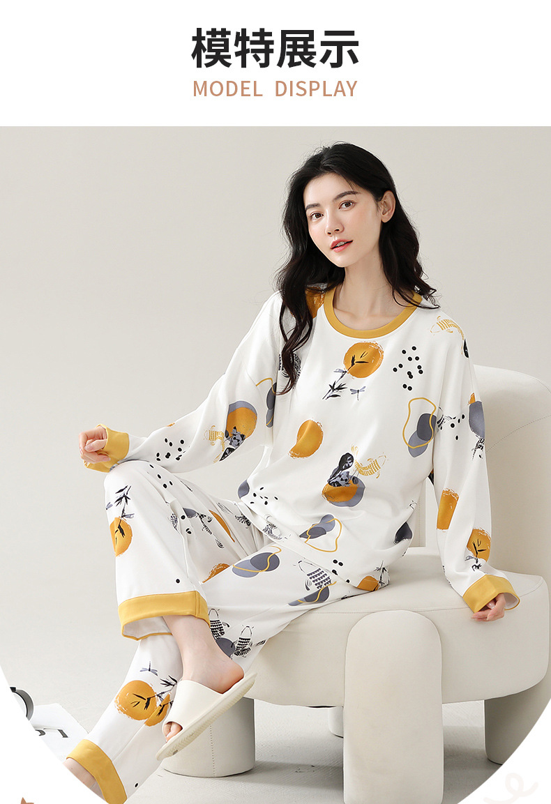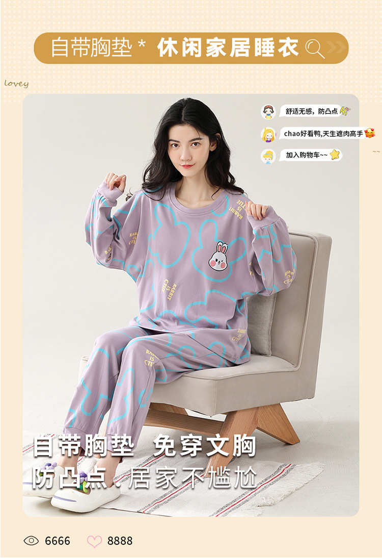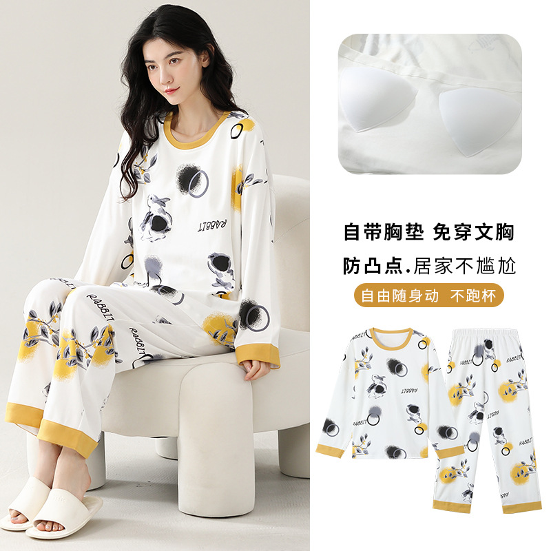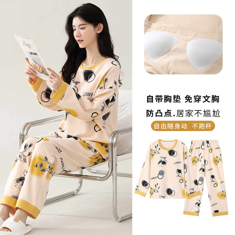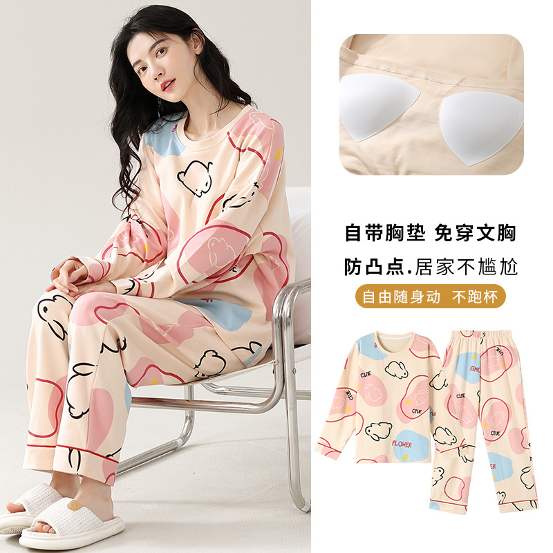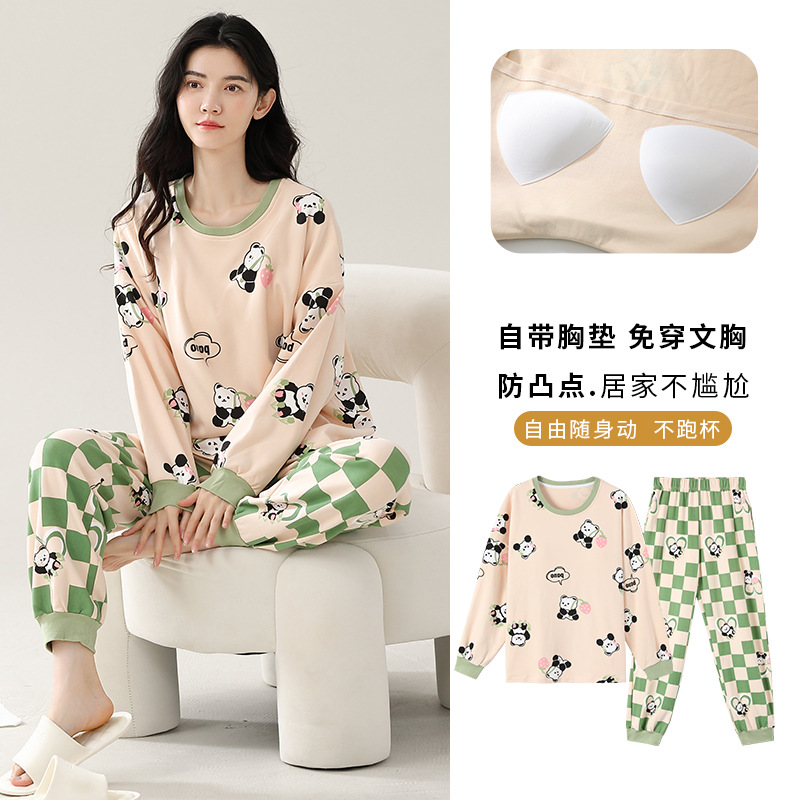 봄과 가을 2023 새로운 스타일 잠옷 여자의 순면 긴 소매 통통녀 플러스 사이즈 가정 옷 가슴 패드와 투피스 팩