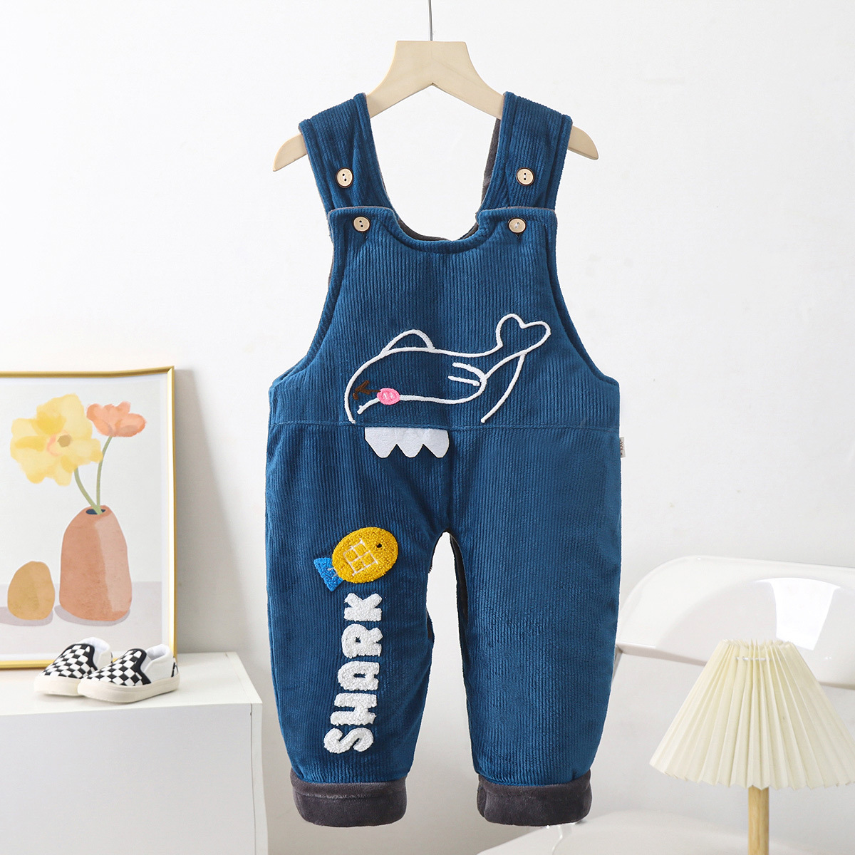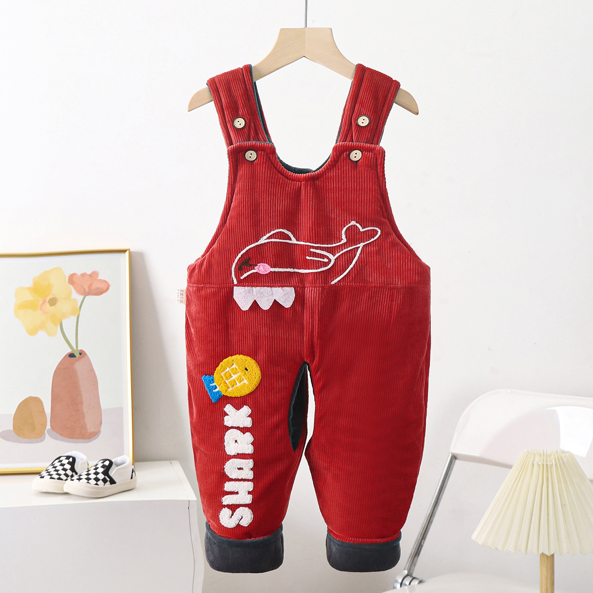 • 핑크 상어 기모 퀼트 멜빵면 바지