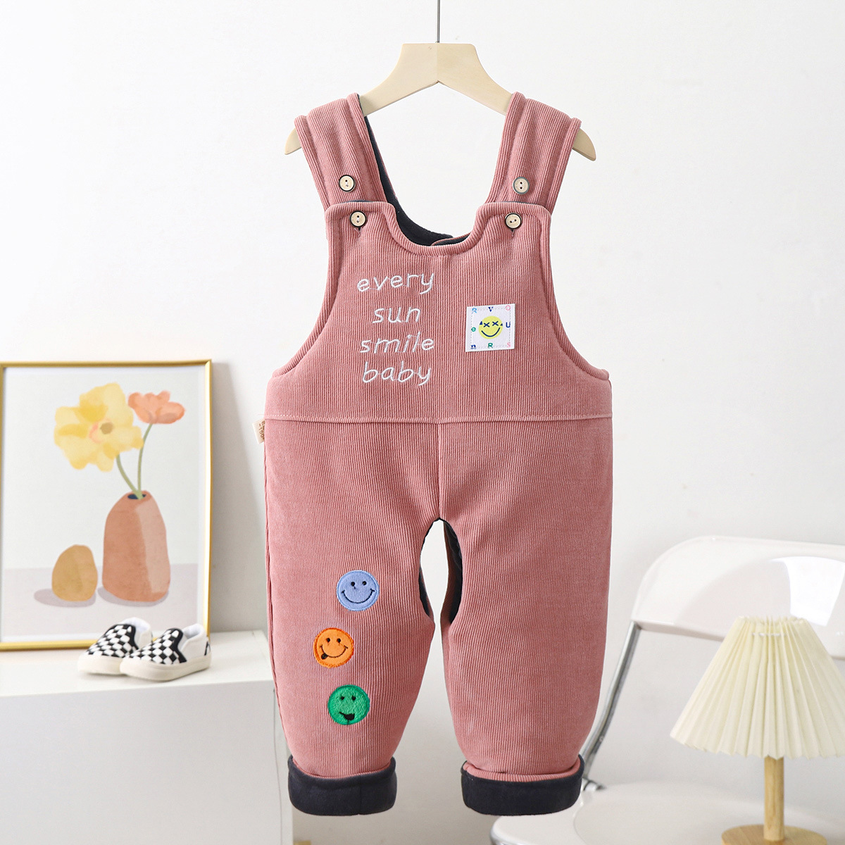 • 핑크 스마일리 기모 퀼트 서스펜더 코튼 팬츠