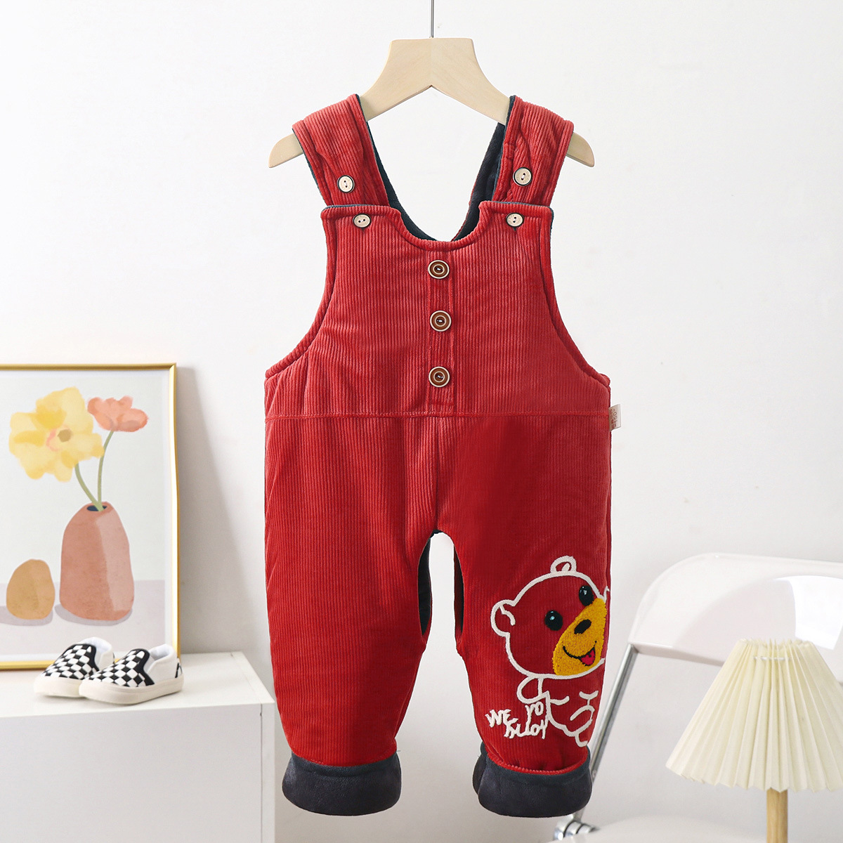 • 빨간 기모 퀼트 3 버튼 곰 서스펜더 코튼 팬츠