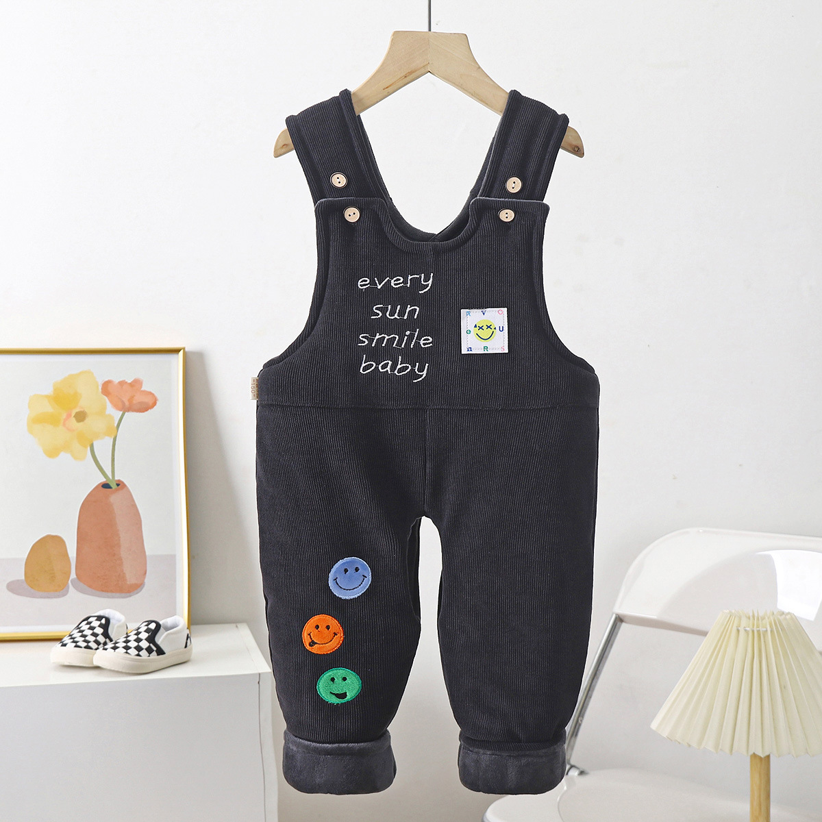 • 회색 웃는 얼굴 기모 퀼트 서스펜더 코튼 팬츠