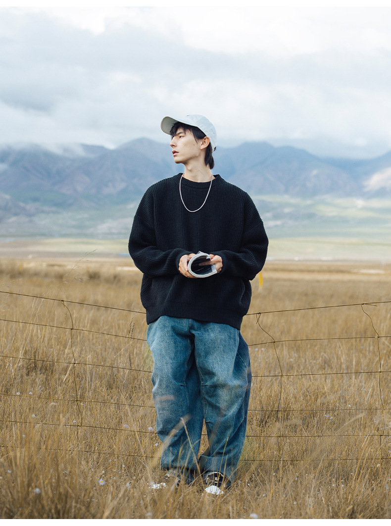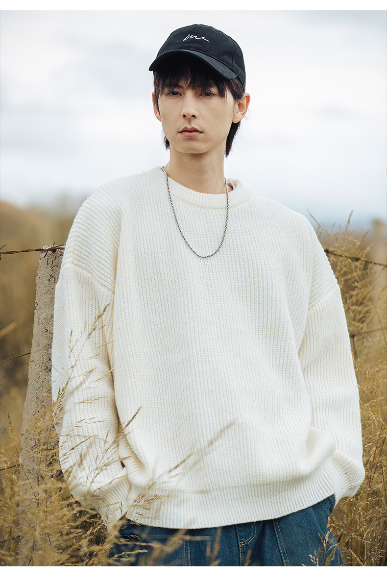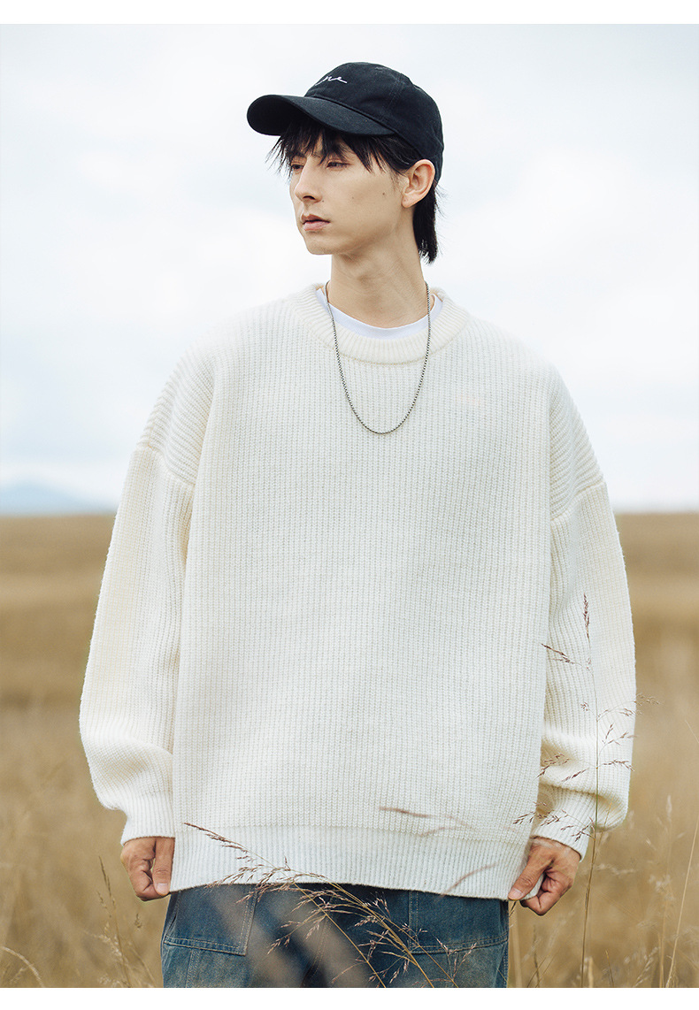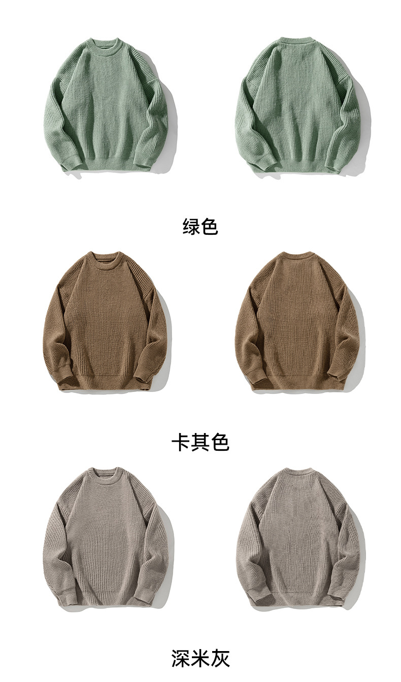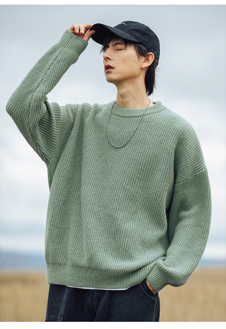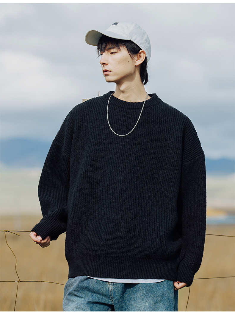단색 두꺼운 바늘 구덩이 질감 스웨터 남자의 가을과 겨울 새로운 커플의 일본 스타일 복고풍 느슨한 라운드 넥 무거운 니트 스웨터