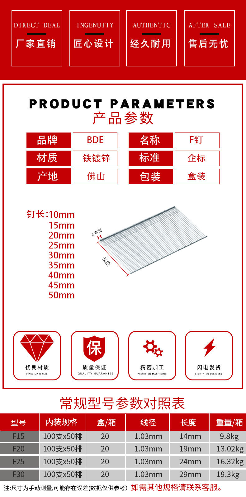 BDE气动枪钉木工家具F30直钉枪固定钉F25整箱F20F15F10排钉枪通用