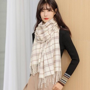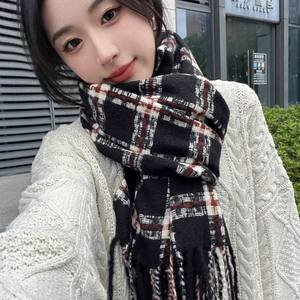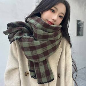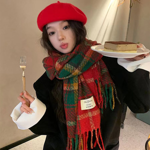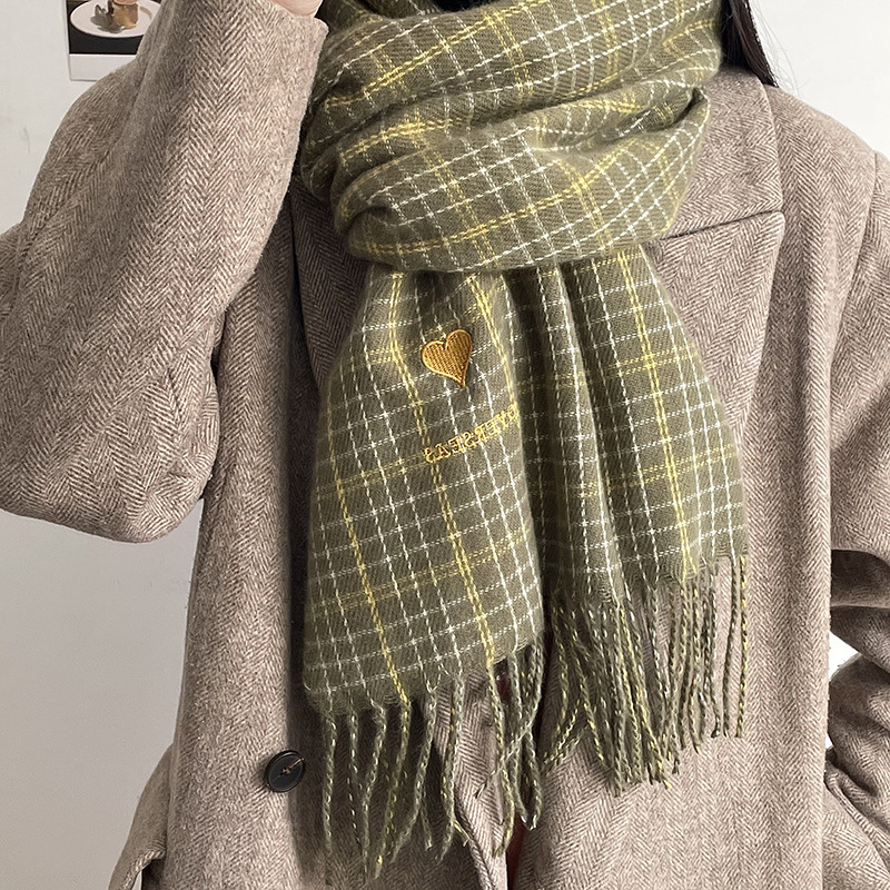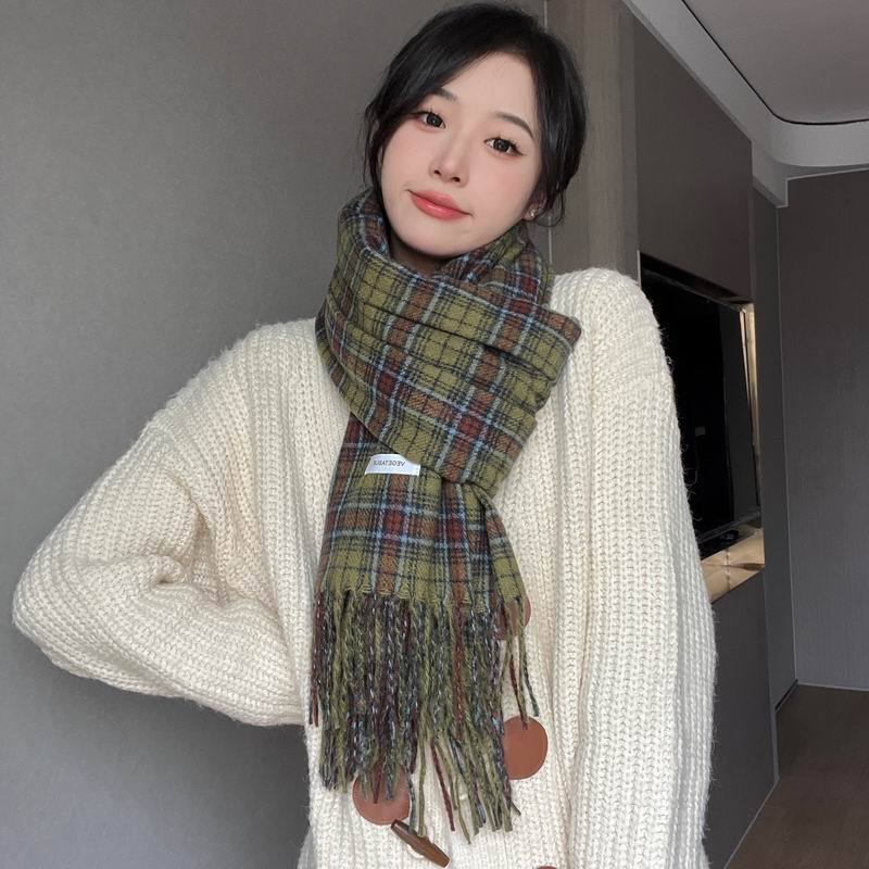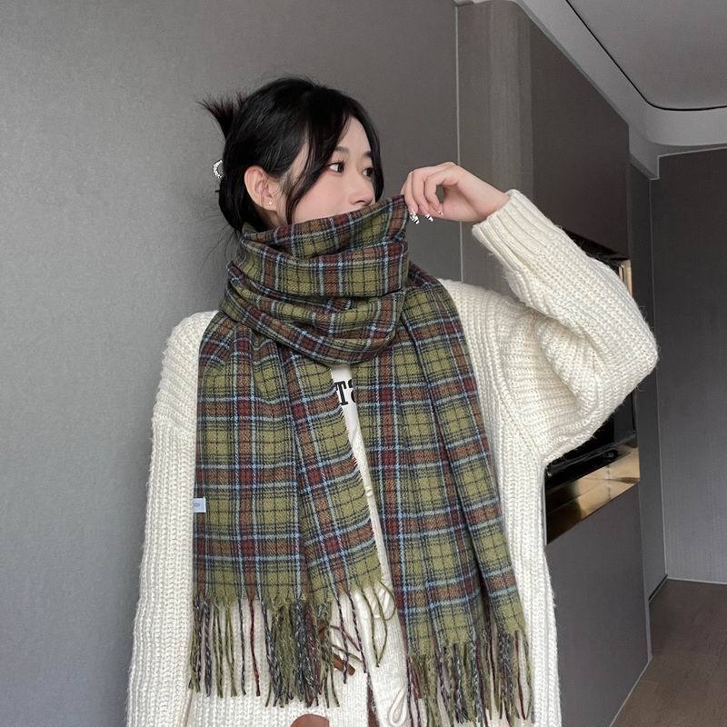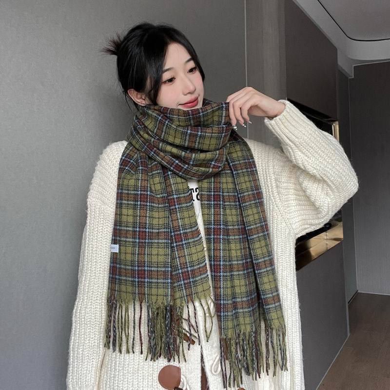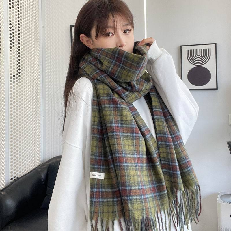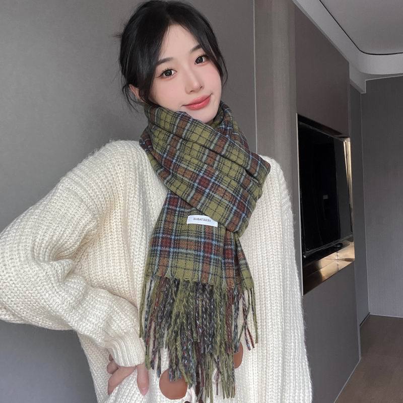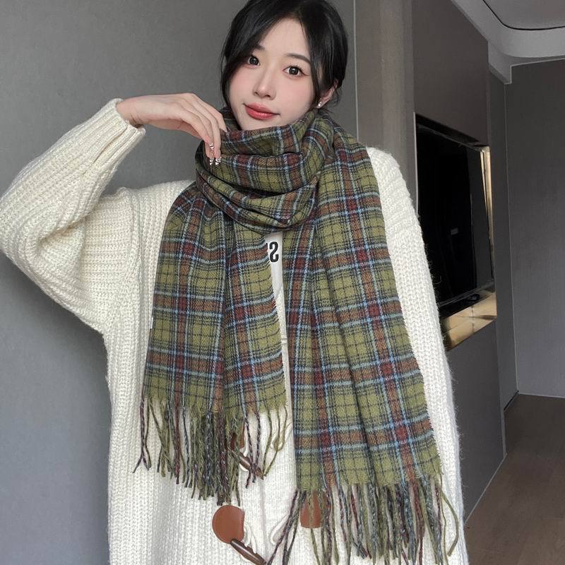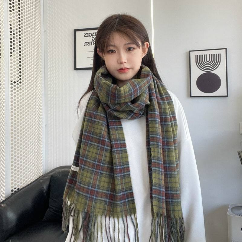 여성용 한국식 달콤한 녹색 격자 무늬 캐시미어 스카프 겨울 따뜻한 두꺼운 긴 술 격자 무늬 목도리