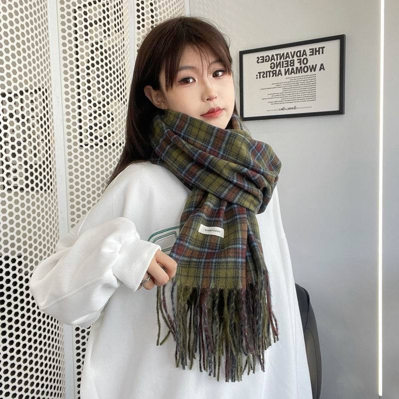 여성용 한국식 달콤한 녹색 격자 무늬 캐시미어 스카프 겨울 따뜻한 두꺼운 긴 술 격자 무늬 목도리스토어 가기