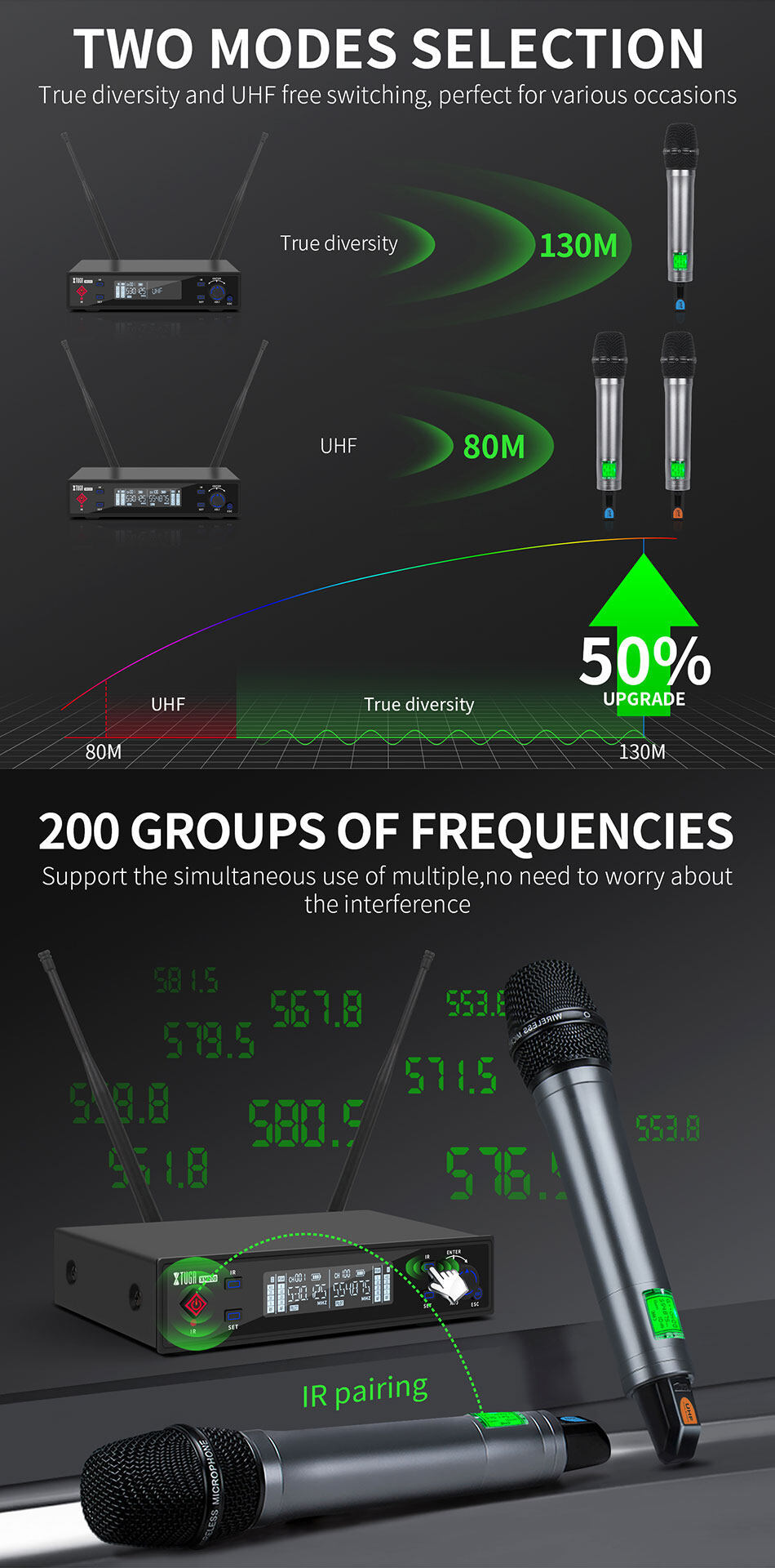 국경 간 드래그 두 듀얼 모드 U 세그먼트 듀얼 채널 전문 적외선 주파수 마이크 금속 핸드 헬드 마이크 도매 가격스토어 가기