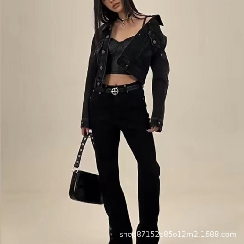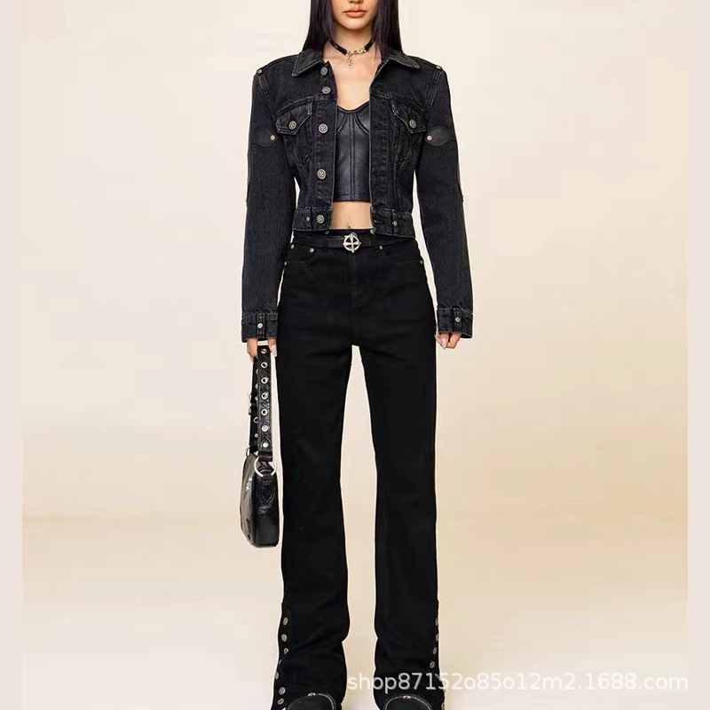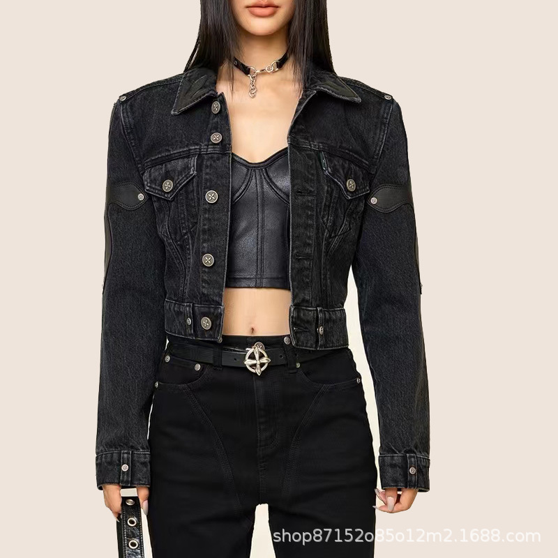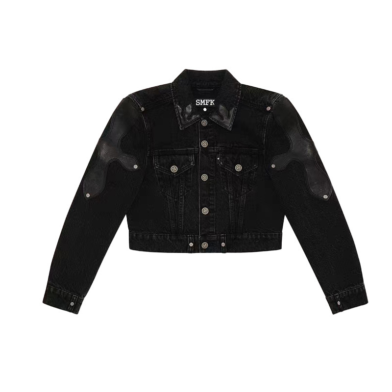 SMFK R 클래식 댄스 컴퍼니 데님 재킷 크로스 플라워 팔 바느질 세탁 여성용 슬림 핏 쇼트 블랙 재킷스토어 가기