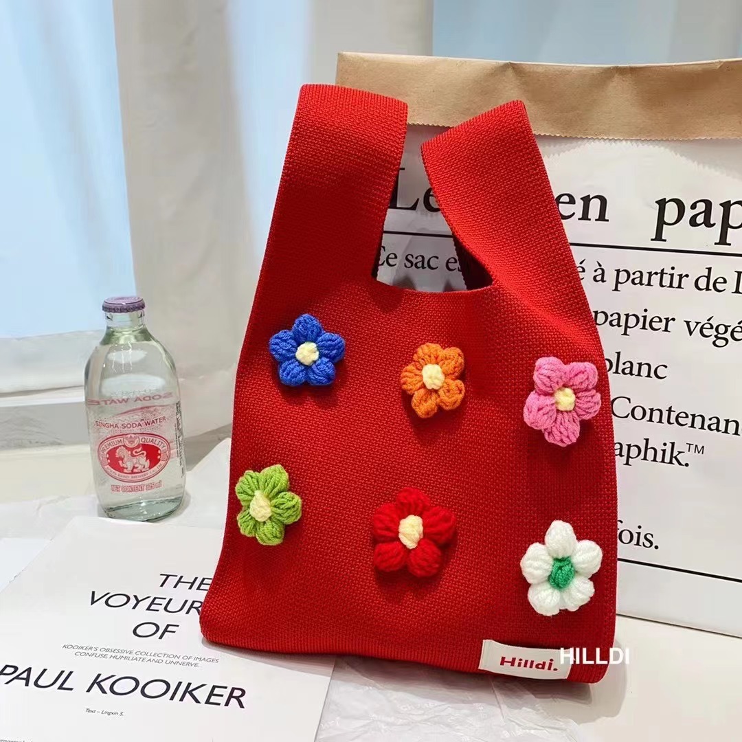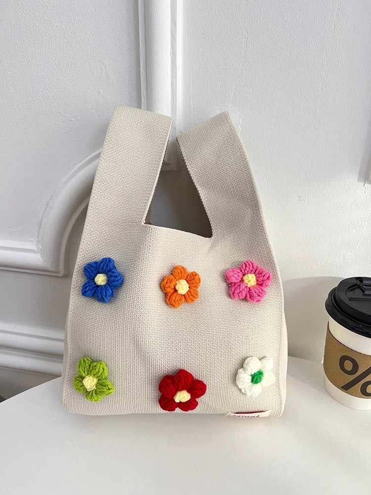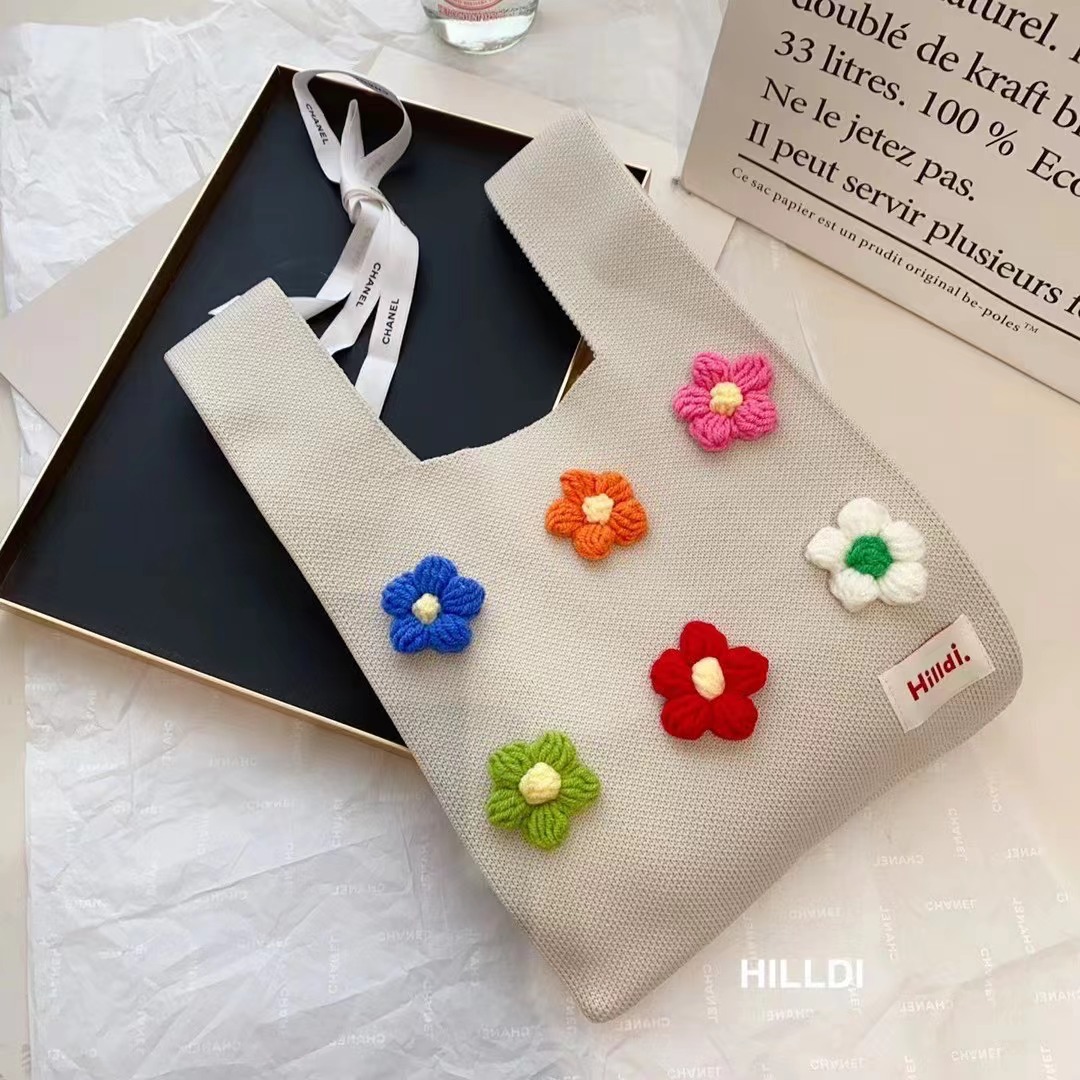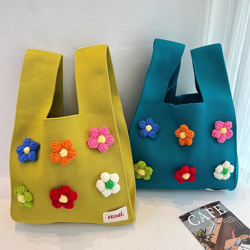 새로운 도파민 다채로운 수제 꽃 니트 토트 백 패션웨어 소녀의 양동이 점심 가방
