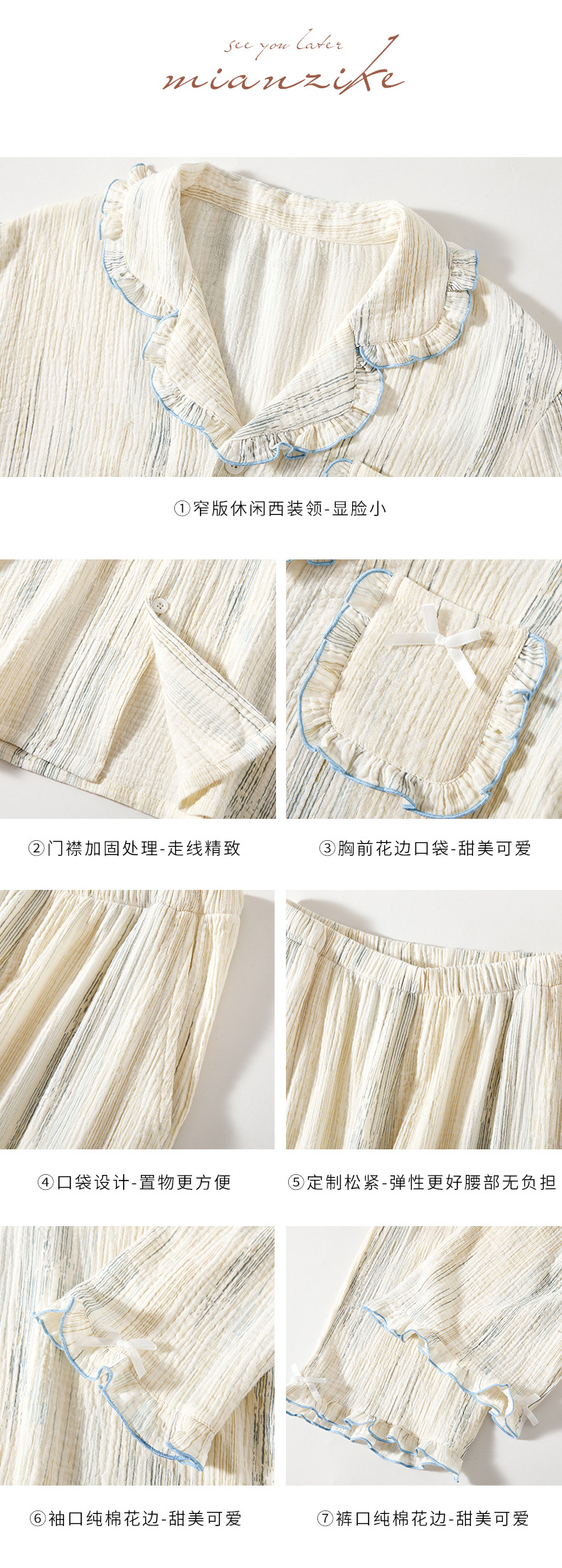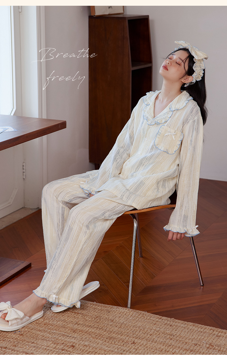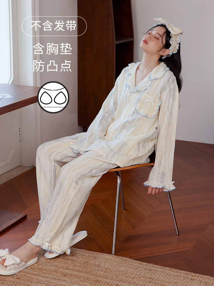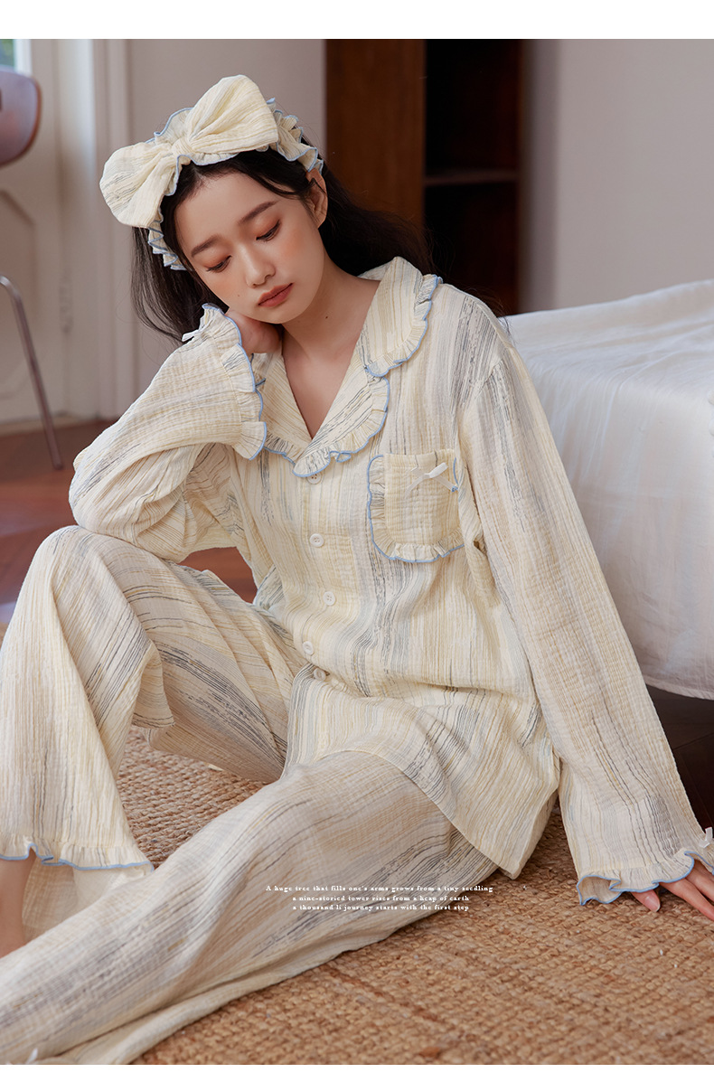 부드러운 피부 친화적 인 면 더블 레이어 면사 긴 소매 잠옷 여자의 달콤한 레이스 칼라 가을 면 가정 옷 세트스토어 가기