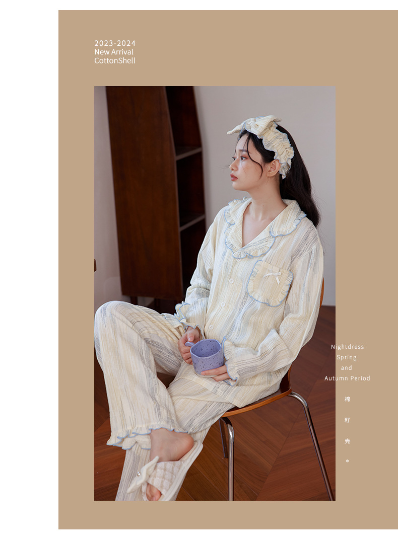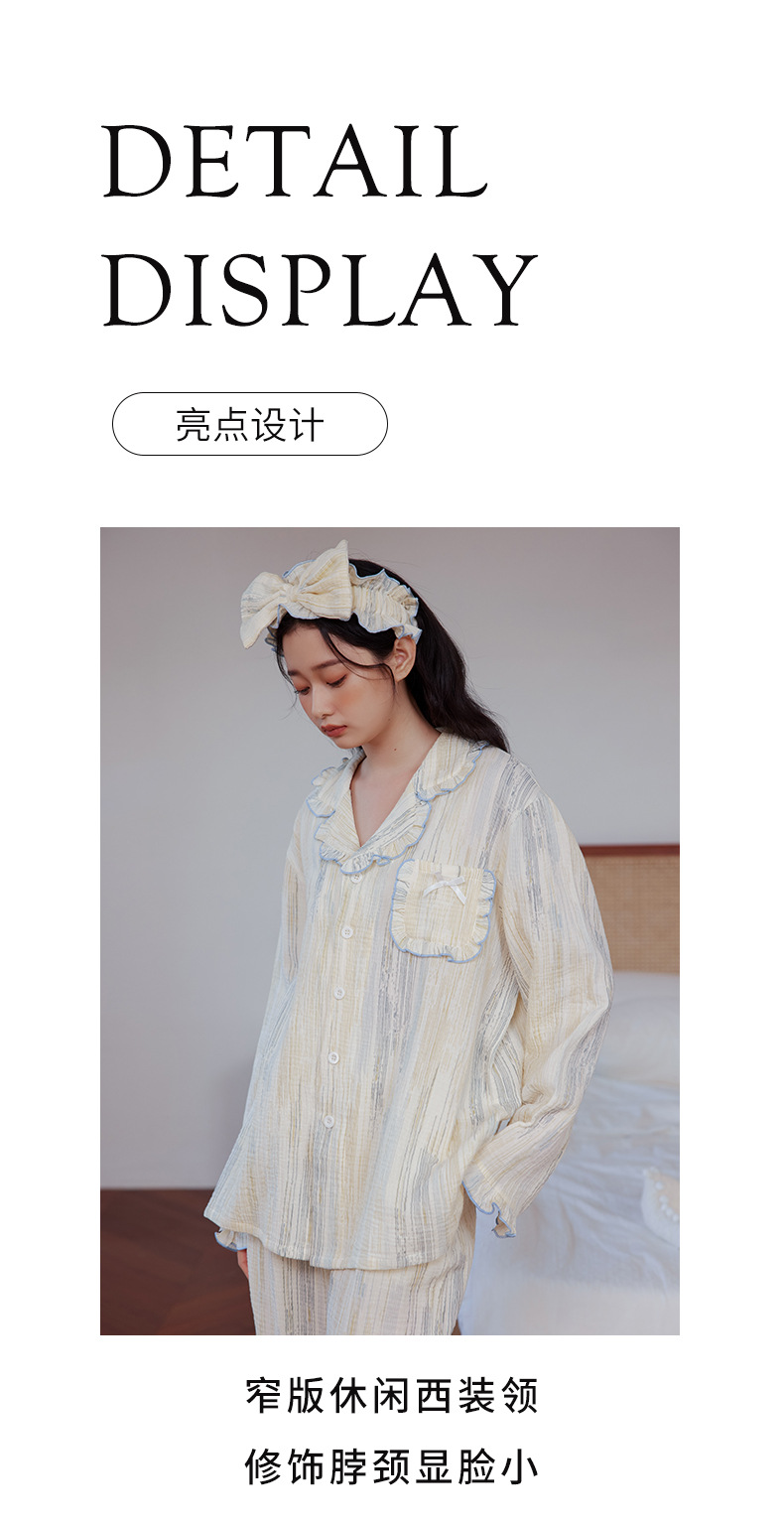 부드러운 피부 친화적 인 면 더블 레이어 면사 긴 소매 잠옷 여자의 달콤한 레이스 칼라 가을 면 가정 옷 세트