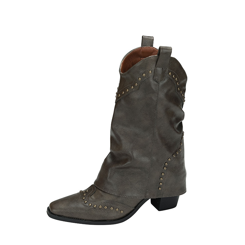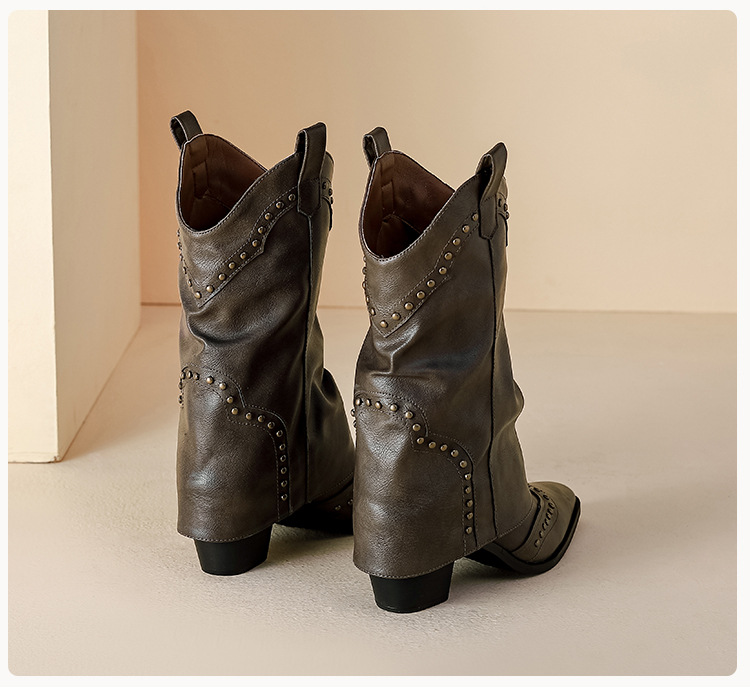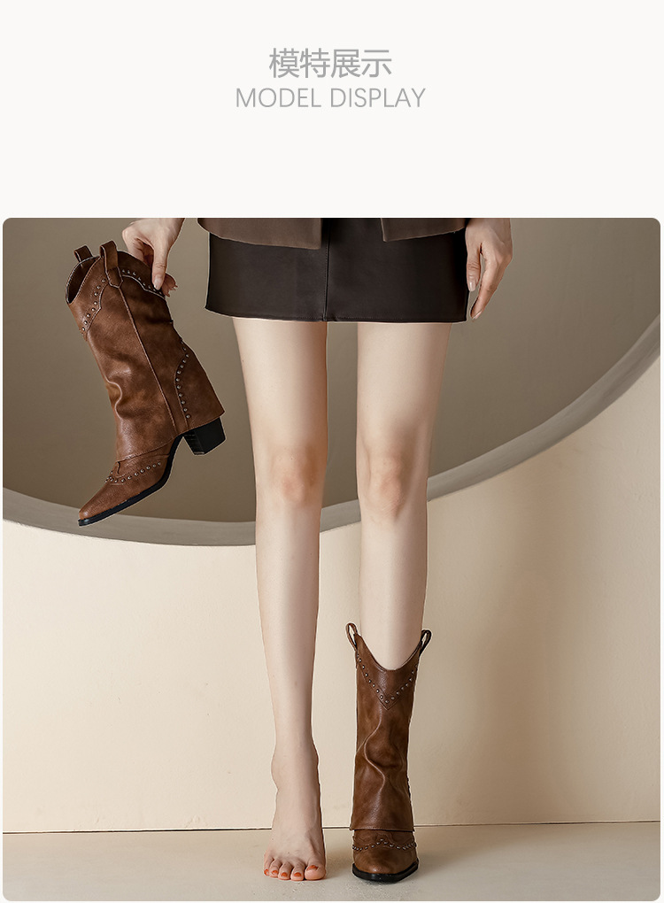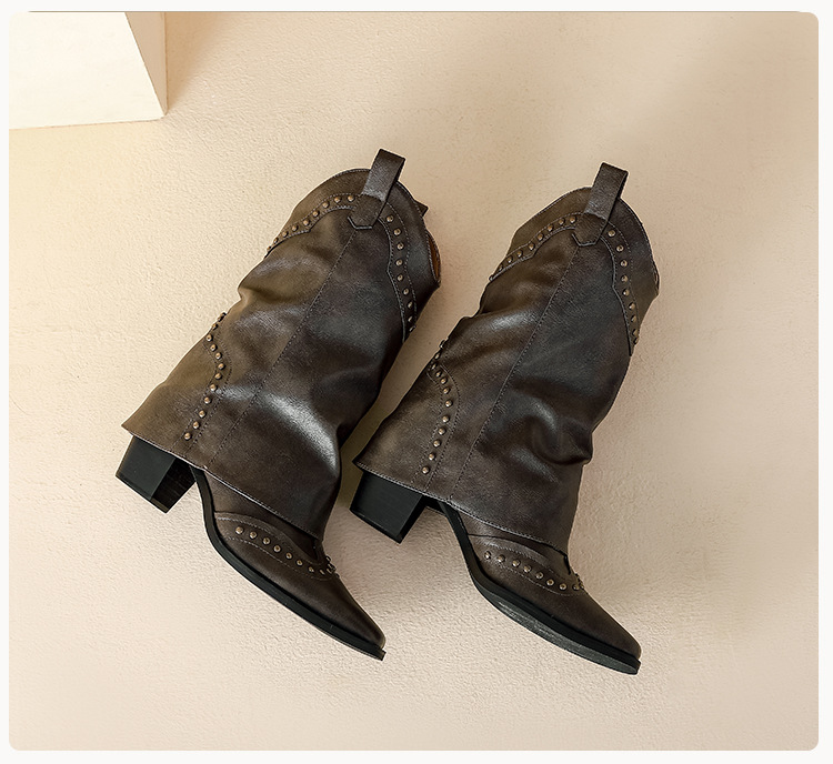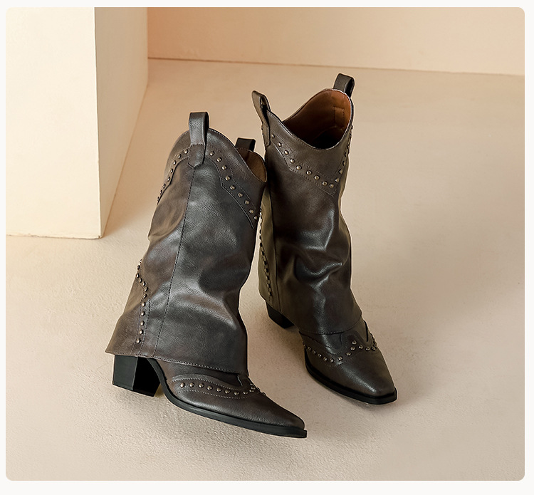 바지 부츠 레트로 뾰족한 머리 리벳 2023 새로운 스타일 부츠 여성용 하이힐 두꺼운 바닥 무릎 기사 부츠