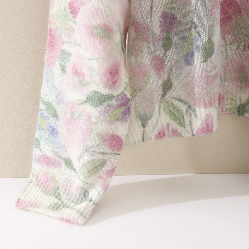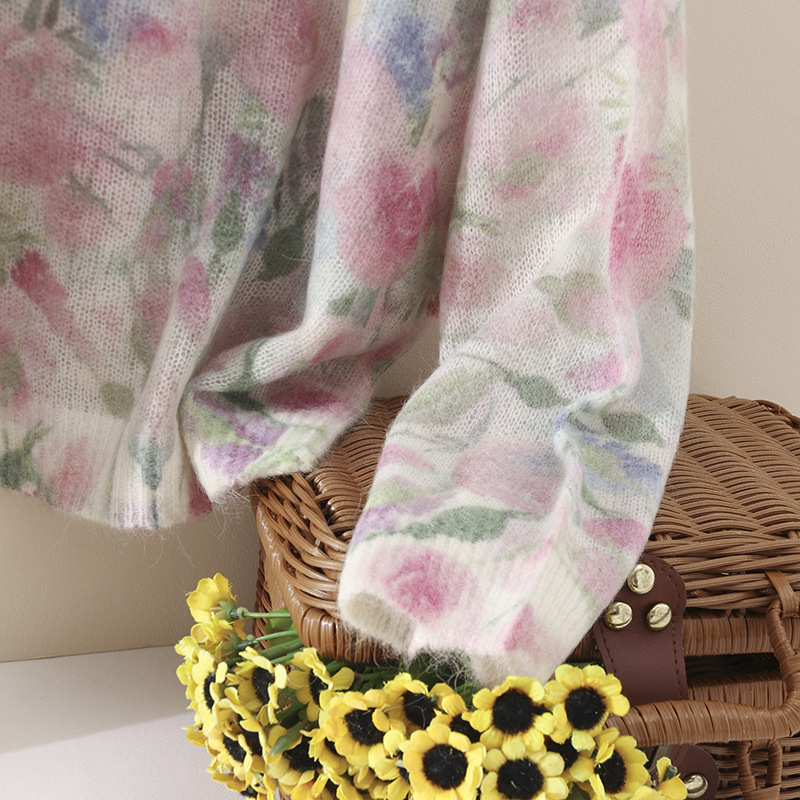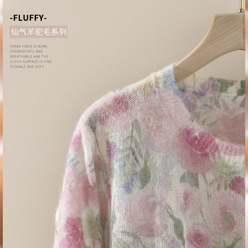 꽃요정 수채화 프린트 염색 롱헤어 알파카 울 스웨터 봄 신상 여성용 울 라운드넥 풀오버 스웨터