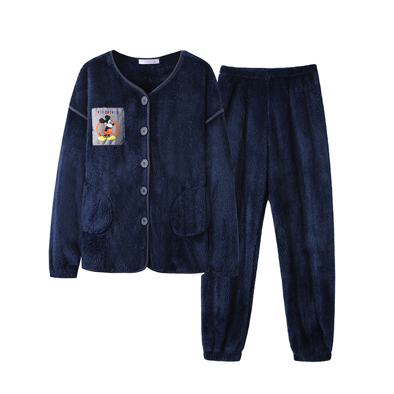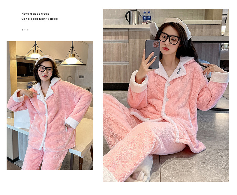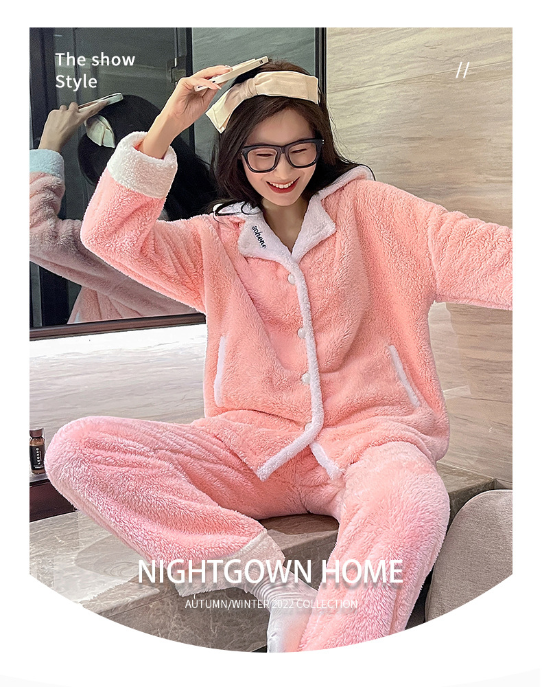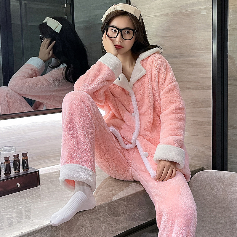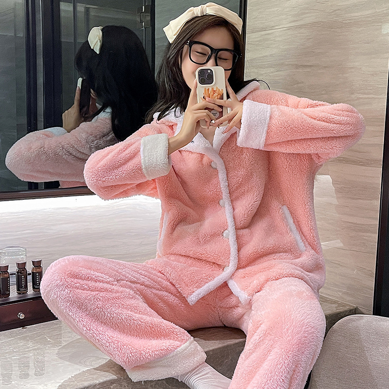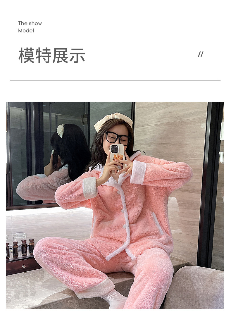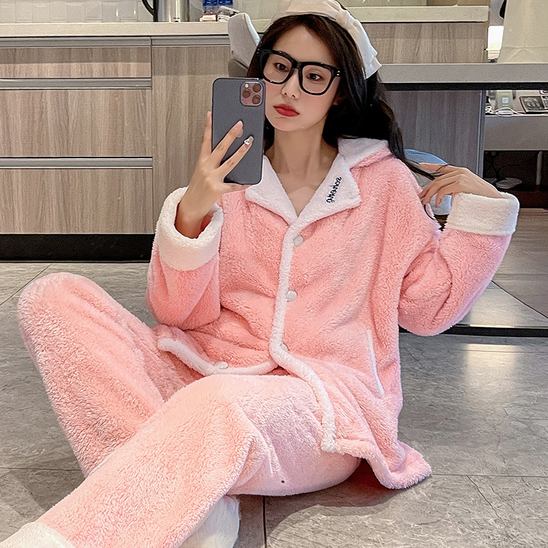 새로운 플란넬 잠옷 여성의 긴 소매 기모 두꺼운 만화 산호 양털을 착용 할 수 있습니다 배달을 대신하여