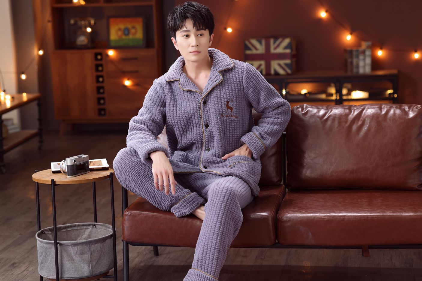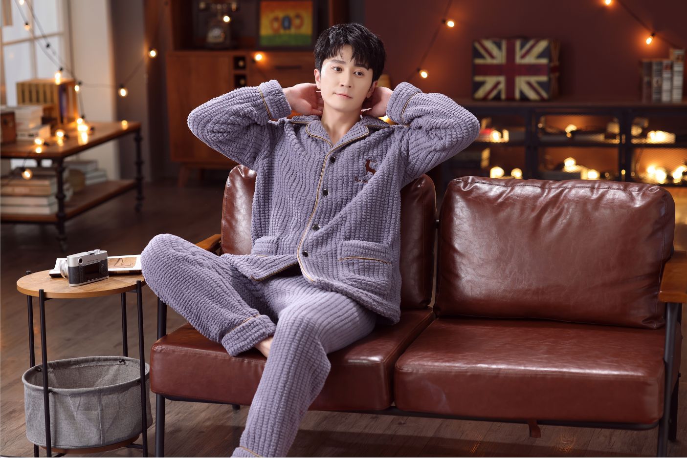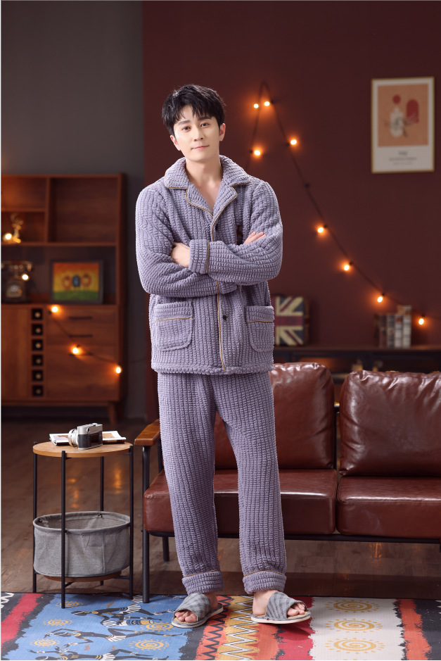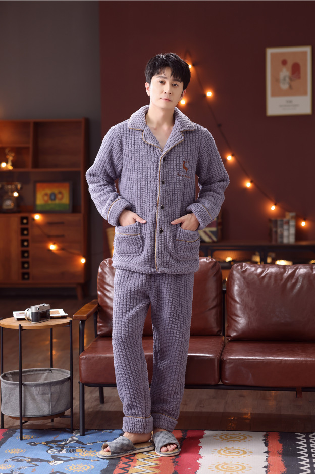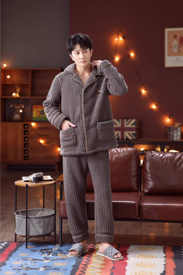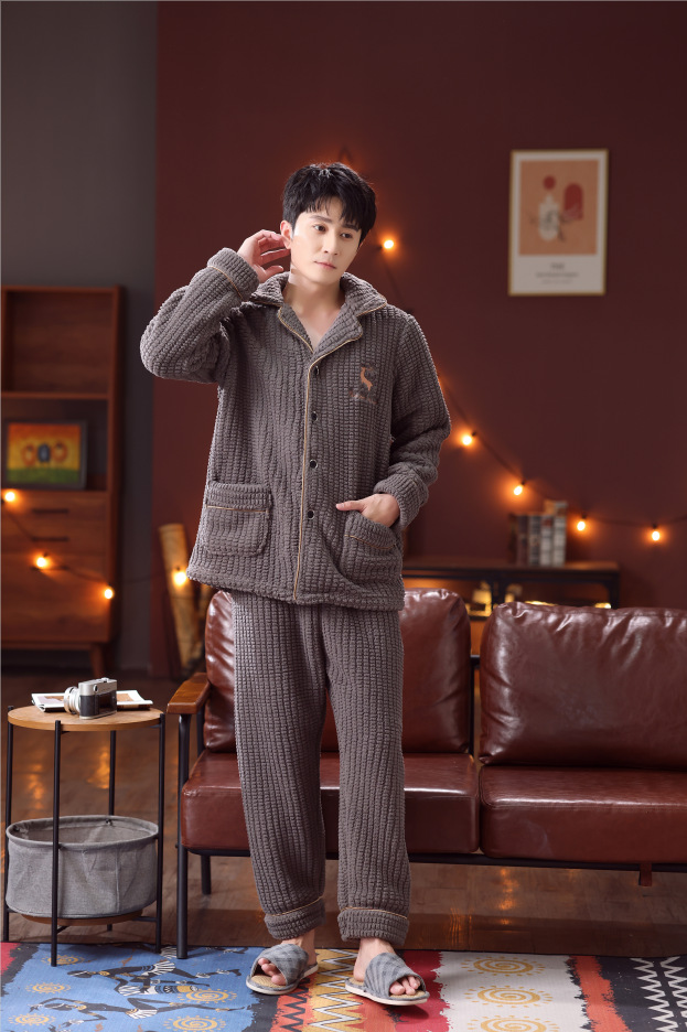 플란넬 잠옷 남자의 가을과 겨울 새로운 옷깃 단추 두꺼운 산호 양털 세트스토어 가기