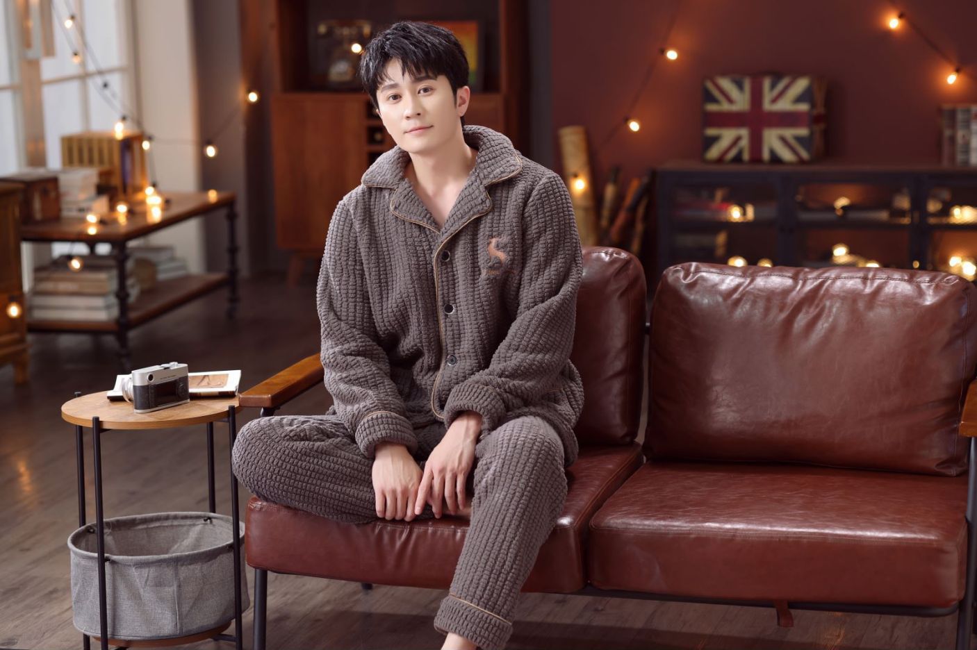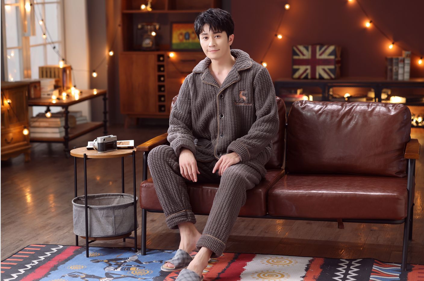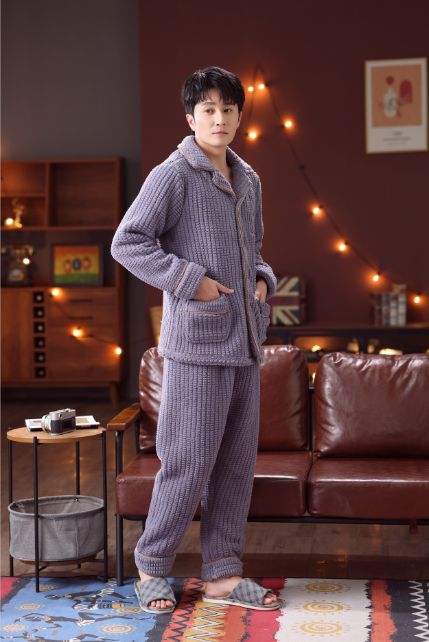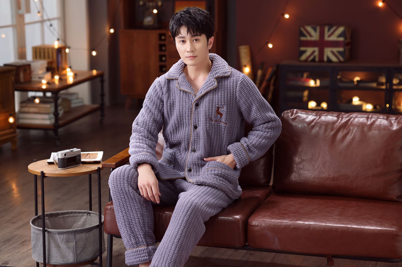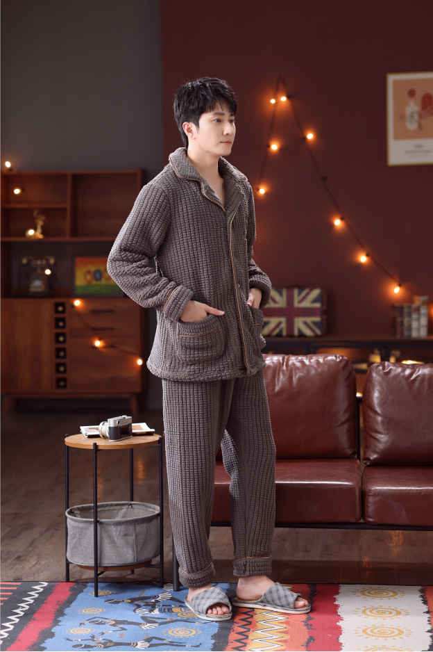 플란넬 잠옷 남자의 가을과 겨울 새로운 옷깃 단추 두꺼운 산호 양털 세트스토어 가기